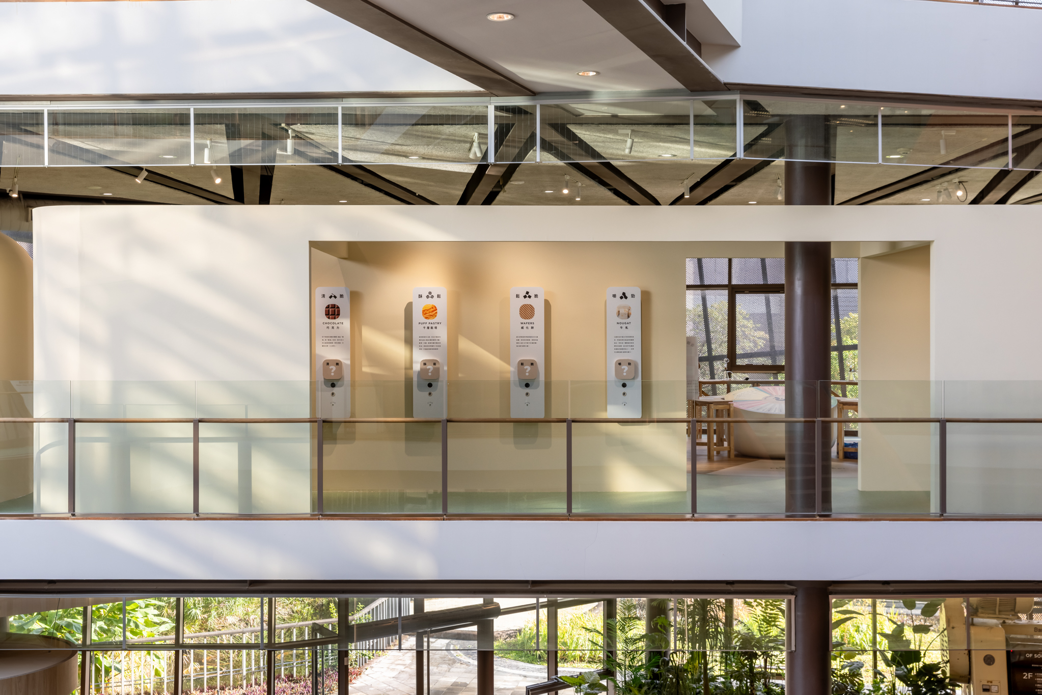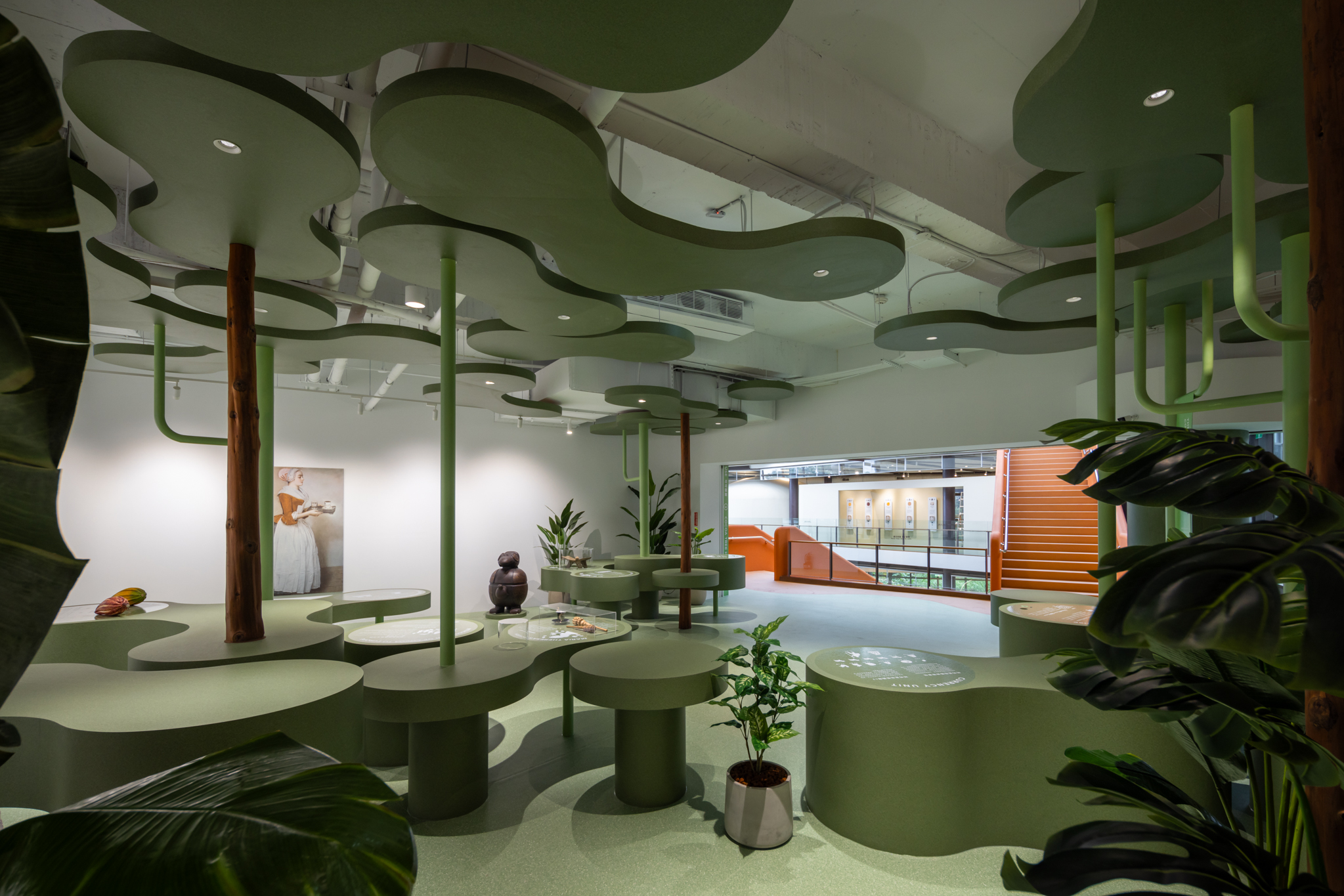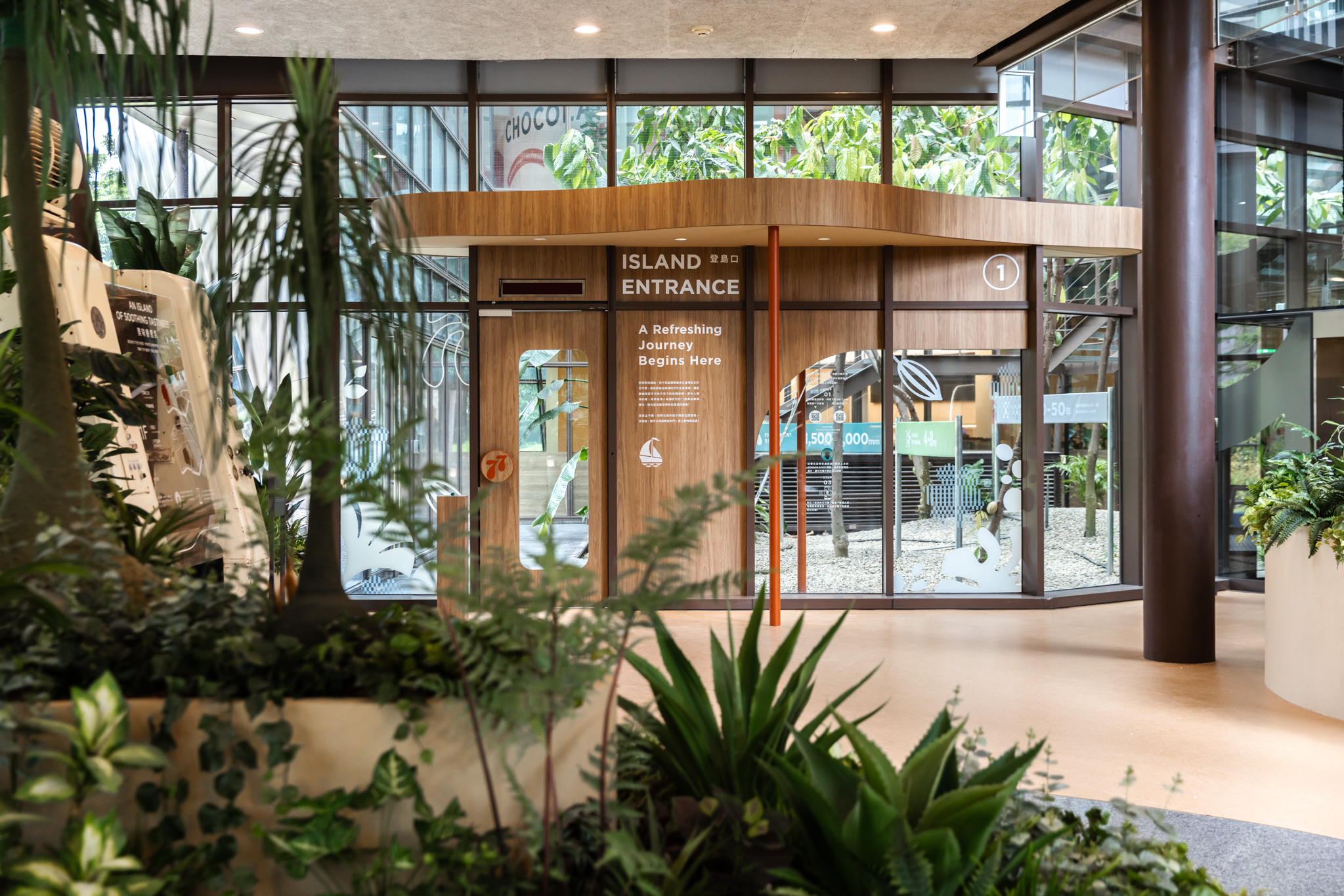 挑高的大尺度空間構築為一座半戶外感的「可可森林」,採用溫室結構形式,保留原始可可樹與植栽生態系統。空間透過環形爬升的樓梯動線,引導觀者在體感溫度、視覺與嗅覺的多重刺激下,沉浸於熱帶雨林氛圍之中,親眼見證可可果實的自然生長樣貌,並嵌入知識性展示,呈現可可與環境之間的緊密連結。