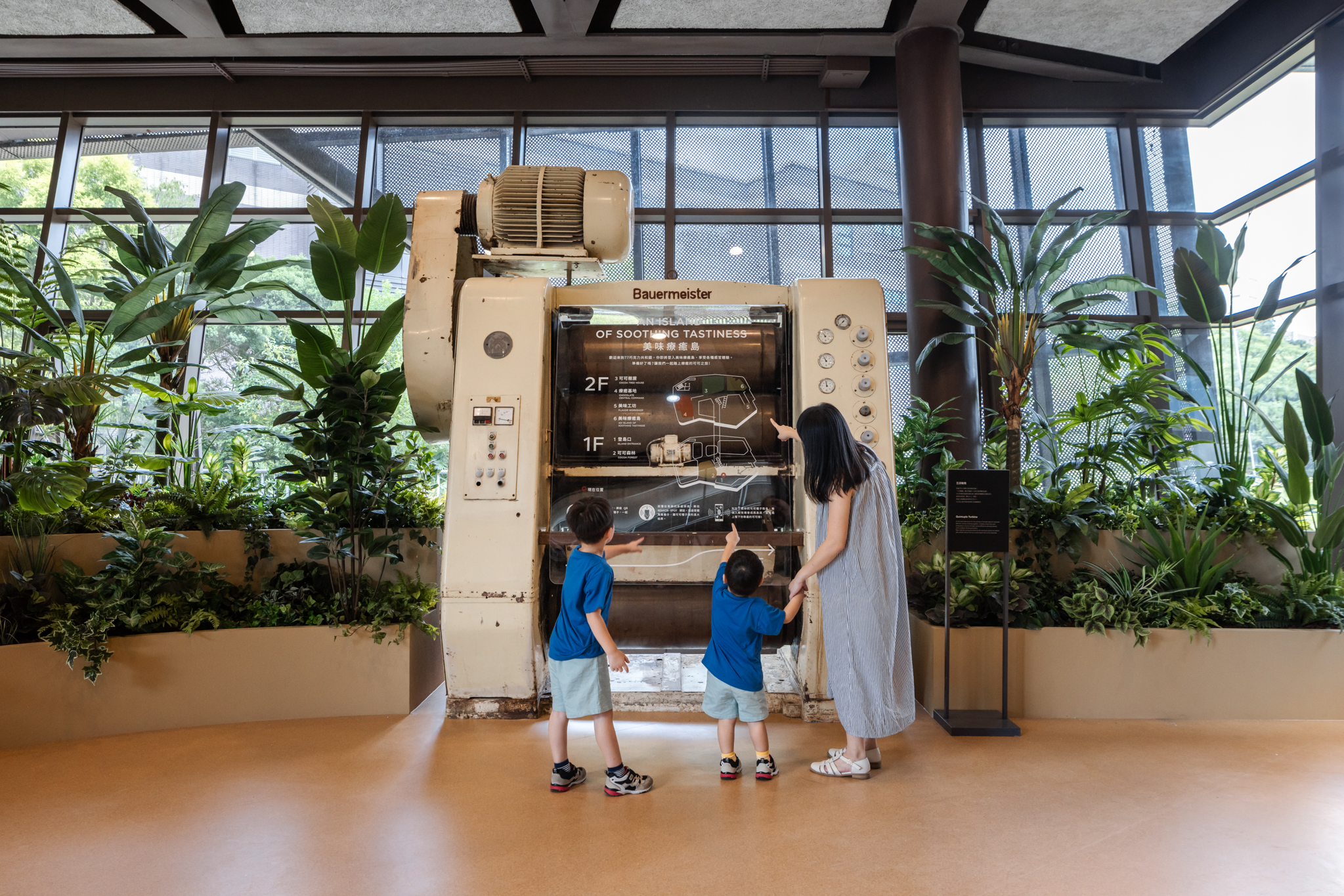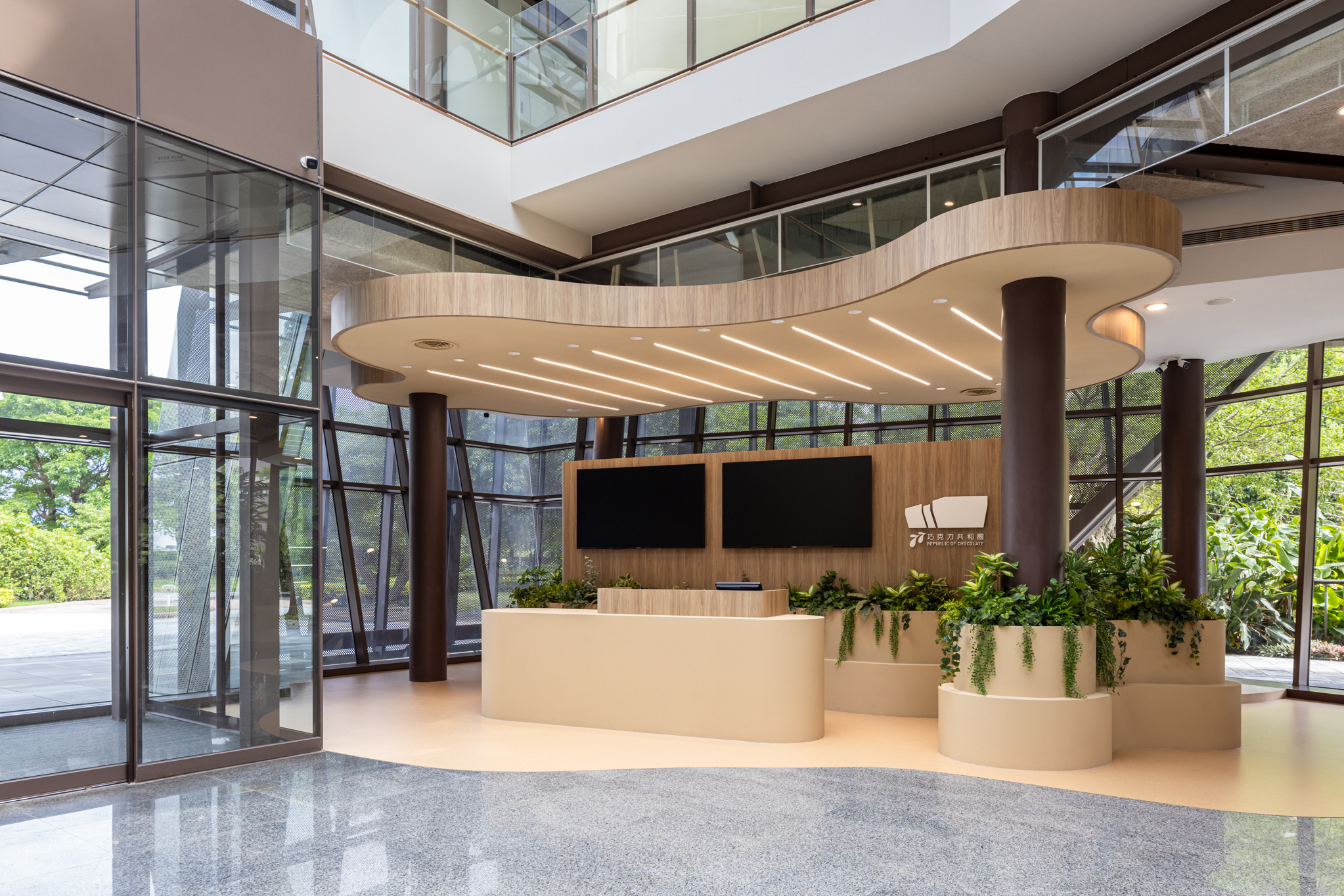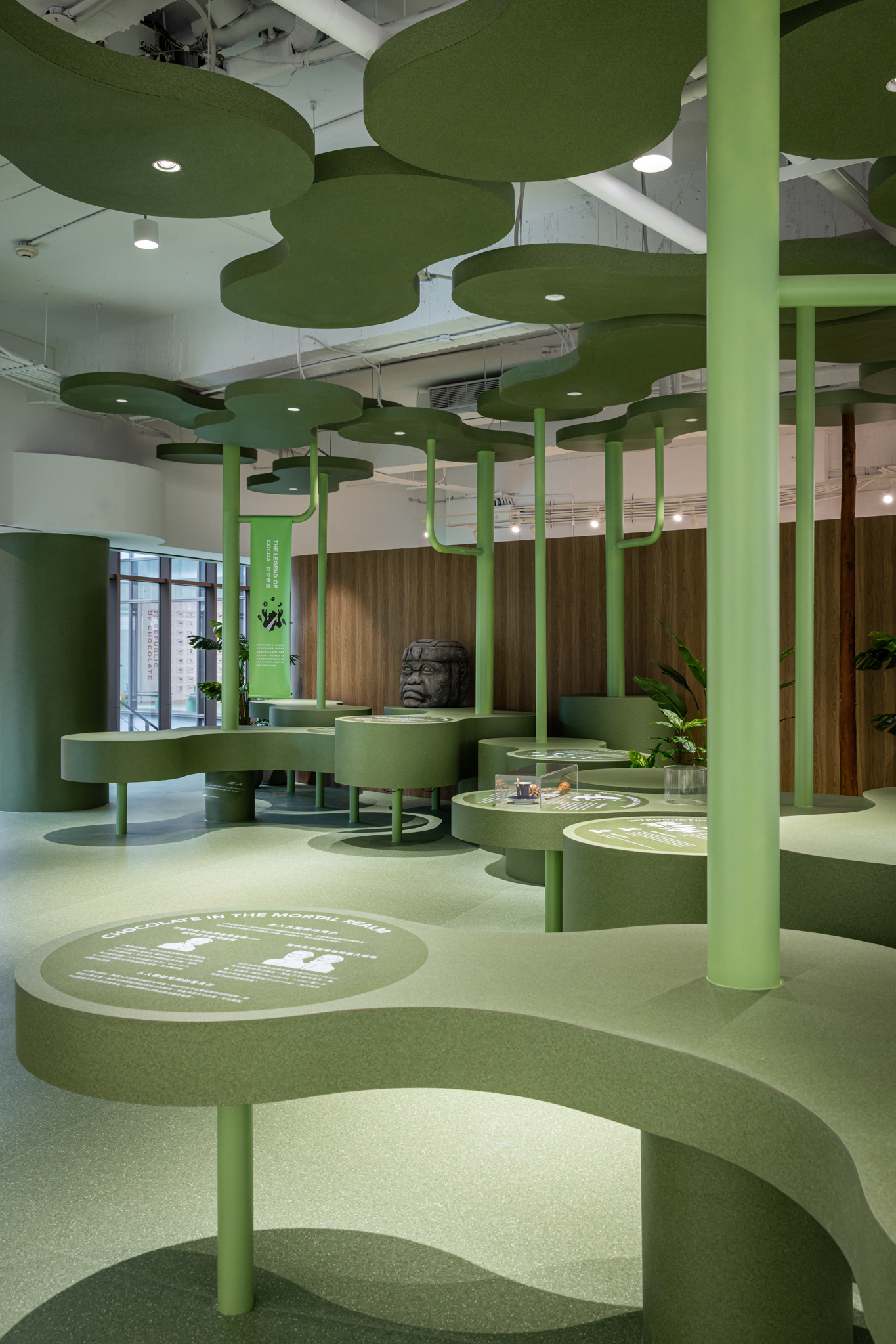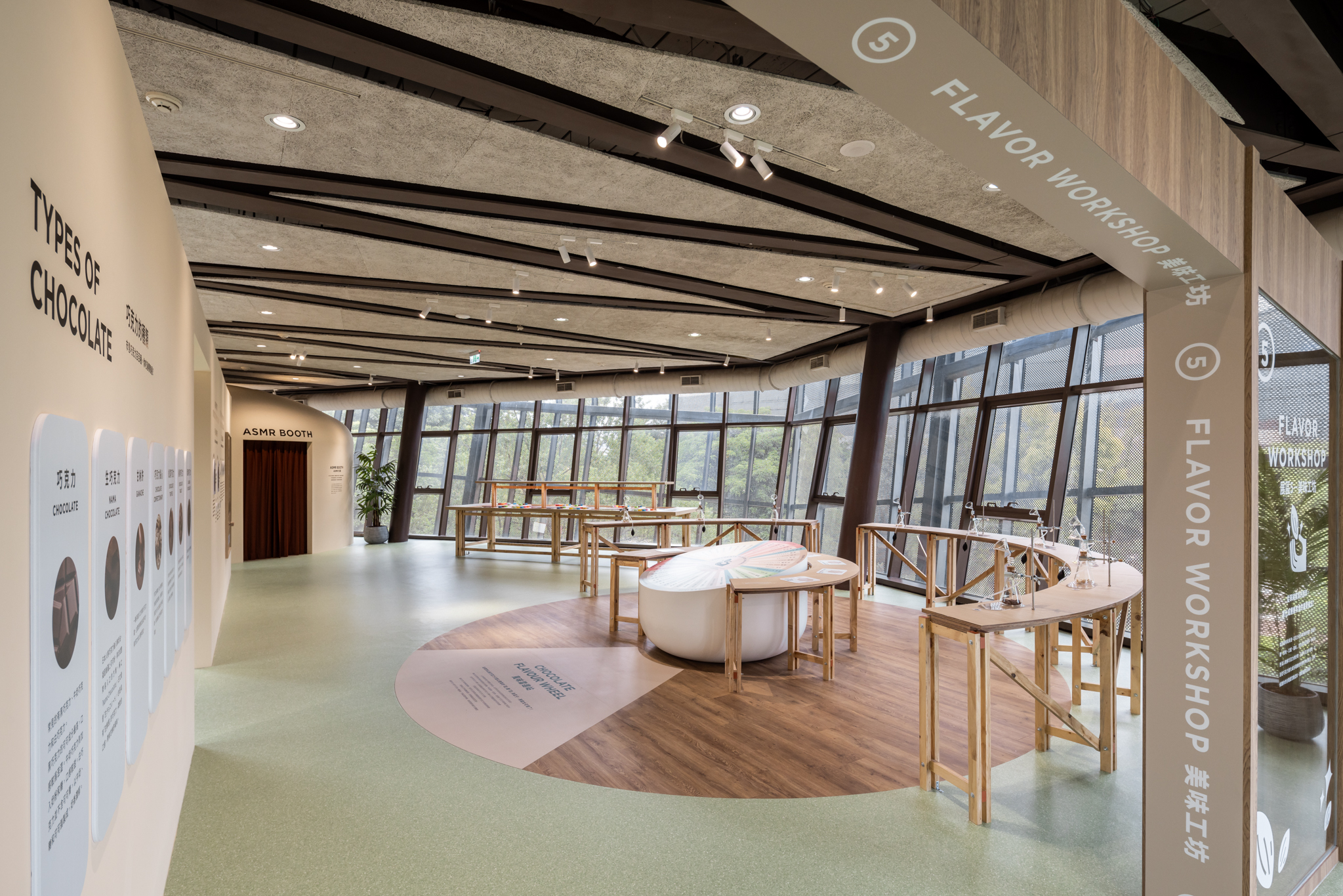 挑高的大尺度空間構築為一座半戶外感的「可可森林」,採用溫室結構形式,保留原始可可樹與植栽生態系統。空間透過環形爬升的樓梯動線,引導觀者在體感溫度、視覺與嗅覺的多重刺激下,沉浸於熱帶雨林氛圍之中,親眼見證可可果實的自然生長樣貌,並嵌入知識性展示,呈現可可與環境之間的緊密連結。