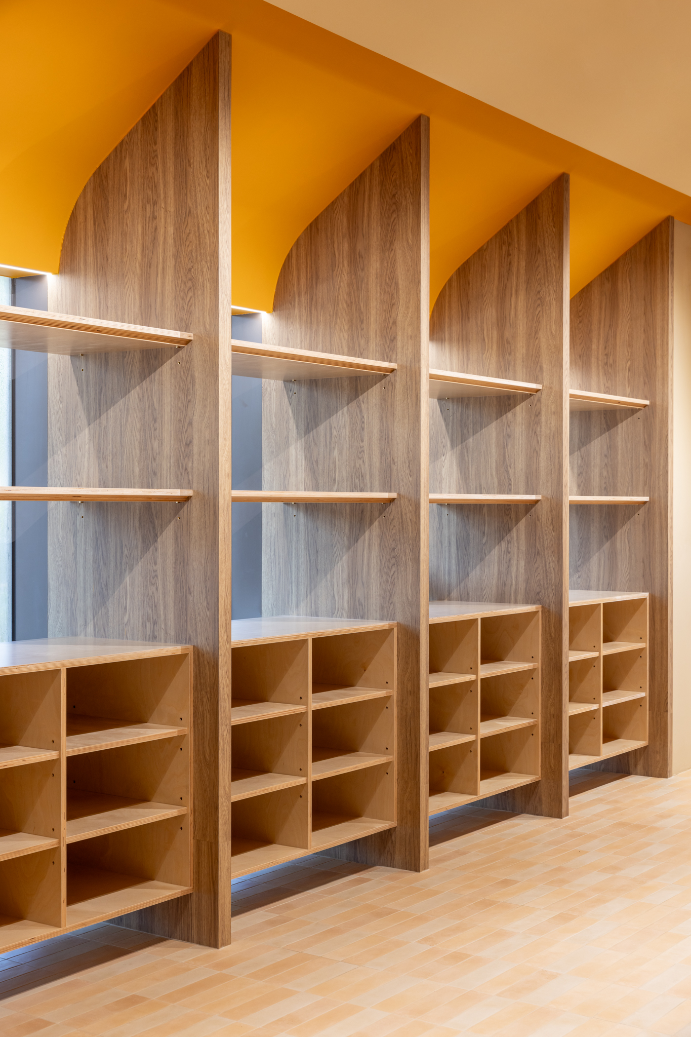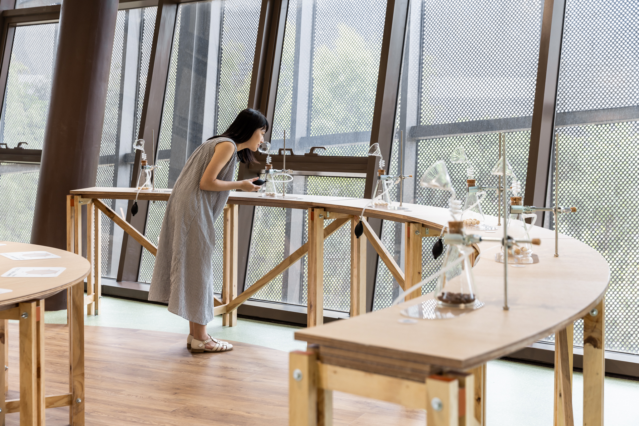 一座開放型的大尺度體驗空間,設計強調穿透感與自然引光,運用天花板造型語彙與大片落地窗呼應日照變化,引導光線遊走於展檯與牆面之間。展示平台採環狀展檯與長型互動桌並置,展中廳則設置如洞穴般的沉浸式展區,以「多維感官」為核心載體,融合聲音、氣味、視覺與知識文本,形塑一處「可探索的感官知識場域」。