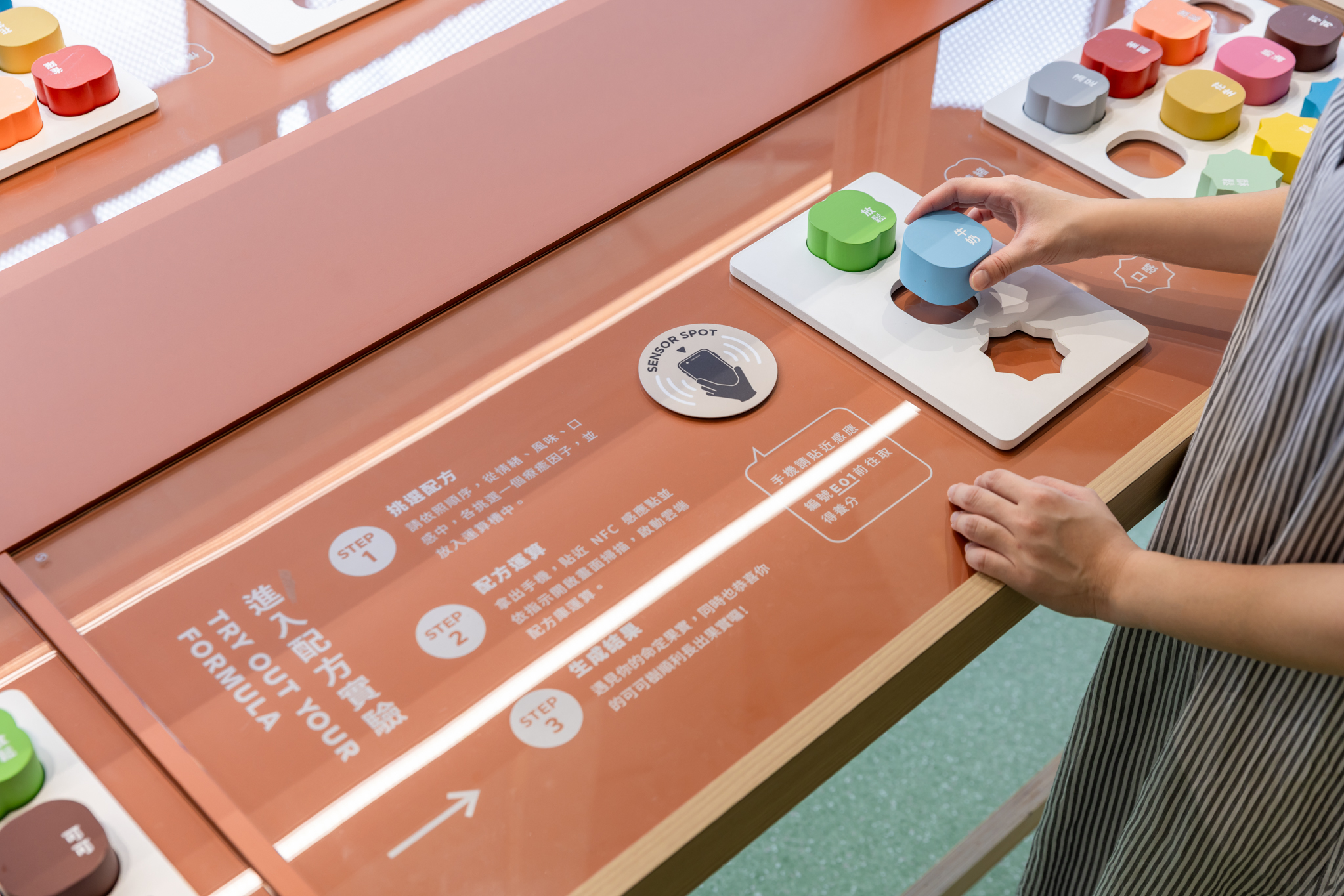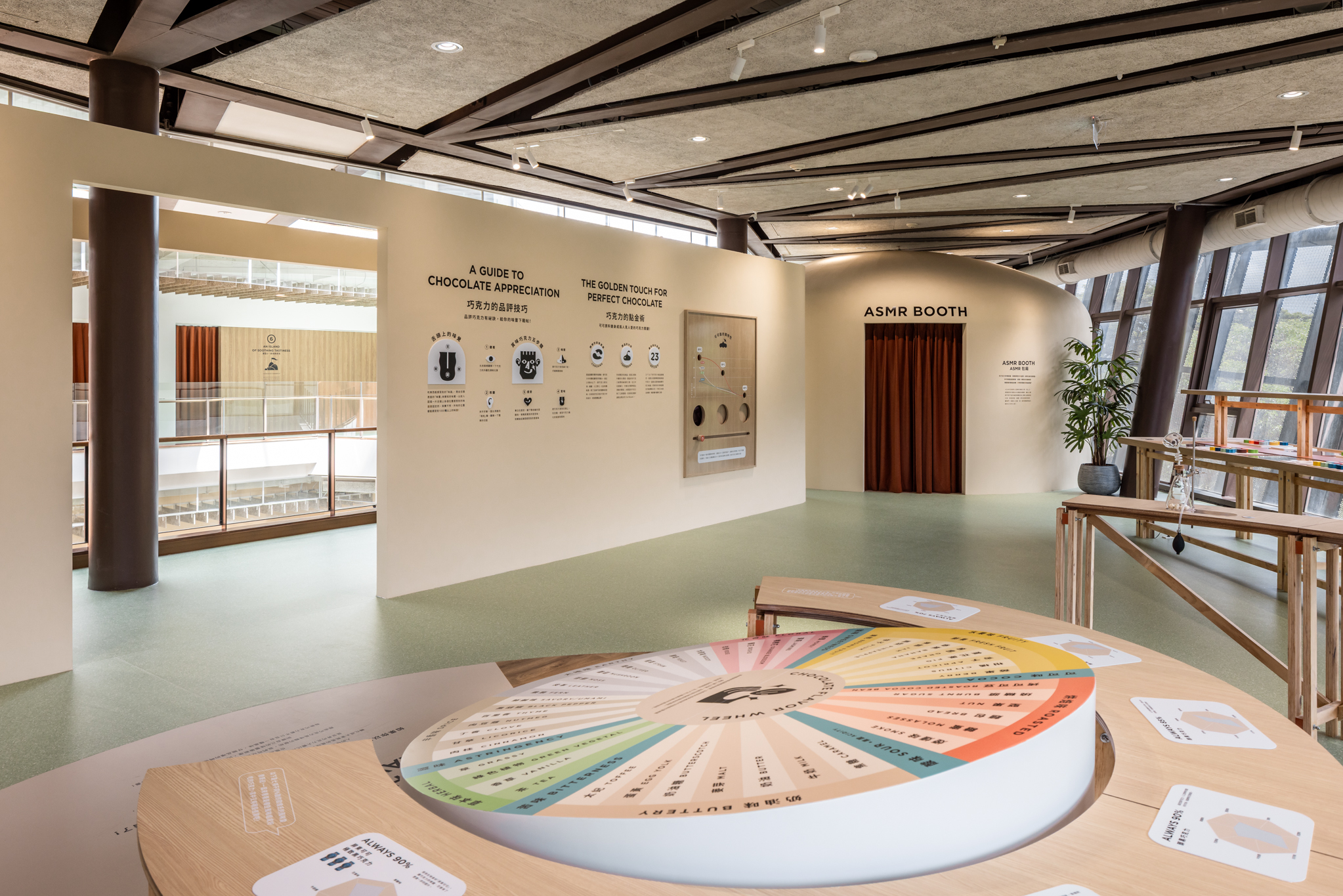 「風味雷達站」以巧克力風味輪、聞香瓶與風味雷達圖相互對話,建立觀者對風味辨識的感官地圖;而「口感聲音亭」則藉由音效再現咀嚼質地,翻轉觀者對味覺的單向認知與咀嚼感受。展覽最後引導至「配方研究室」,於積木形式的長桌上組裝專屬療癒方程式,結合數位介面紀錄個人風味偏好,作為後續展區體驗的通關憑證。