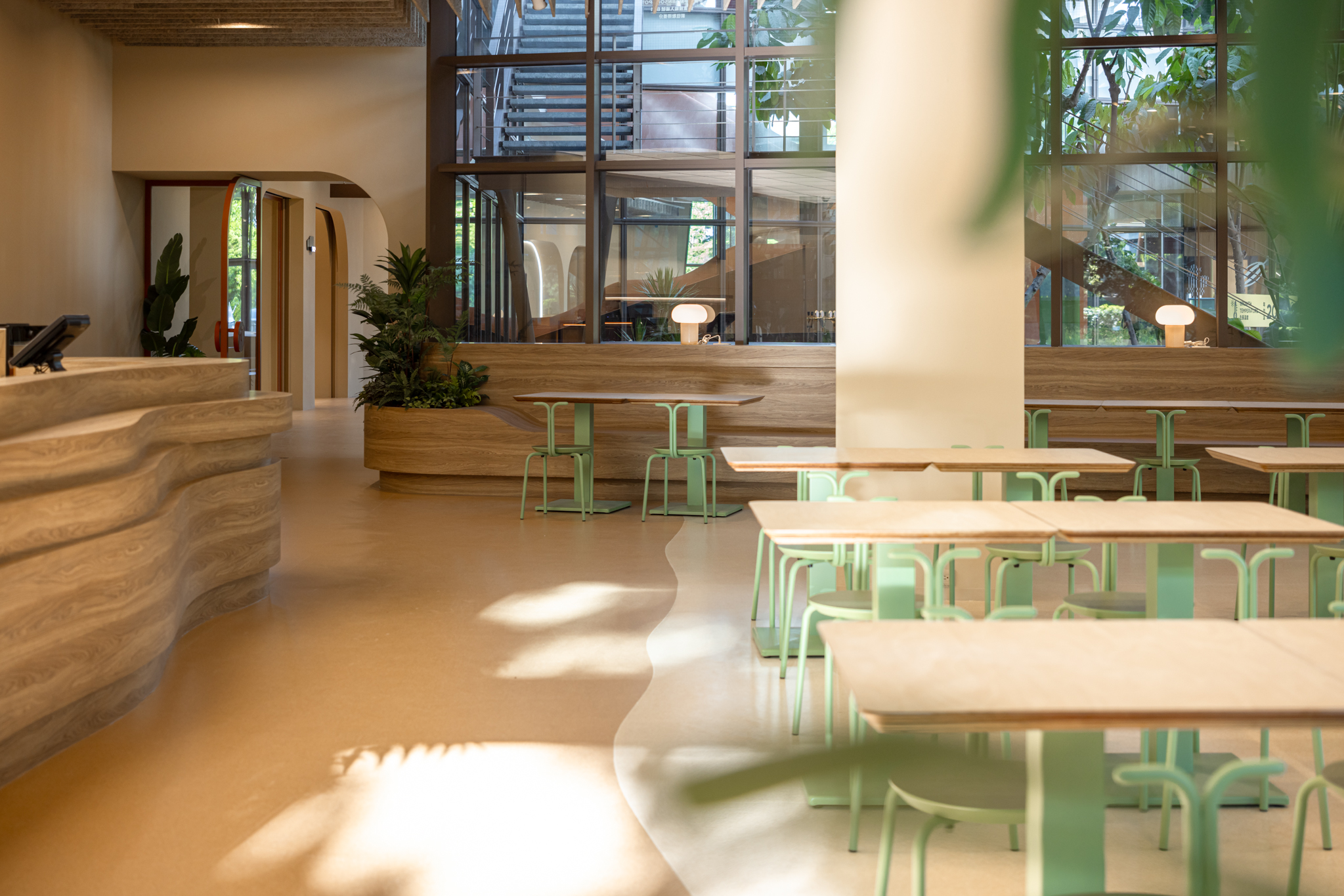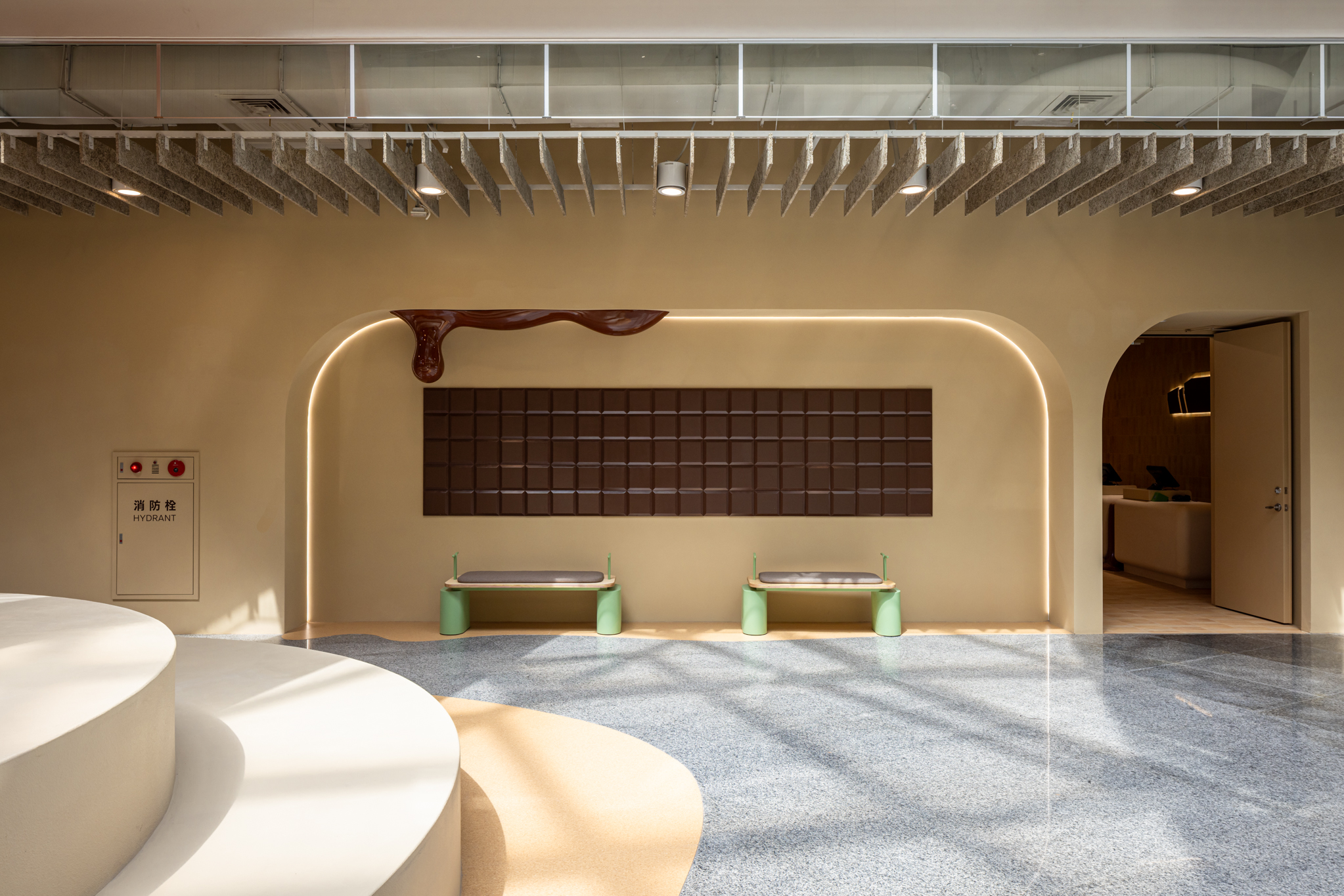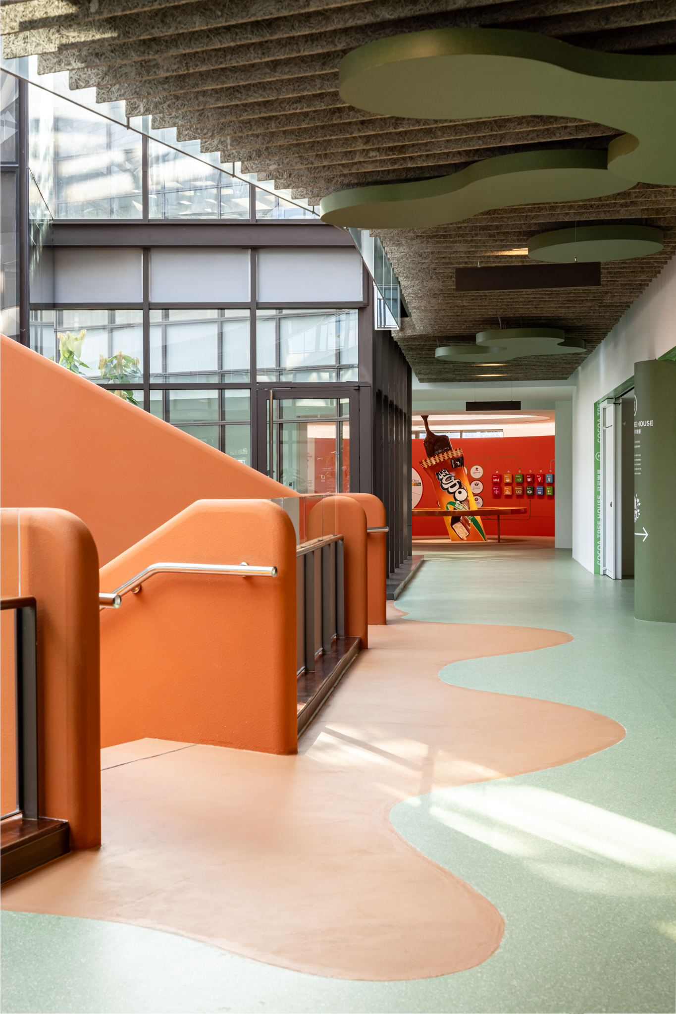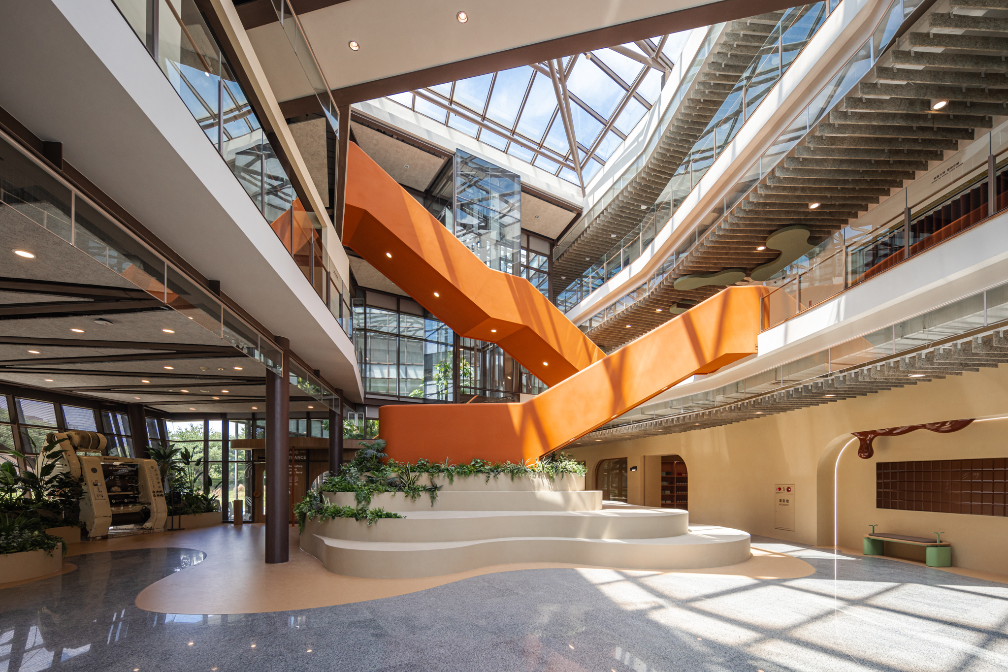 貫穿整體的巨型樓梯,延伸梯座的結構範圍,將巧克力漿緩緩流下的意象融合休憩與舞台機能,錨定成為空間中的視覺重點,樓梯以圓潤柔和的造型與經過精算的動線設計,串聯上下樓層與各功能區塊,強化場域之間的流動性與敘事延續性。整體空間基調以米色、沙色、咖啡色等大地色系構築出溫潤自然的基礎語境,輔以綠植點綴生機,呼應品牌所欲傳遞的「療癒」精神。象徵性的橘色則作為空間的情緒色彩,用於家具、軟裝與平面設計,提升整體視覺層次與趣味感。