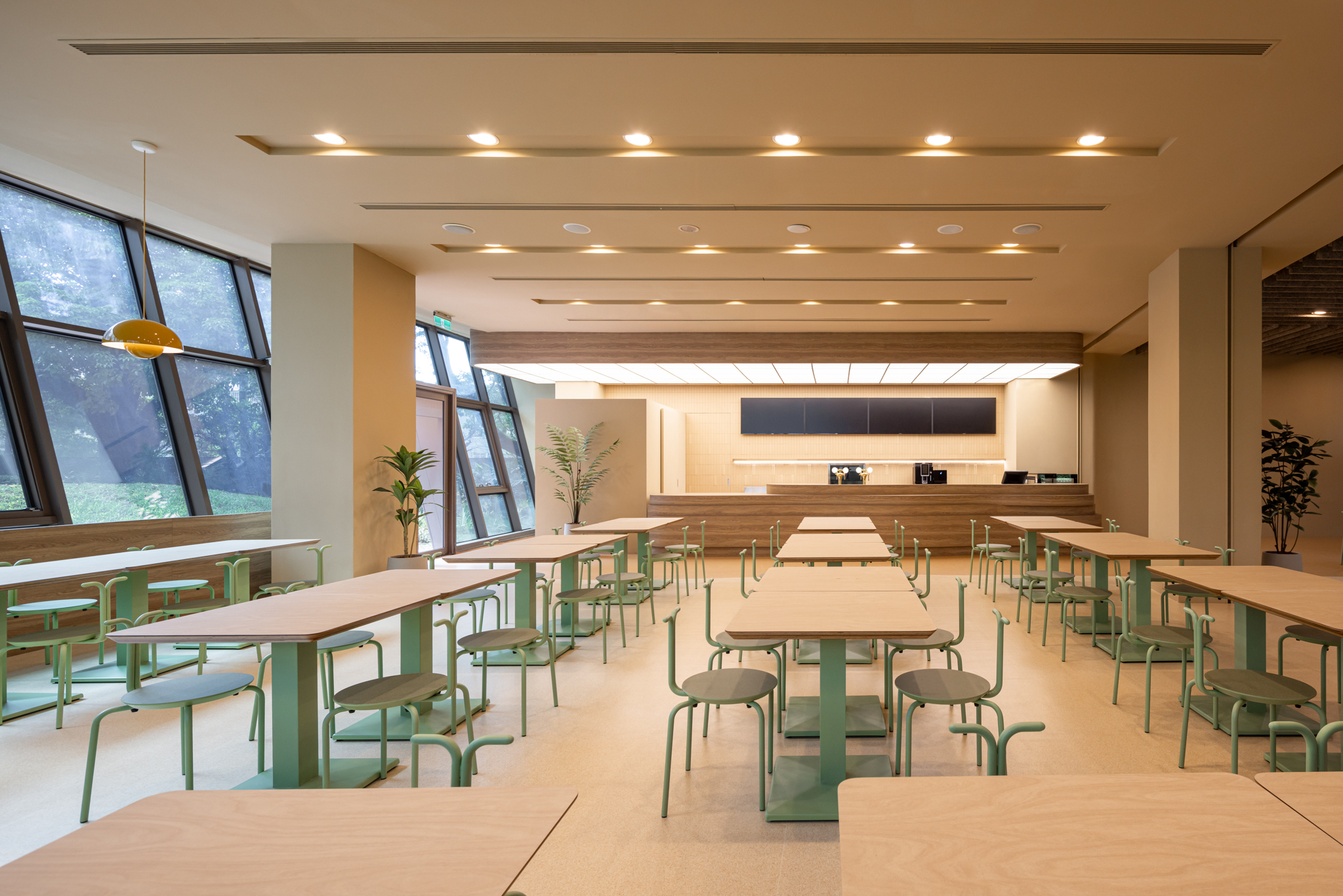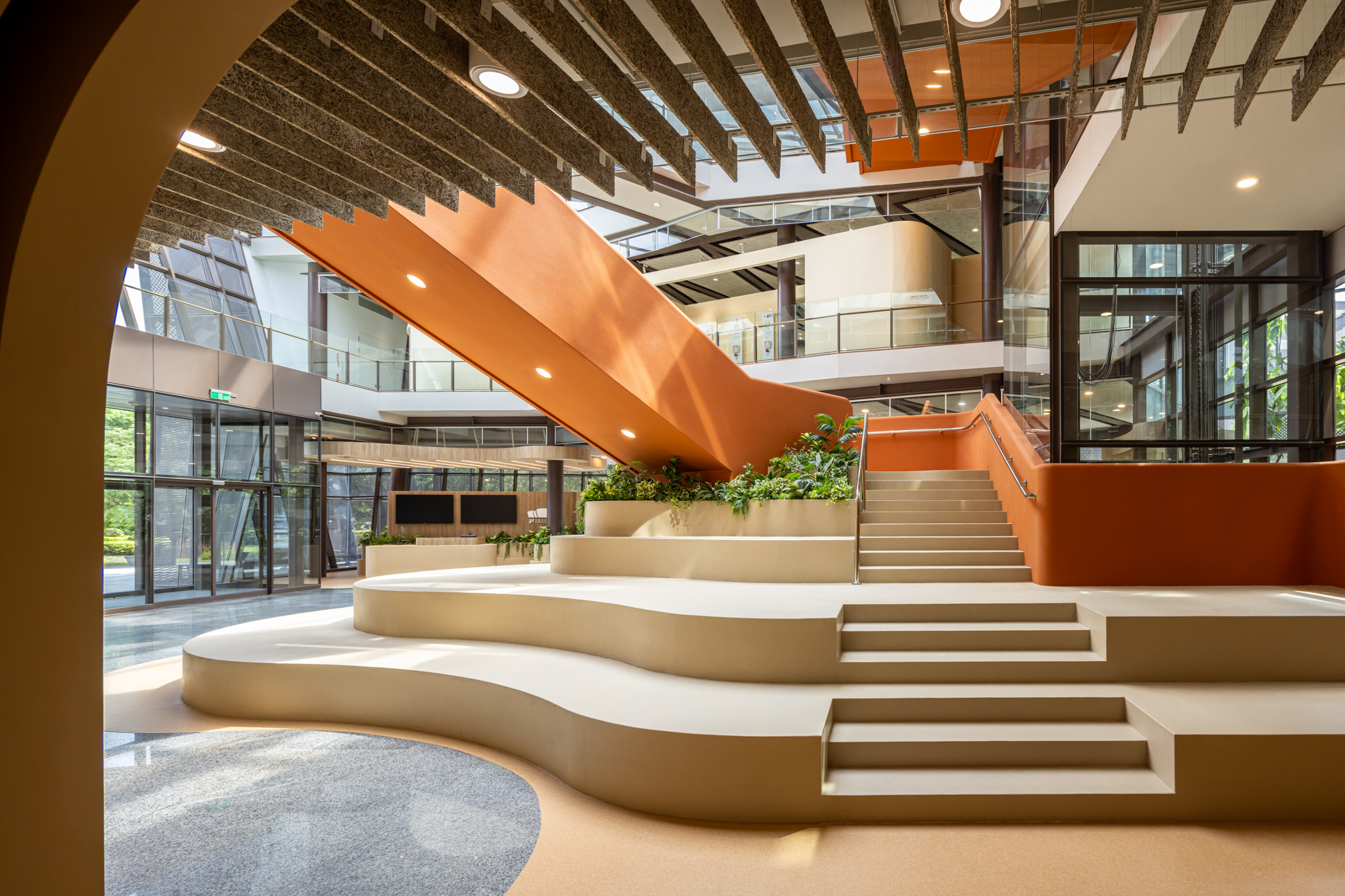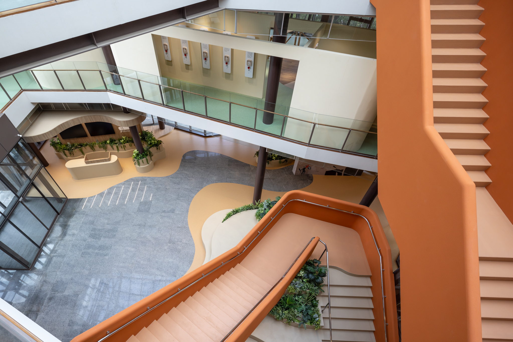 貫穿整體的巨型樓梯,延伸梯座的結構範圍,將巧克力漿緩緩流下的意象融合休憩與舞台機能,錨定成為空間中的視覺重點,樓梯以圓潤柔和的造型與經過精算的動線設計,串聯上下樓層與各功能區塊,強化場域之間的流動性與敘事延續性。整體空間基調以米色、沙色、咖啡色等大地色系構築出溫潤自然的基礎語境,輔以綠植點綴生機,呼應品牌所欲傳遞的「療癒」精神。象徵性的橘色則作為空間的情緒色彩,用於家具、軟裝與平面設計,提升整體視覺層次與趣味感。