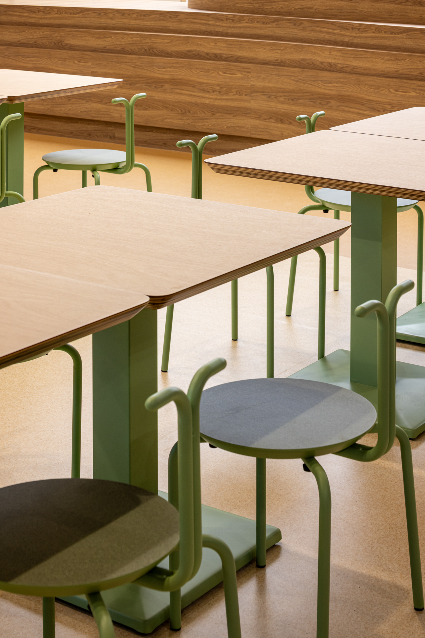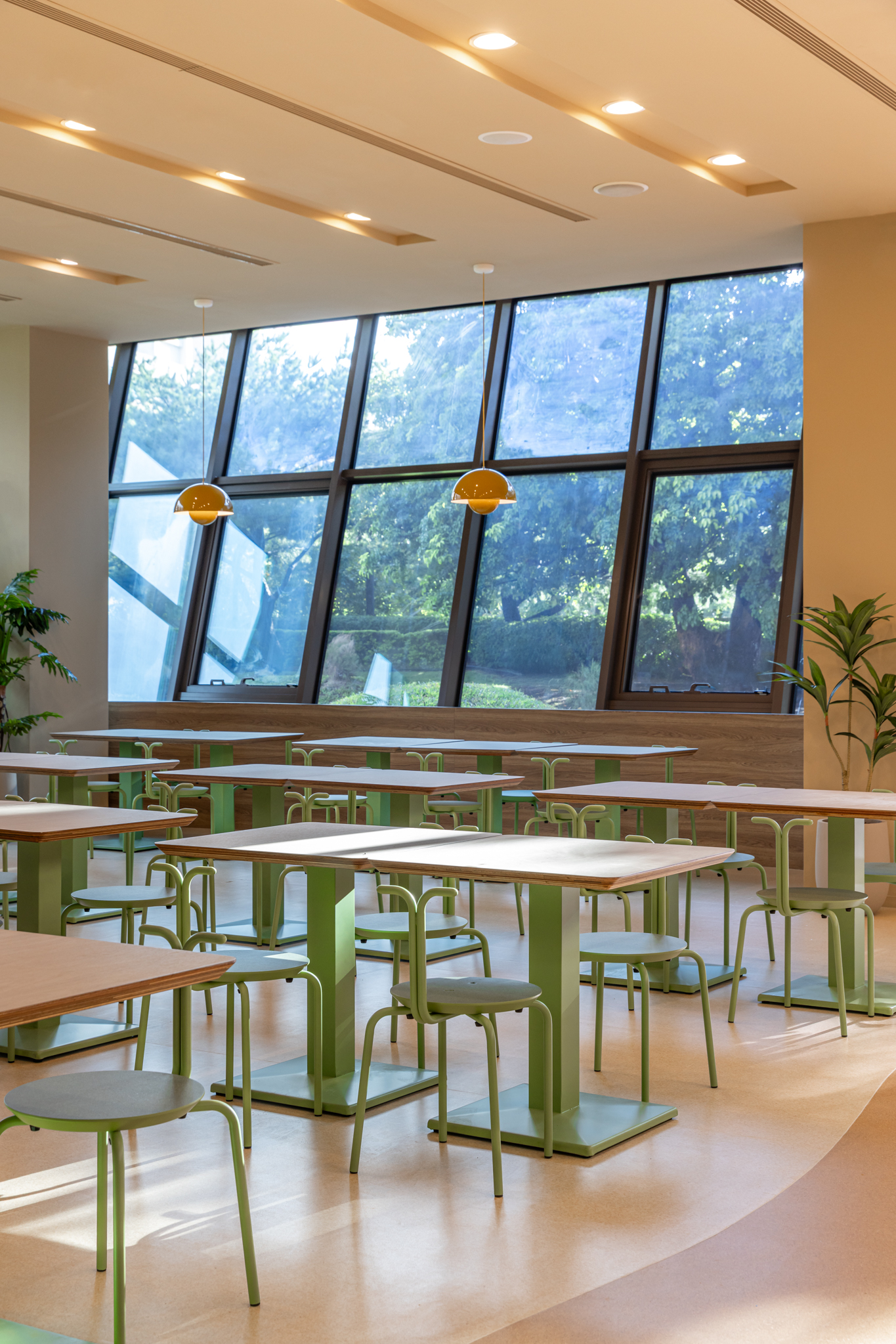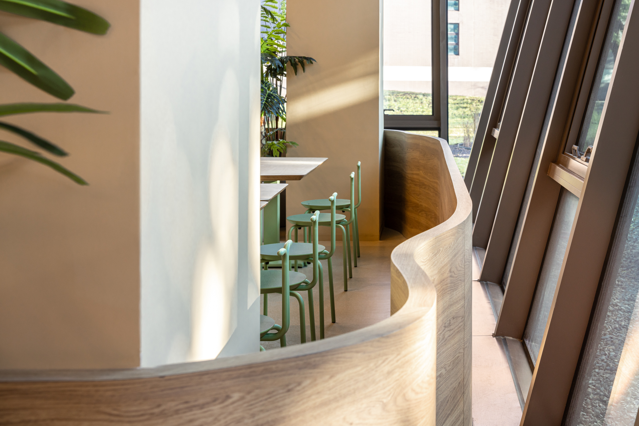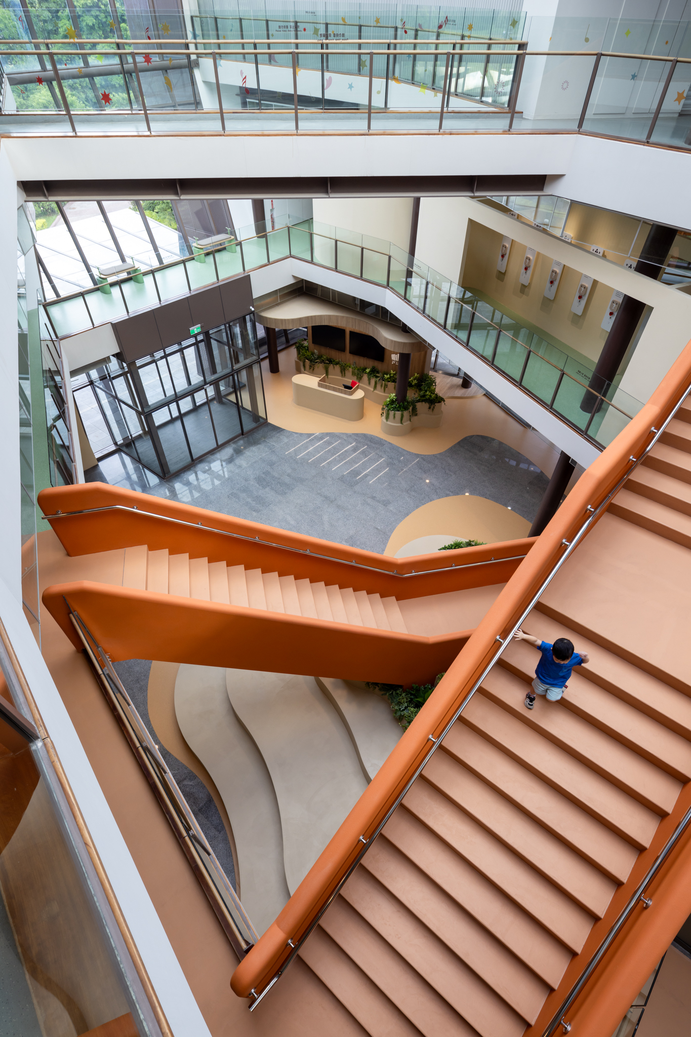 貫穿整體的巨型樓梯,延伸梯座的結構範圍,將巧克力漿緩緩流下的意象融合休憩與舞台機能,錨定成為空間中的視覺重點,樓梯以圓潤柔和的造型與經過精算的動線設計,串聯上下樓層與各功能區塊,強化場域之間的流動性與敘事延續性。整體空間基調以米色、沙色、咖啡色等大地色系構築出溫潤自然的基礎語境,輔以綠植點綴生機,呼應品牌所欲傳遞的「療癒」精神。象徵性的橘色則作為空間的情緒色彩,用於家具、軟裝與平面設計,提升整體視覺層次與趣味感。