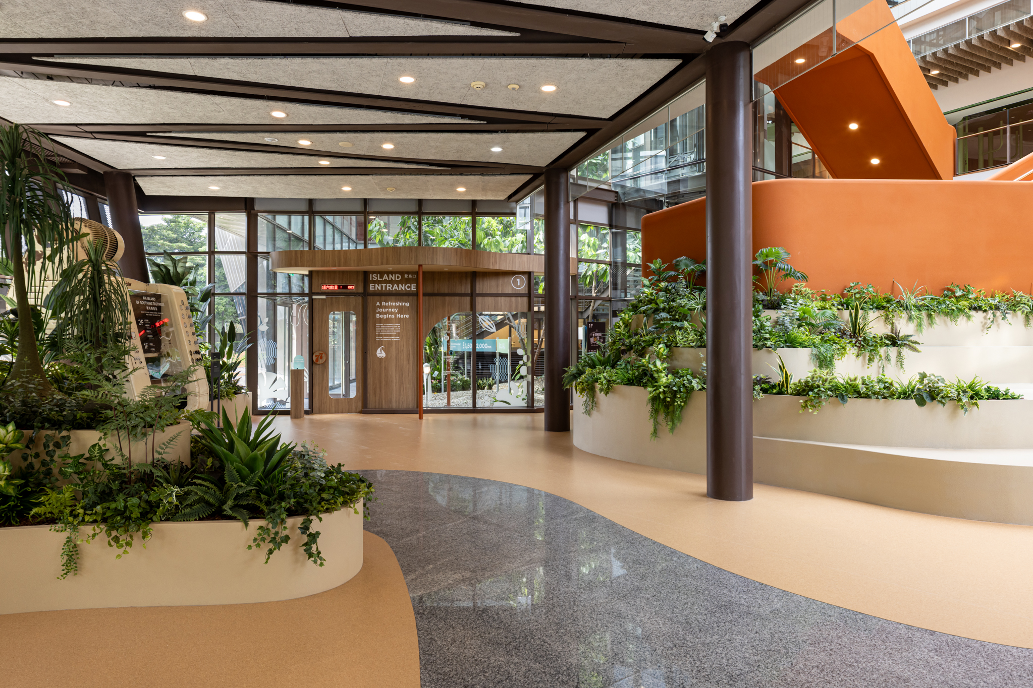 挑高且通透的入口大廳,其設計靈感取自進入主島前需穿越的「群島」,在空間結構上與二樓常設展區所象徵的主體大島形成呼應與對比。以「群島」作為設計主軸,大廳透過等高線語彙勾勒出島嶼地形輪廓,使大小錯落的島嶼單元於空間中層層鋪展,不僅清晰區分出服務、休憩、導引等功能場域,也形塑一種開放而具包容力的空間姿態。