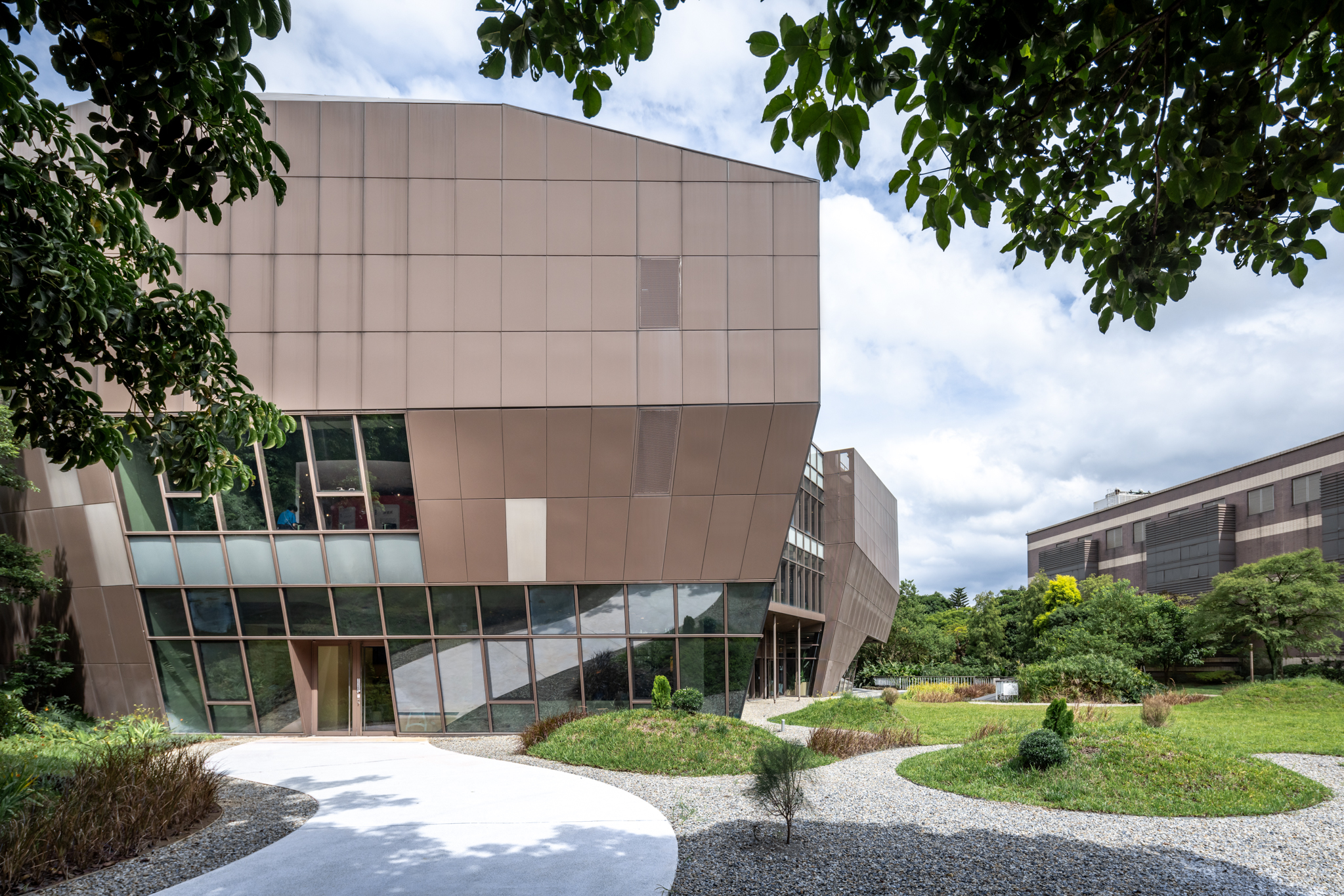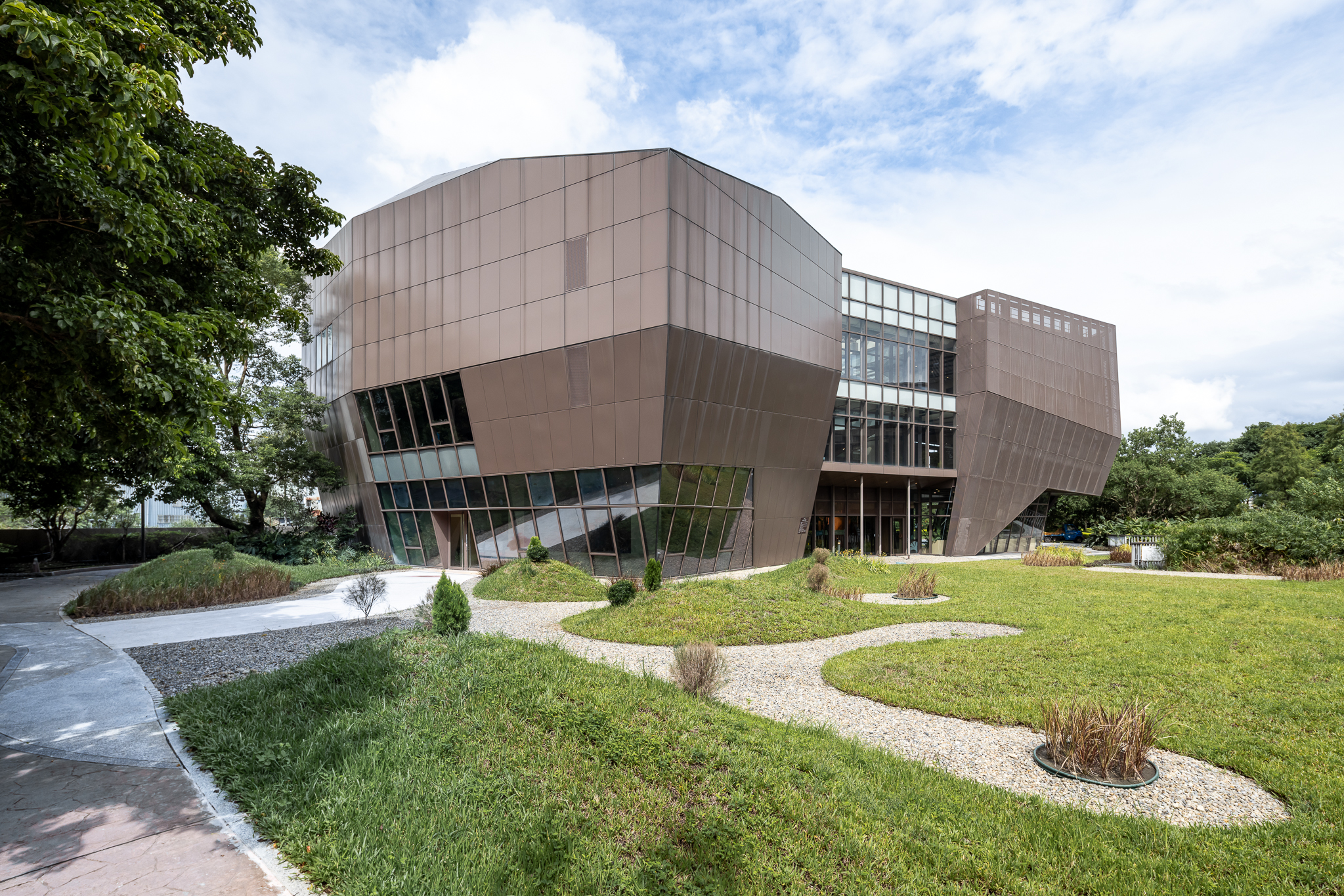景觀設計以自然融合與品牌精神為核心,運用巧克力融化的流動感轉化為步道曲線與地形起伏,營造動態且沉浸式的戶外體驗。透過植栽活化、綠地擴增與現代簡約的鋪面設計,使空間兼具生態價值與視覺美感,並強化品牌識別,使其成為結合綠意、文化與人文互動的友善環境。