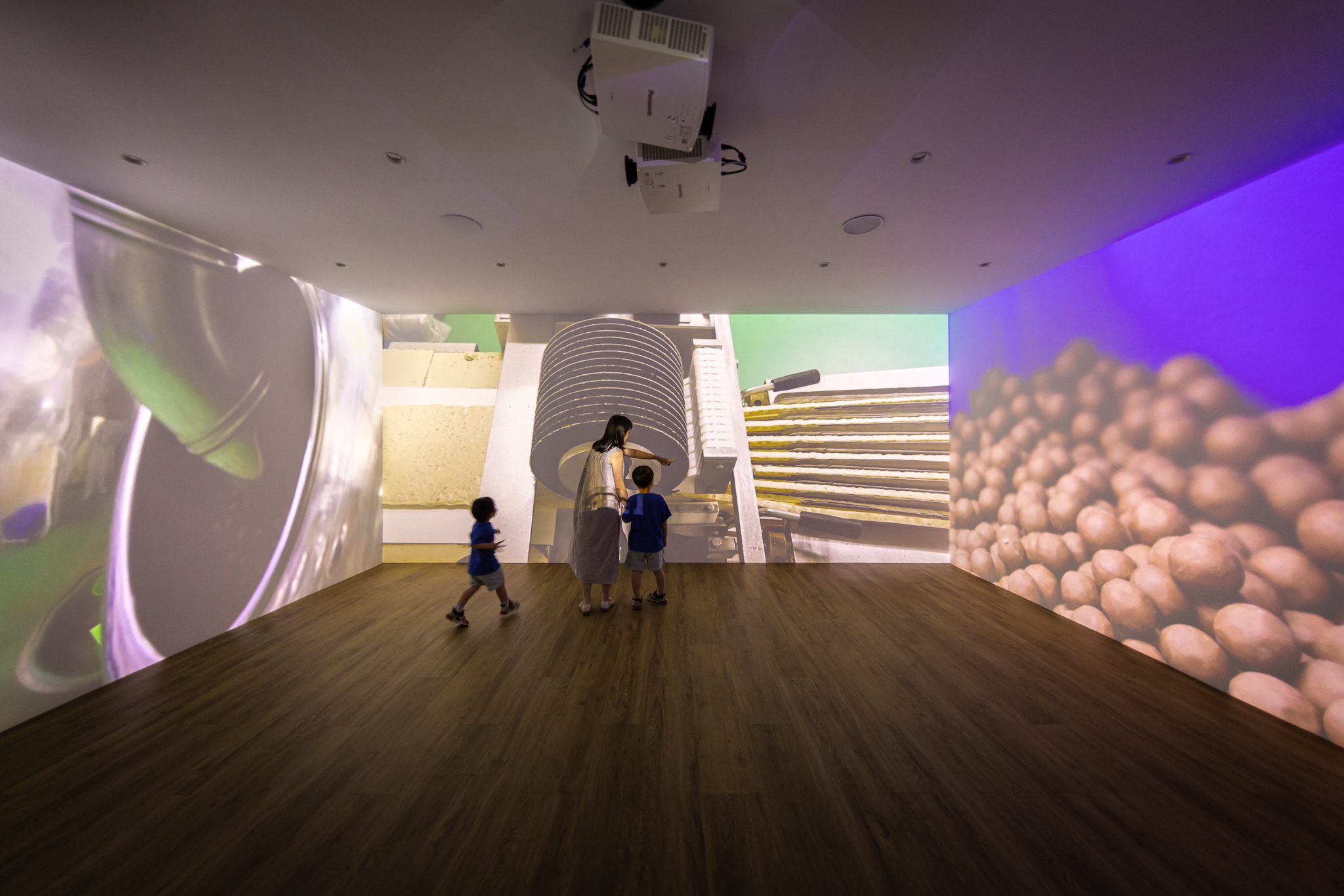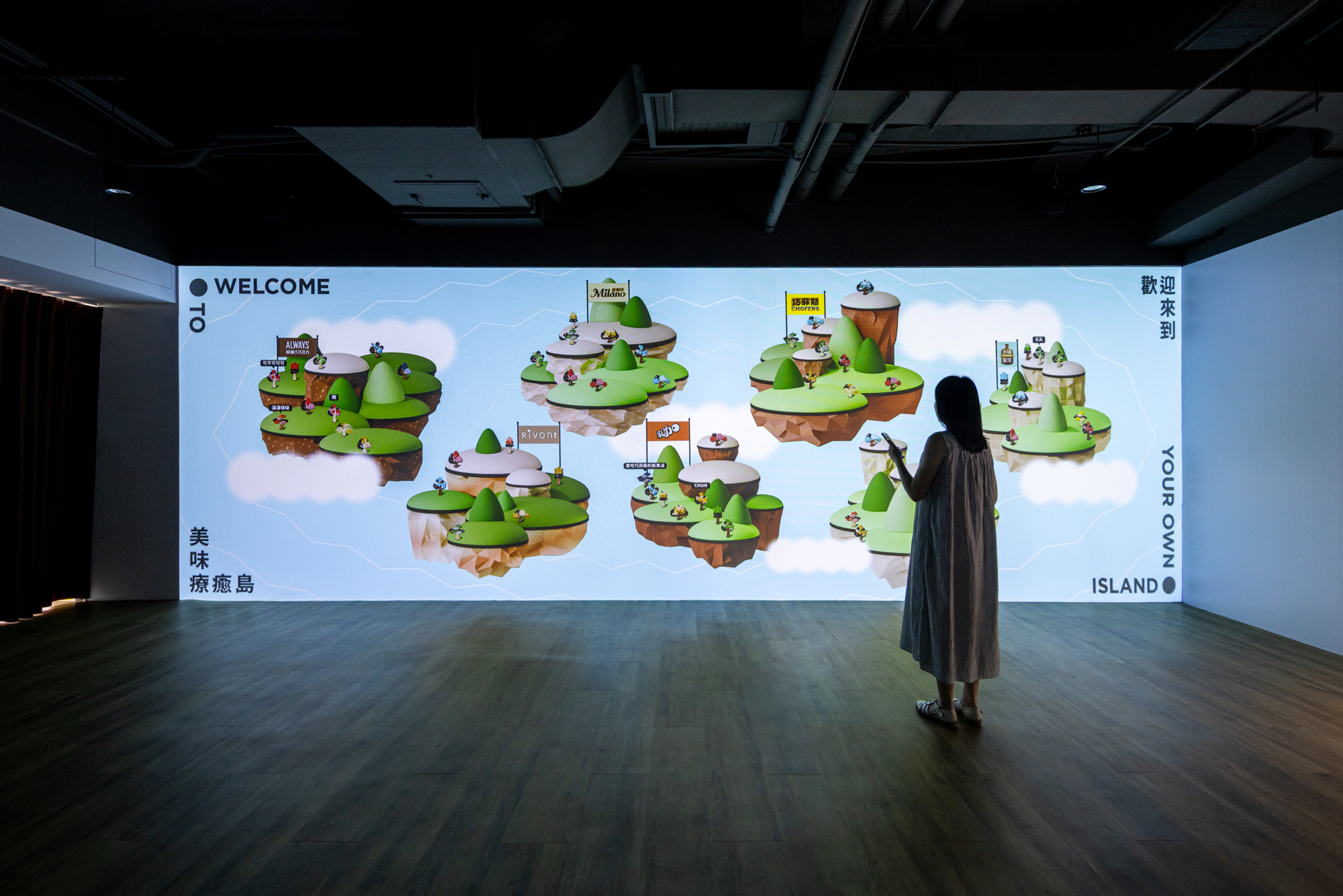 展區以三面巨型投影記錄宏亞食品工廠製作美味療癒食品的過程,配合從工廠中取樣,並重新編曲的聲響節奏,帶領參觀者進入美味療癒的沉浸式影音環繞。最終關卡透過LINE數位互動的體驗串聯,在此區種下專屬於自己的數位可可樹,根據互動過程而成為美味療癒島上不同品牌島嶼的島民,並獲得相對應的品牌產品優惠券,透過LINE數位互動即時分享至展場大型螢幕,共享美味療癒島所帶來的記憶與感動。