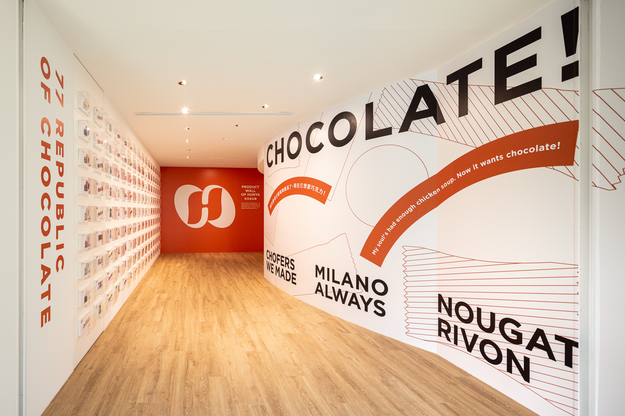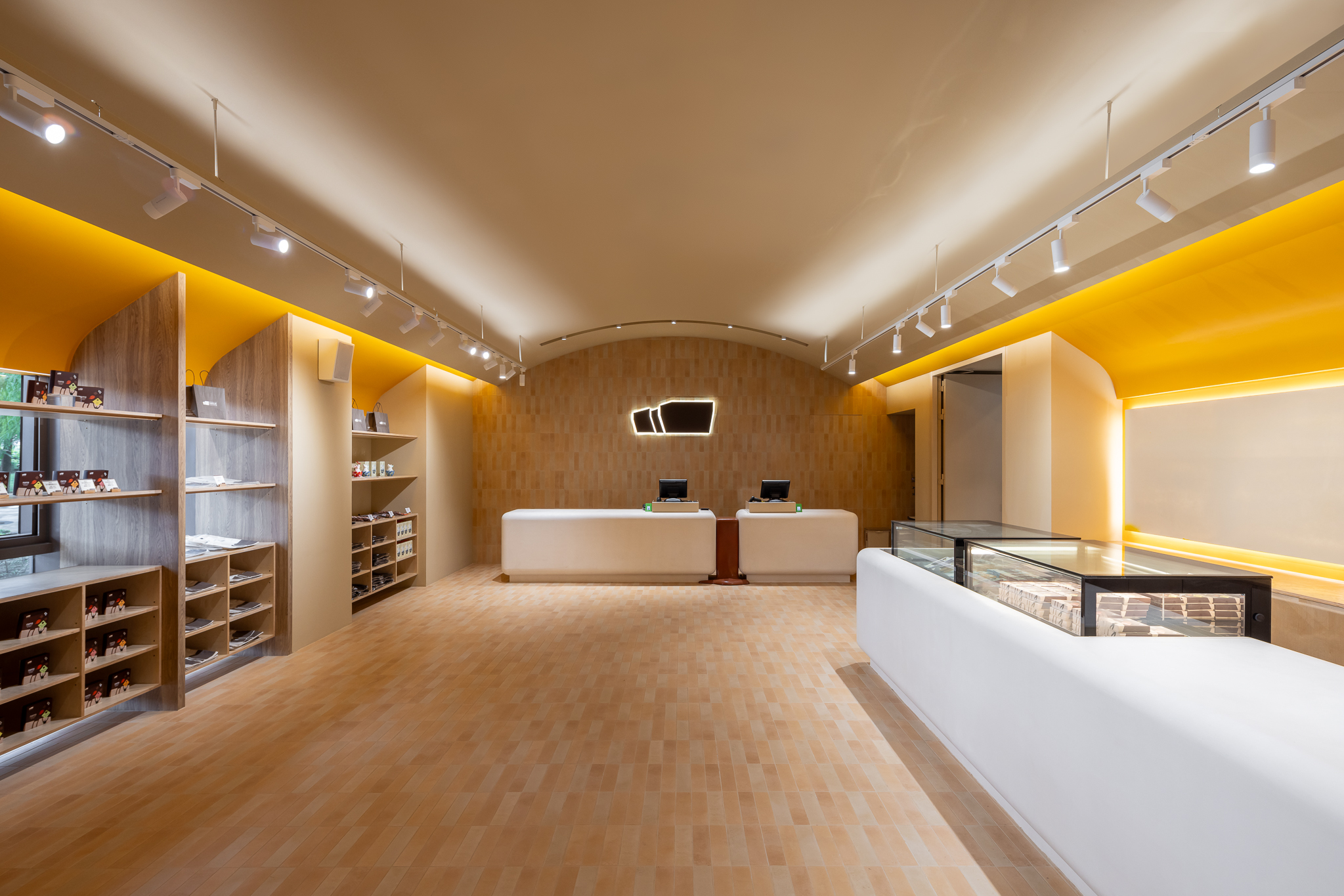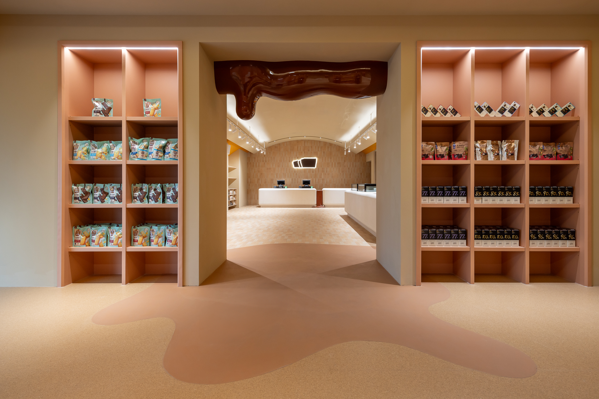 以「美味療癒島」為空間核心,全區以多層次的複合式機能構築出流動的島嶼地景。一樓以開放式商業空間為主軸,串聯商品展示、互動服務與即食體驗;二樓則規劃為品牌常設展覽區,以沉浸式動線與敘事設計,傳遞巧克力背後的文化與創造力。引領來訪者踏上一場兼具啟發、趣味與味蕾魅力的奇幻旅程。
