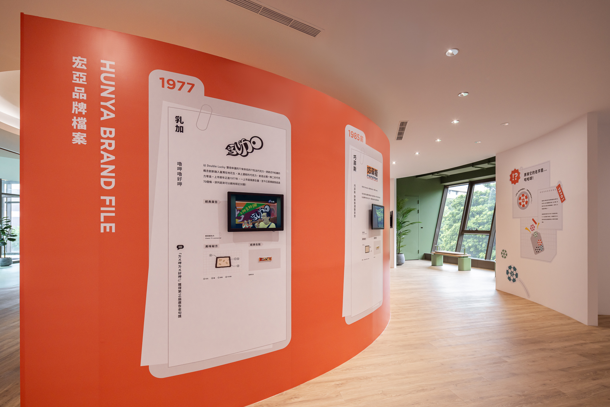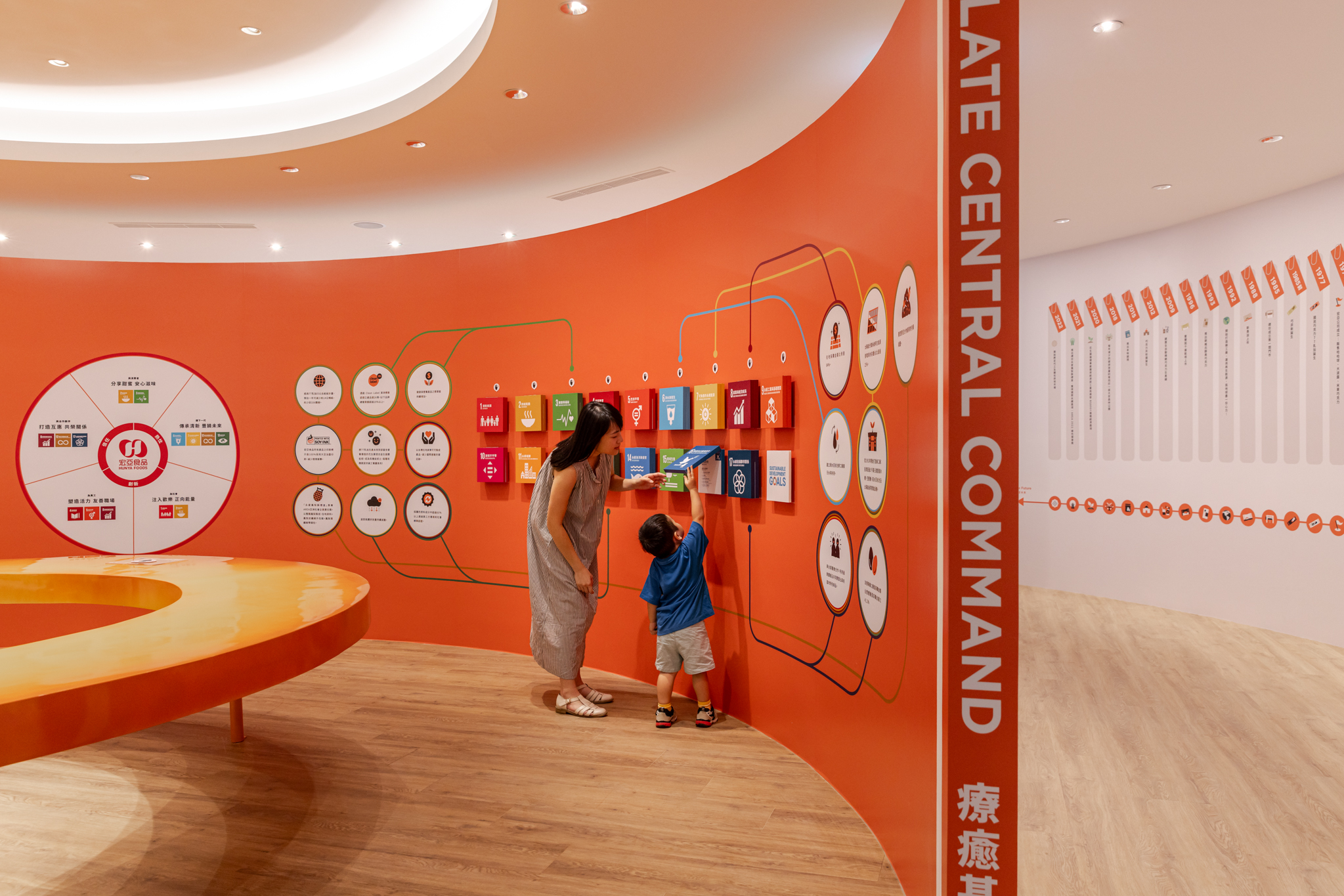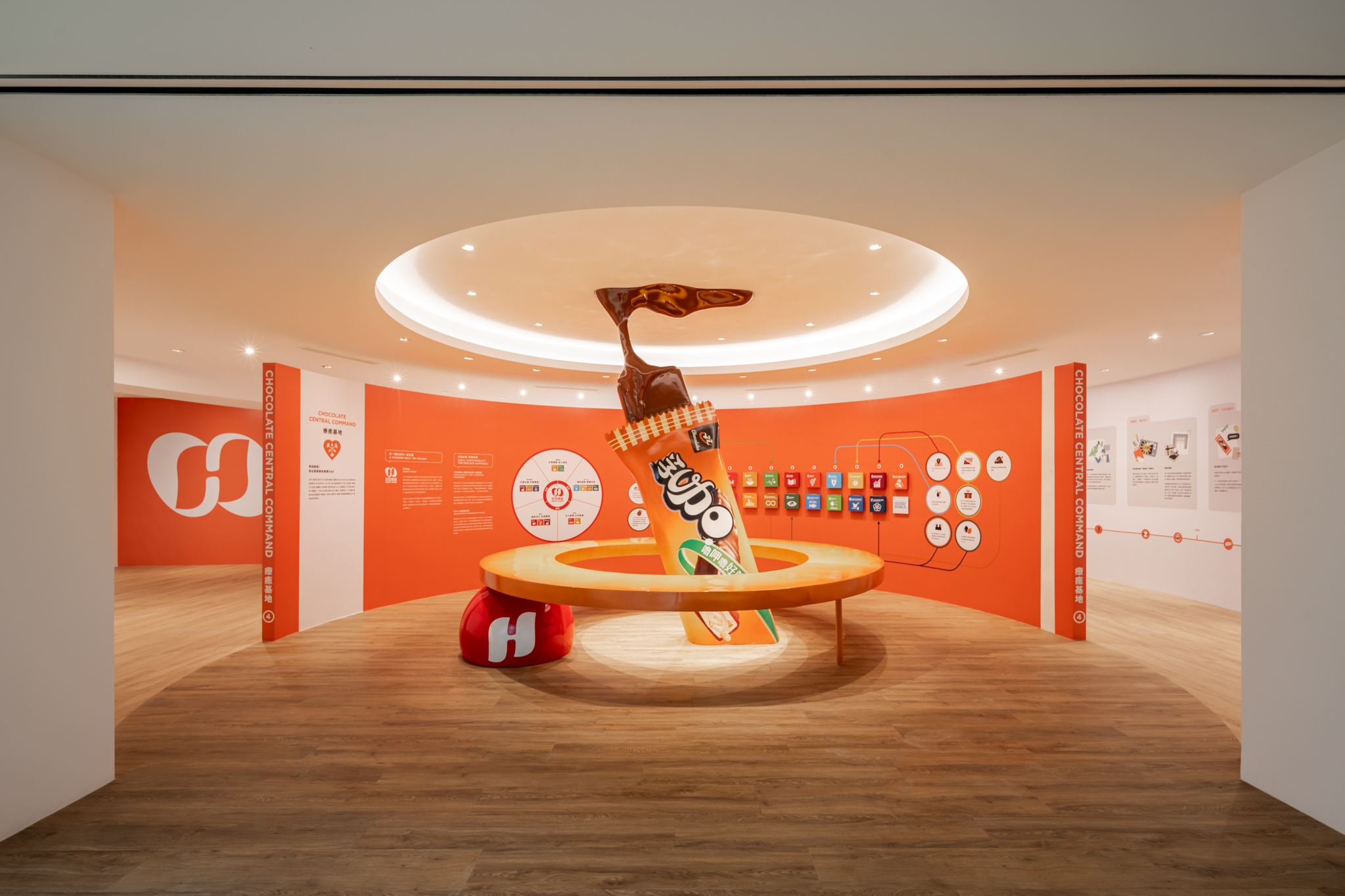接續的「療癒基地」以同心圓結構佈局,形成聚焦式的精神中軸,透過LINE數位互動,帶領觀者逐步了解宏亞食品如何落實聯合國SDGs永續發展目標,傳達品牌在ESG永續之路上的堅持,點出「在地永續,幸福延續」的核心理念,以及宏亞食品的品牌發展故事。