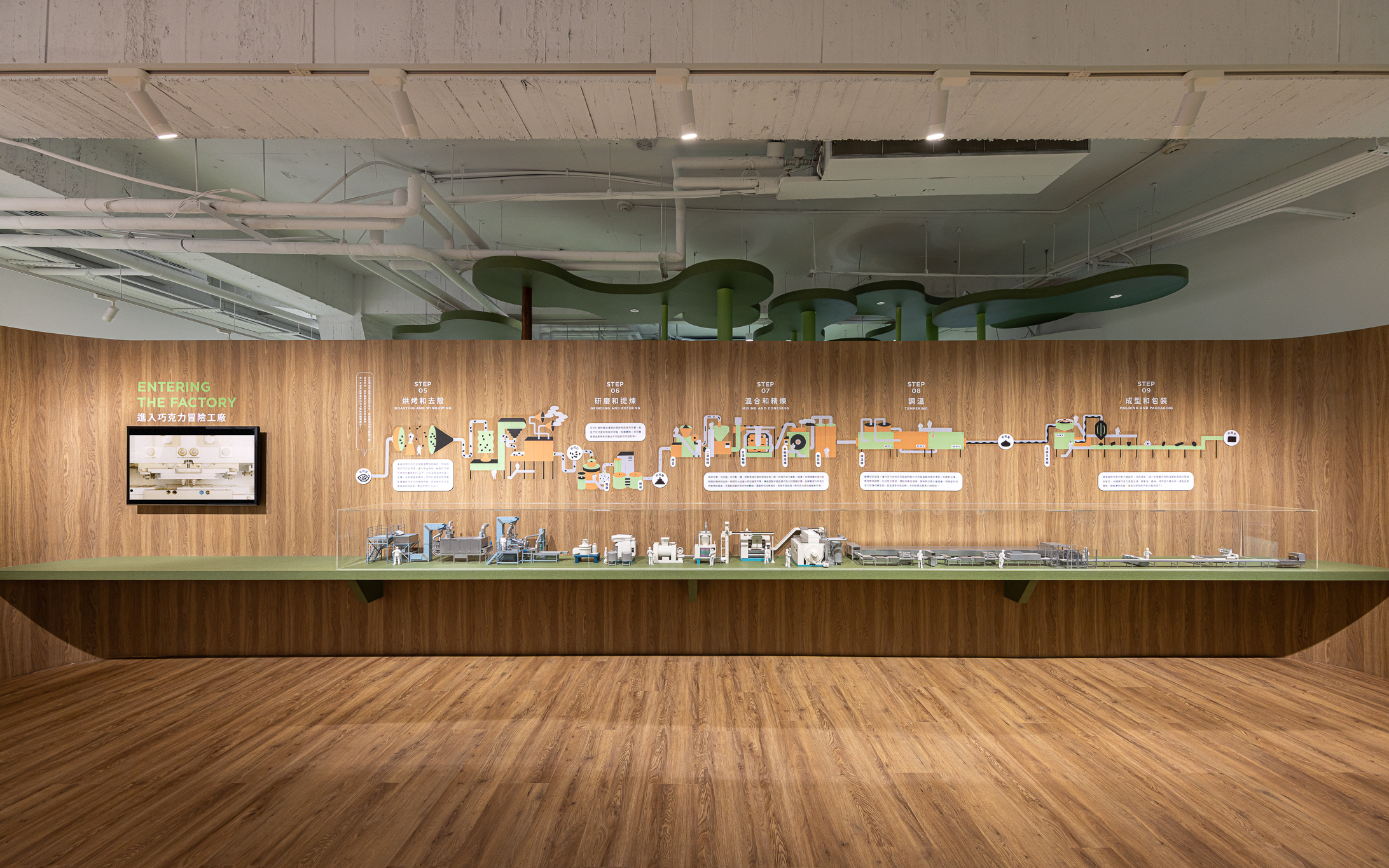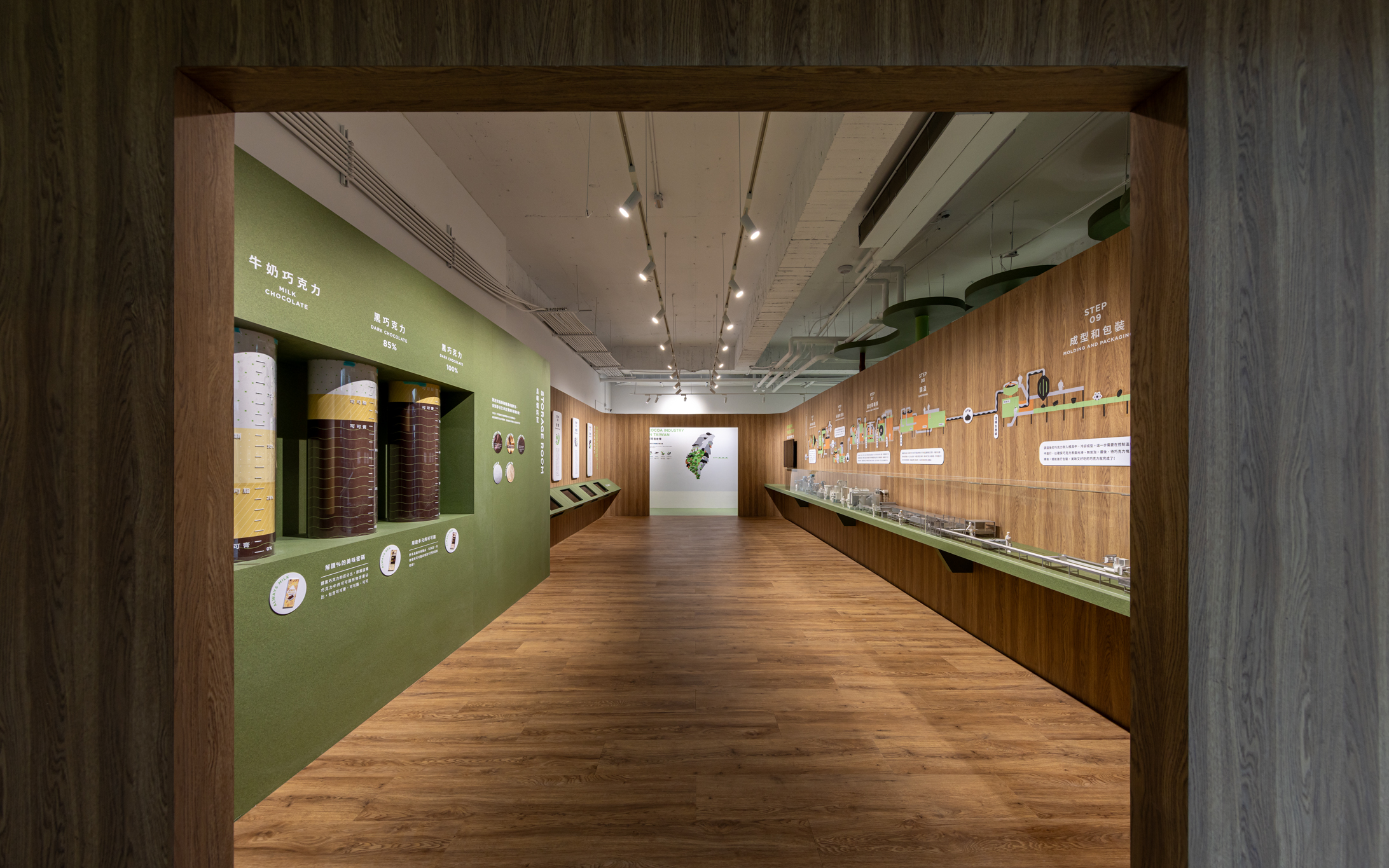 穿越真實版可可森林後,動線自然銜接至轉化森林意象的展覽場域,藉由幾何語彙與有機結構,轉譯出神話、歷史與全球可可文化的時空脈絡。空間敘事從過去延伸至當代,以互動裝置與沉浸式設計喚起觀者的感知記憶。「可可樹屋」隱藏於森林邊界,作為一處知識節點,描繪全球與臺灣的可可地圖,並聚焦於屏東梅雅農場可可職人的日常,紀錄從採收到加工的每一道工序,使訪客近距離理解可可的生產生命週期。