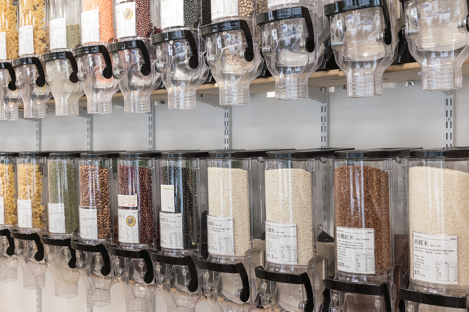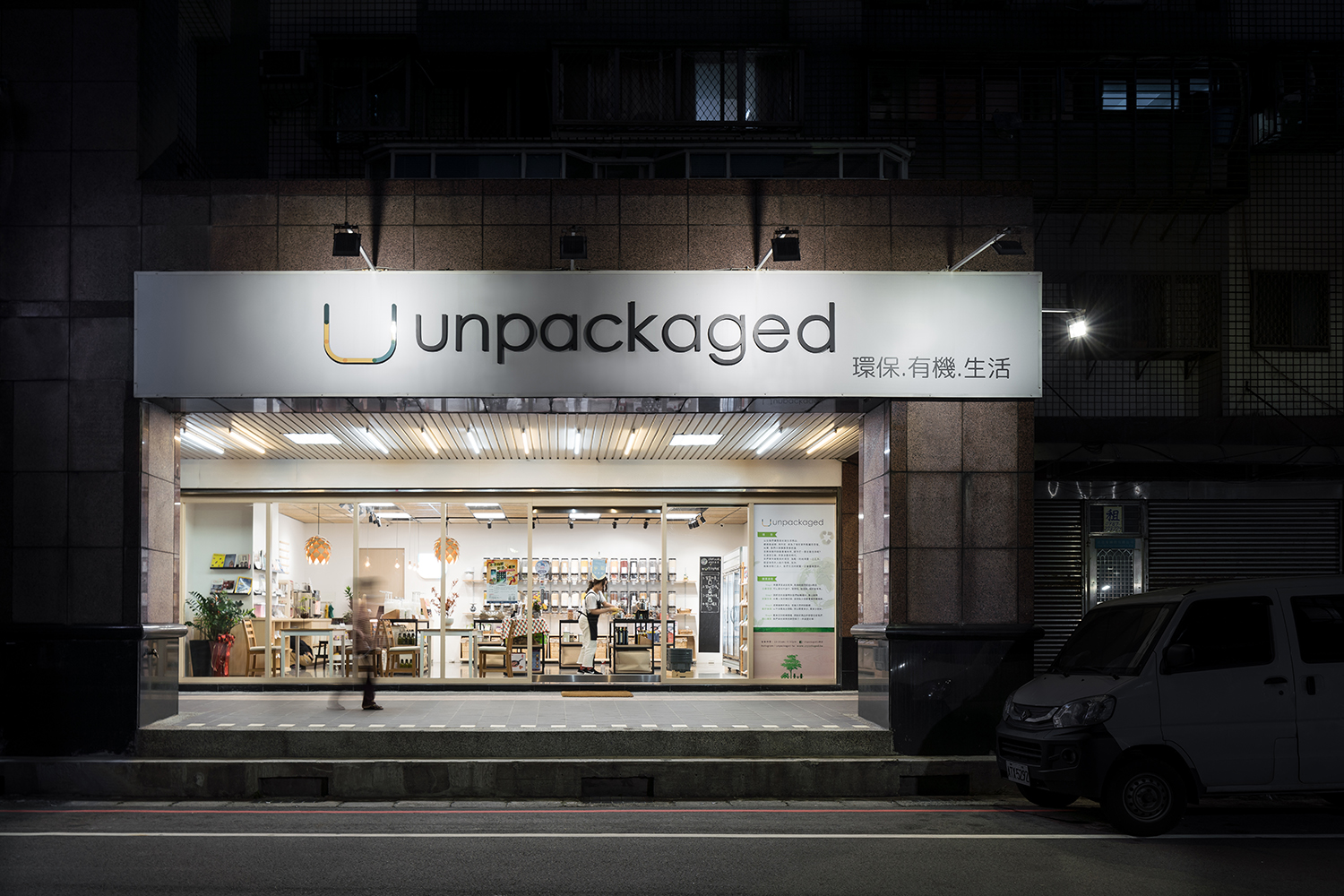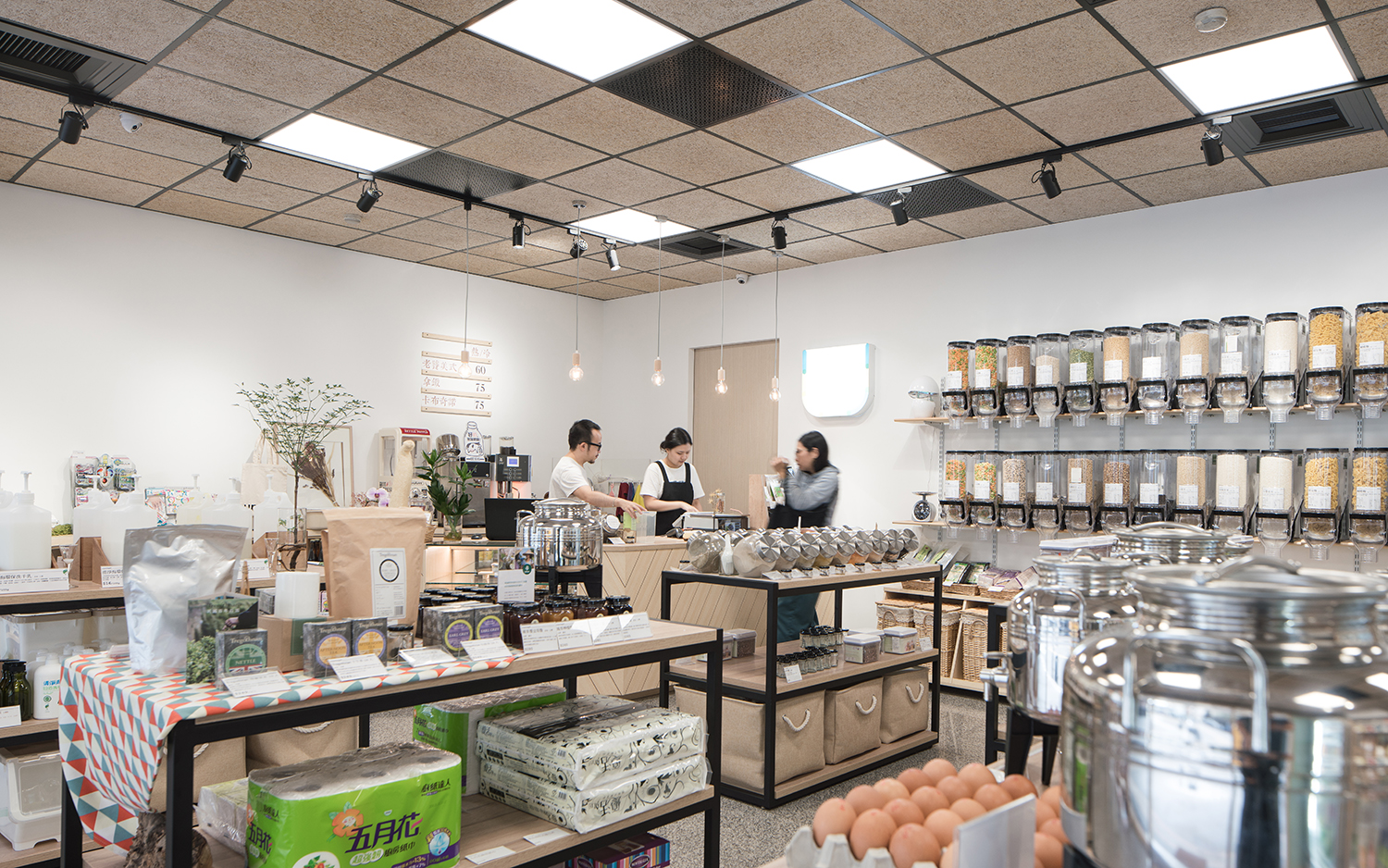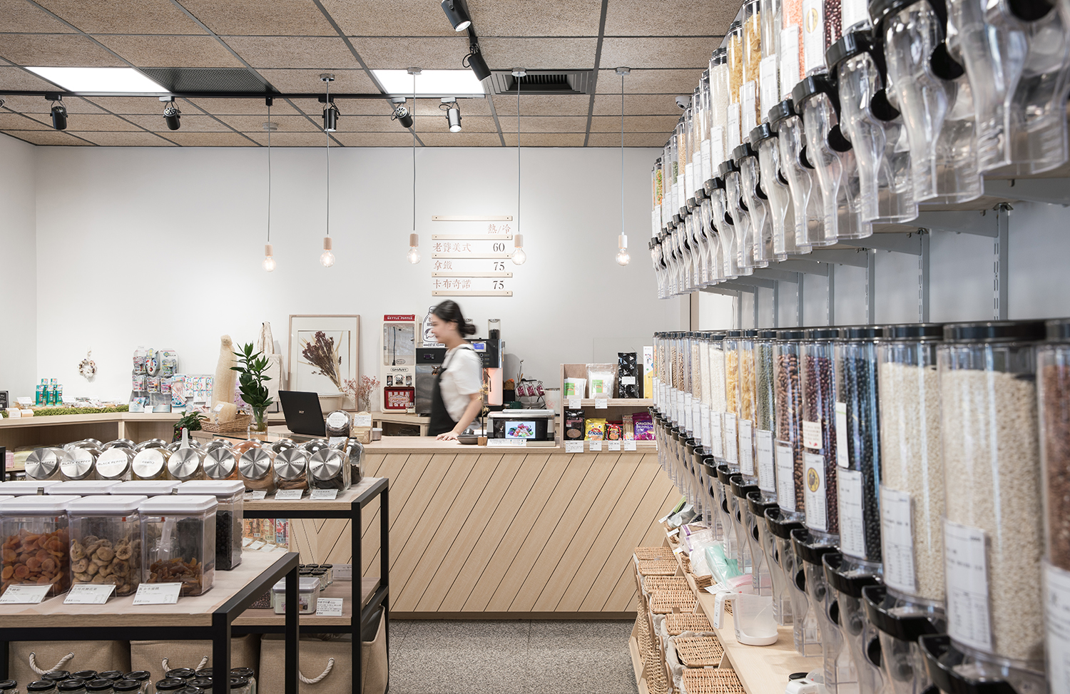 回應「Unpackaged」無包裝商店的友善地球理念,以自然、微加工的材質作為主軸-延用原有天花板骨架與花崗岩地板,選用纖維板及簡易櫃體、竹編籃呈現自然裸質感的空間氛圍。