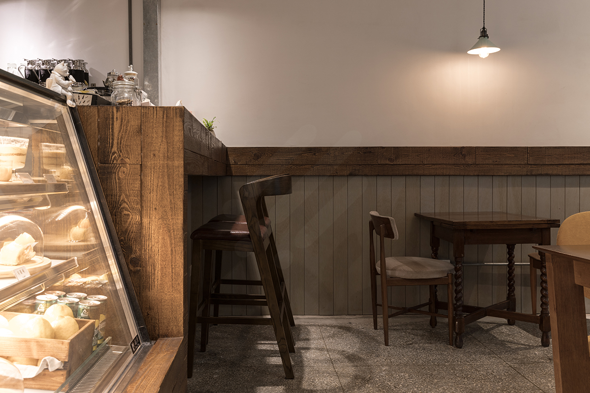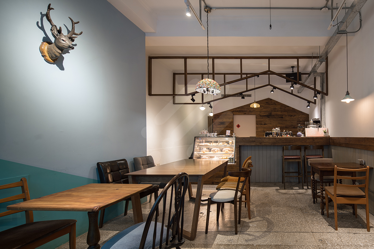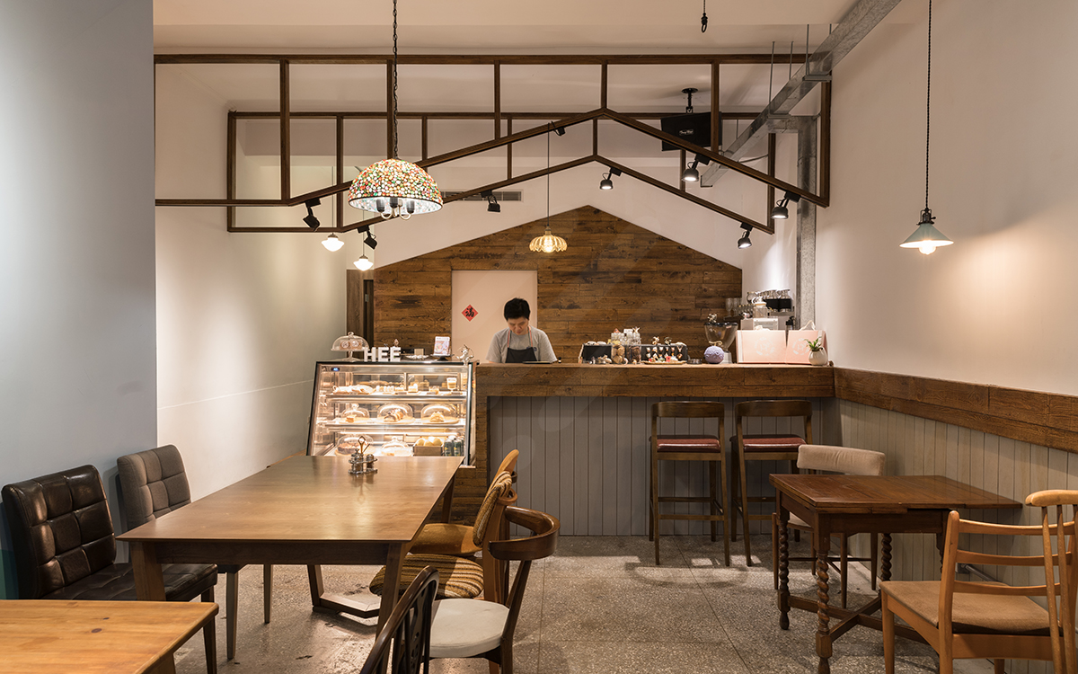 本案藉由退縮的入口空間,營造連結內與外的香草植物園;室內空間則以房屋線條架構出屋中小屋的概念,由虛體的框架到實體的面,延伸一進又一進的空間深度;選材上以自然系色調為基礎,搭配歐式老家具規劃陳列,隱身在幽靜植物園之後,讓吉古吉古烘焙專門店化身熱鬧商辦大樓區內的一間療癒小店。