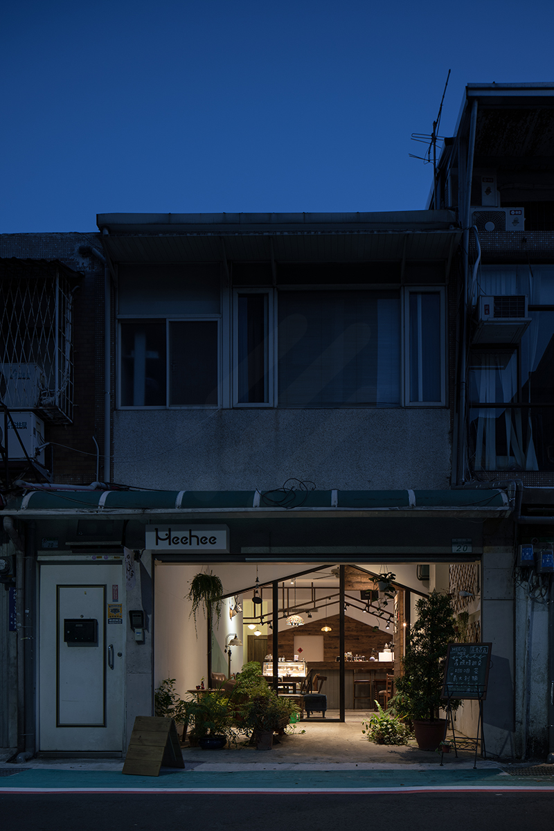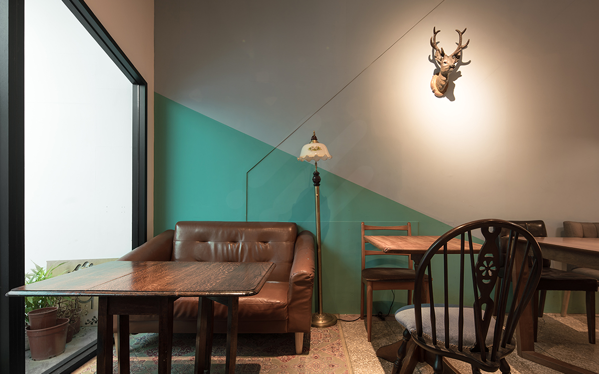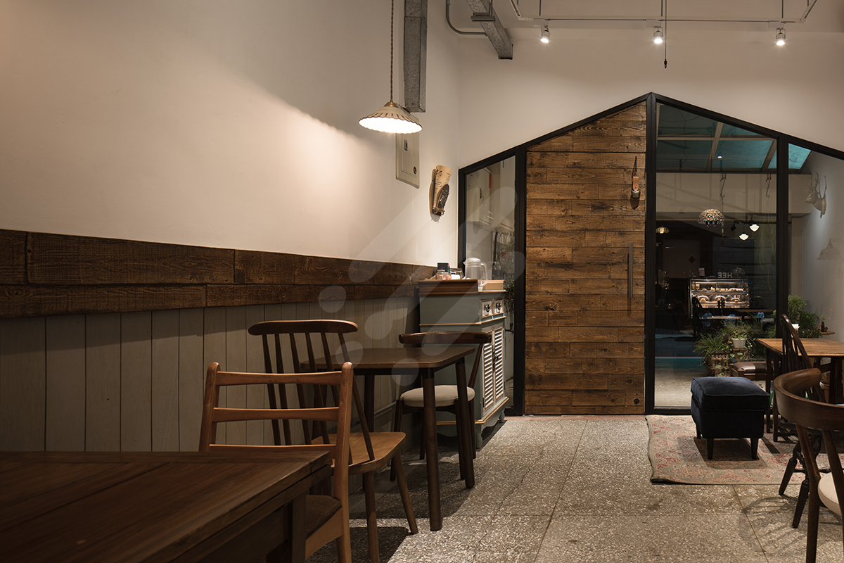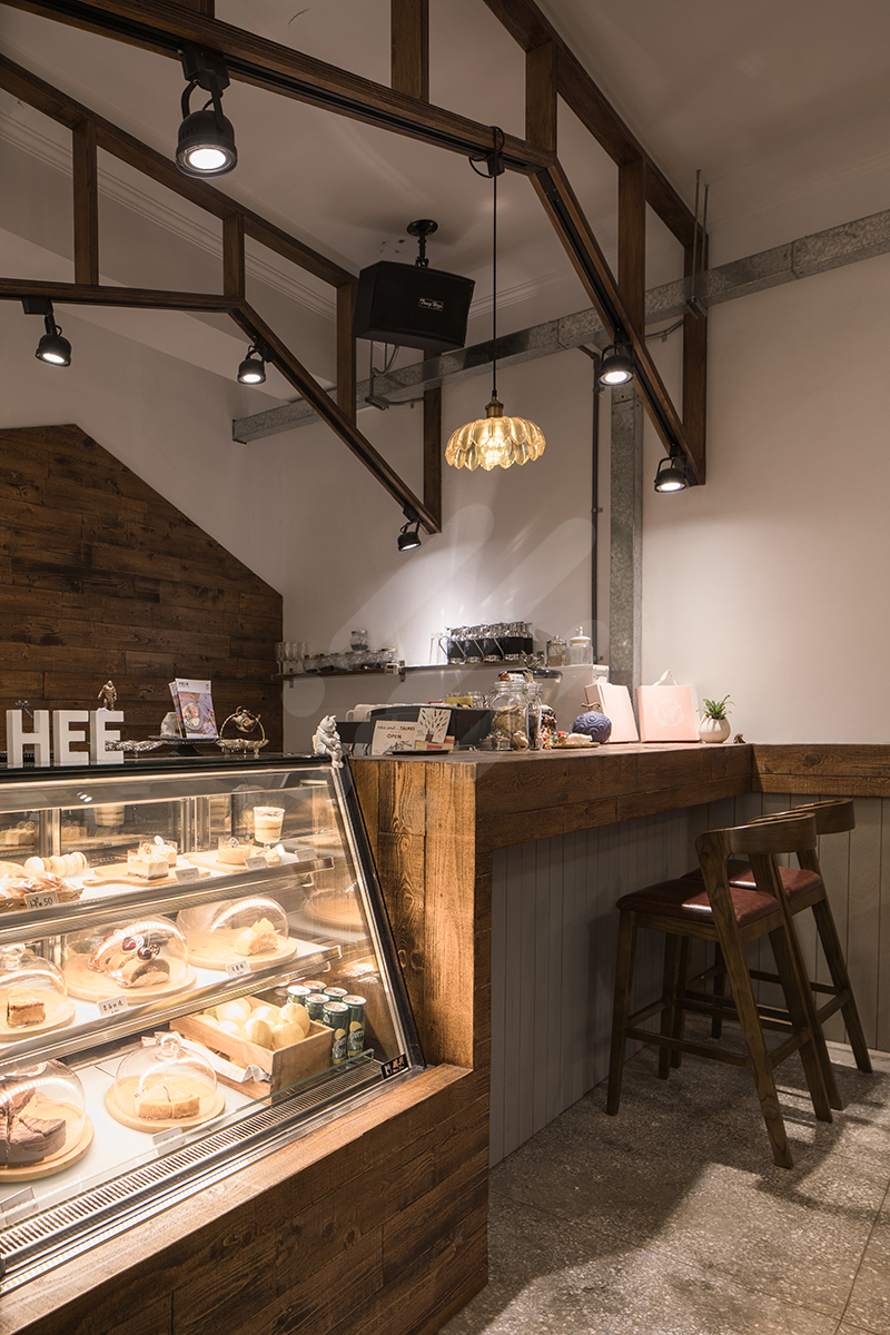本案藉由退縮的入口空間,營造連結內與外的香草植物園;室內空間則以房屋線條架構出屋中小屋的概念,由虛體的框架到實體的面,延伸一進又一進的空間深度;選材上以自然系色調為基礎,搭配歐式老家具規劃陳列,隱身在幽靜植物園之後,讓吉古吉古烘焙專門店化身熱鬧商辦大樓區內的一間療癒小店。