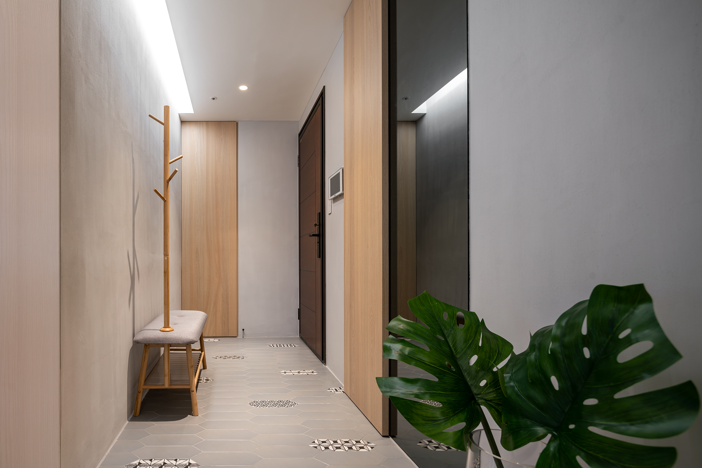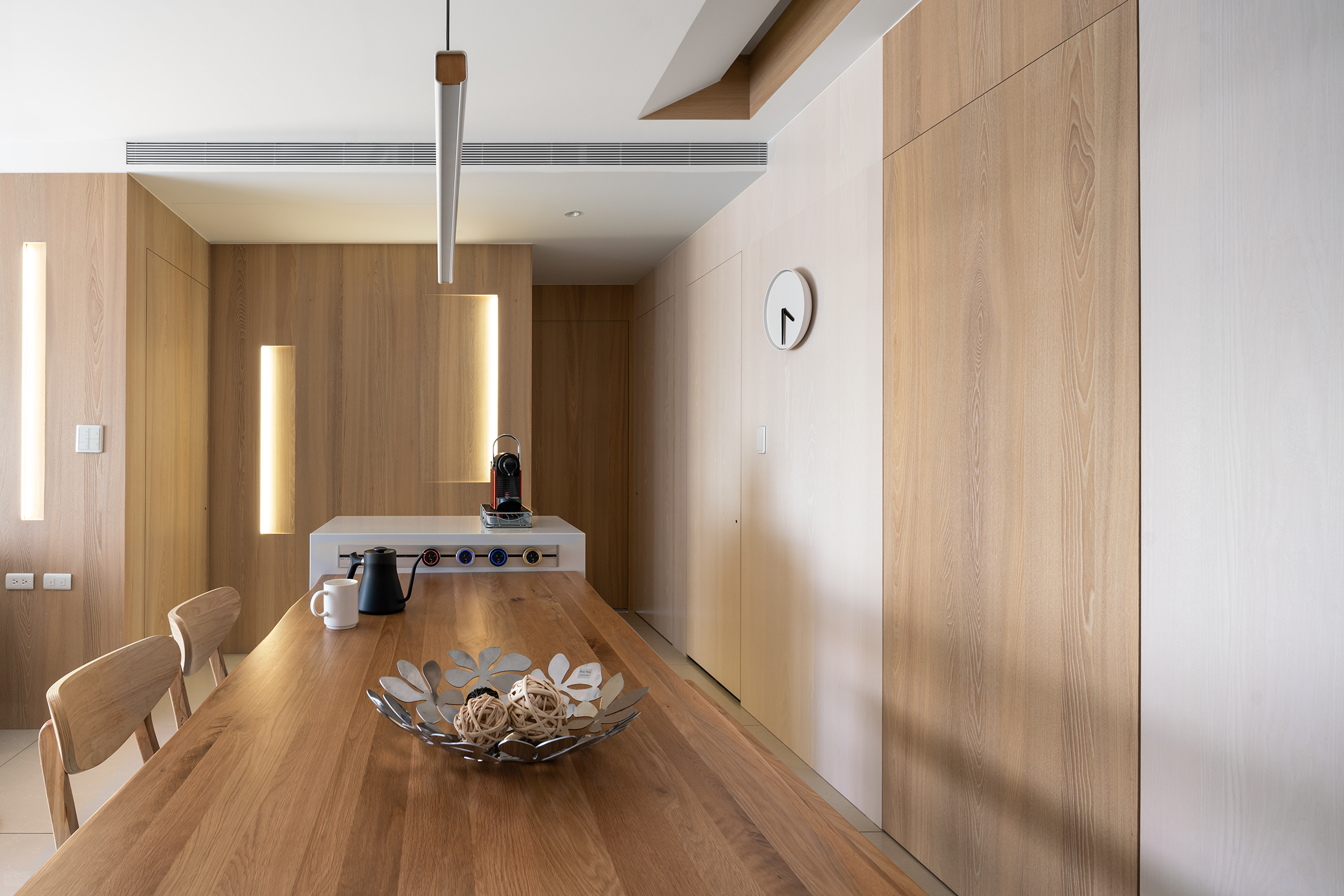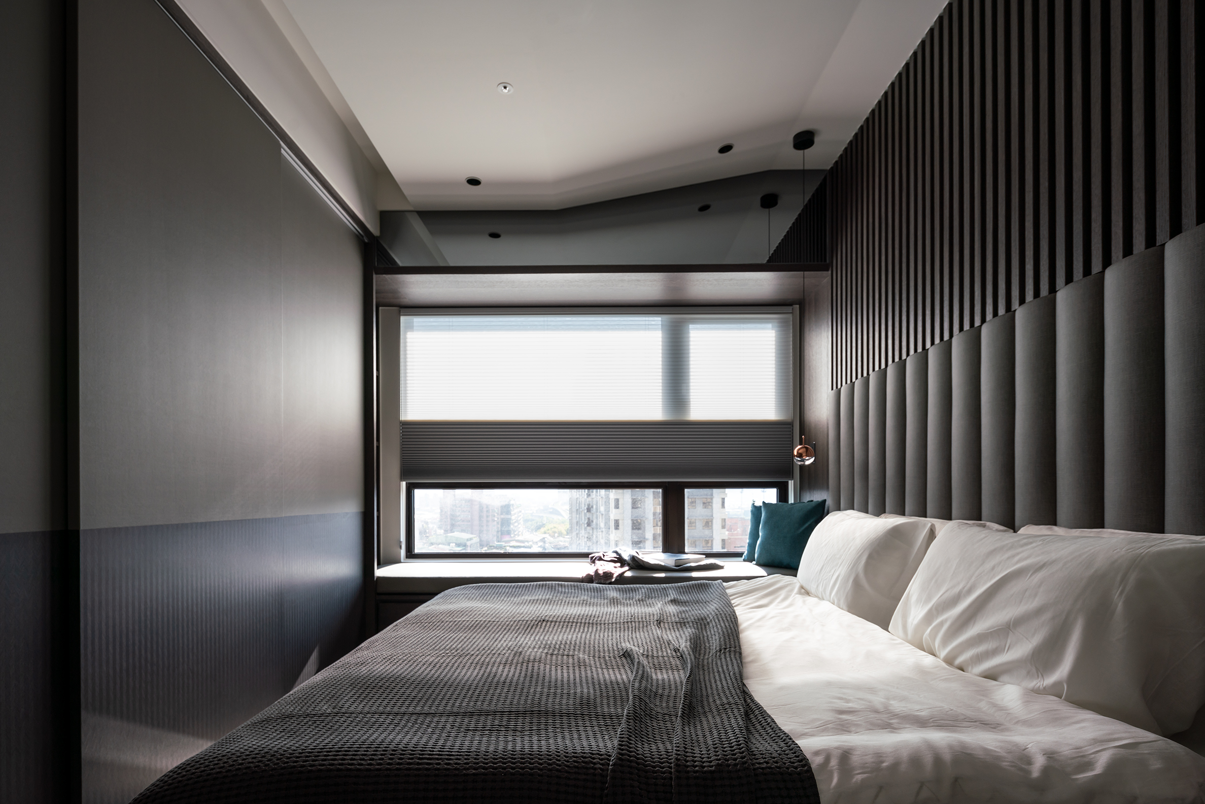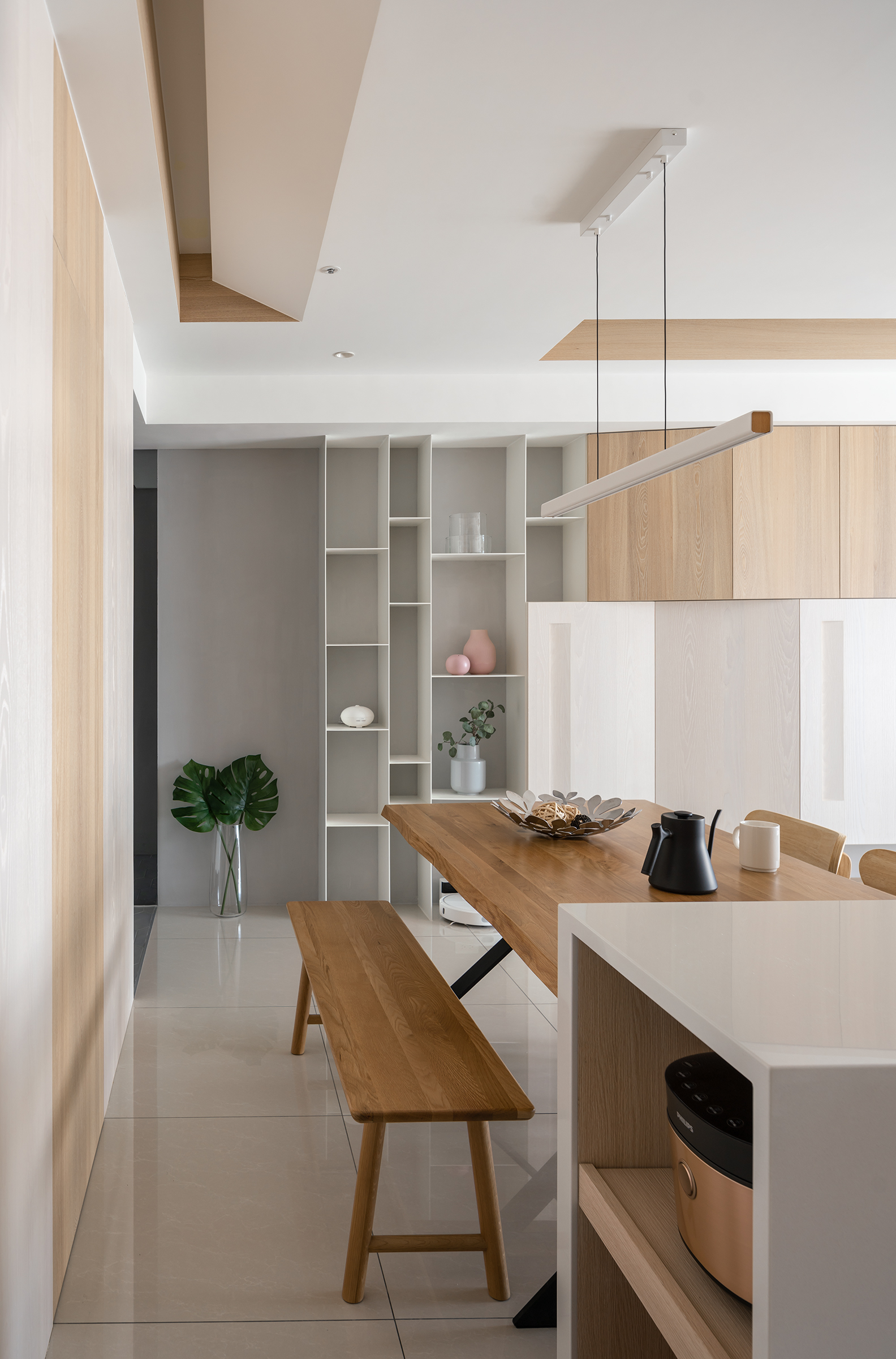 一開始我們將在走道動線上的餐廳空間注入了一個中島,讓走道形成一個環狀動線,帶動了每個空間的連結,並且將各空間門框收成暗門,讓餐廳空間更加舒適。 此案的天花板因消防空調管線問題較為壓迫,因此我們想到以”摺”為槪念,植入在天花、牆面及櫃體,閃避不能更動的現況,爭取空間高度並且營造燈光氛圍。 最後我們將主臥以深色為主,有別於其它空間的明亮色系,讓生活增添更多層次與風格。