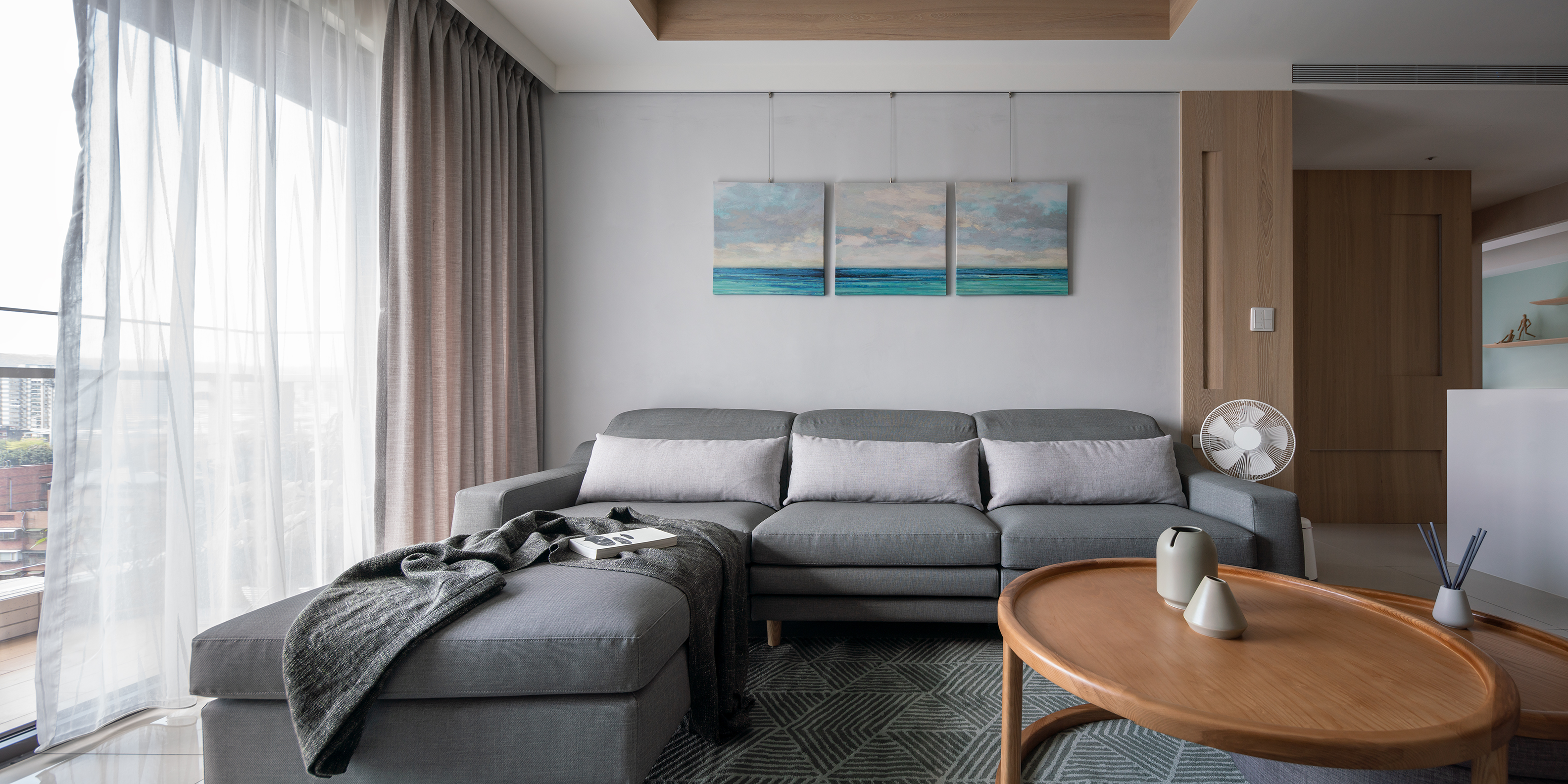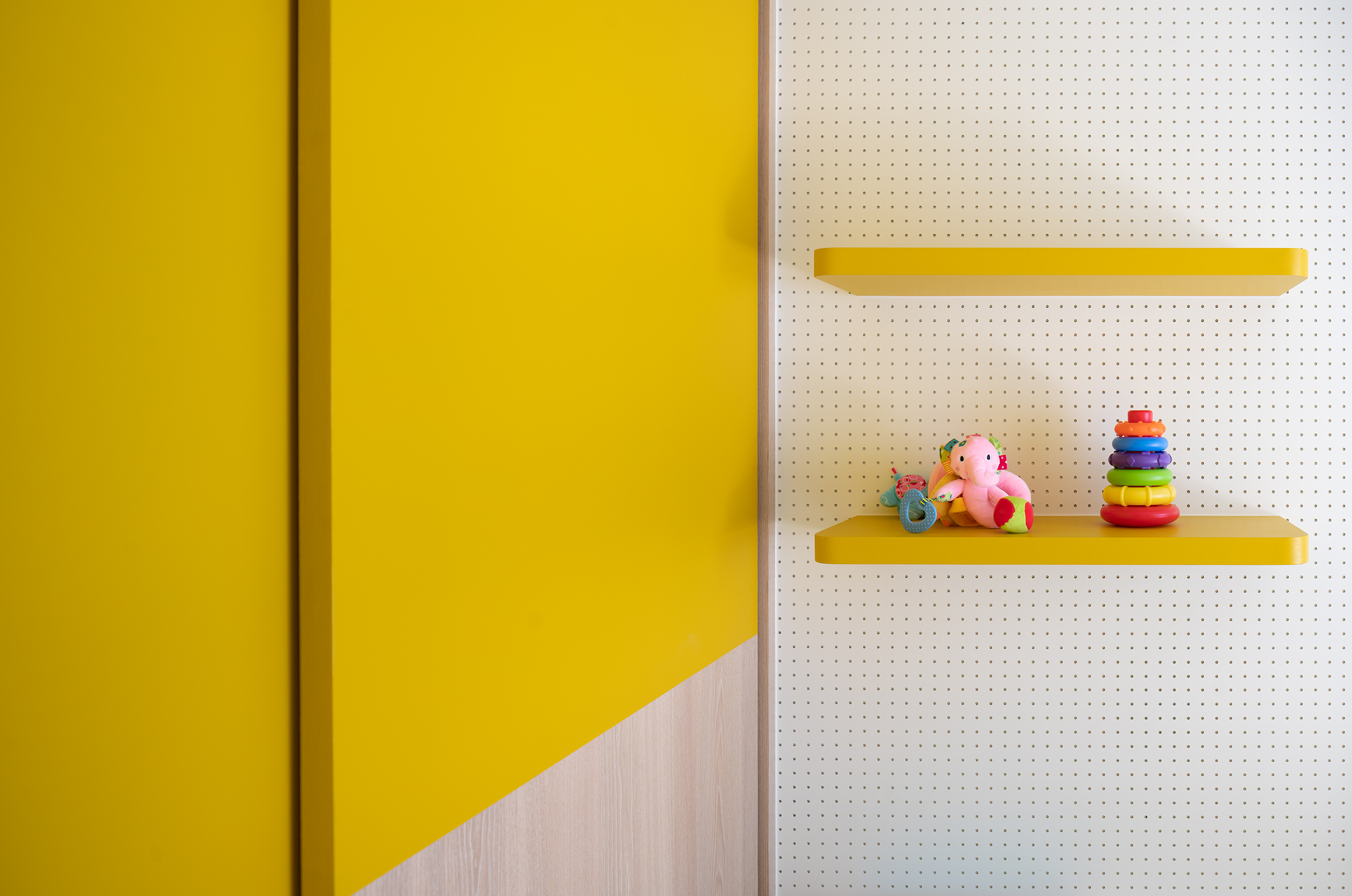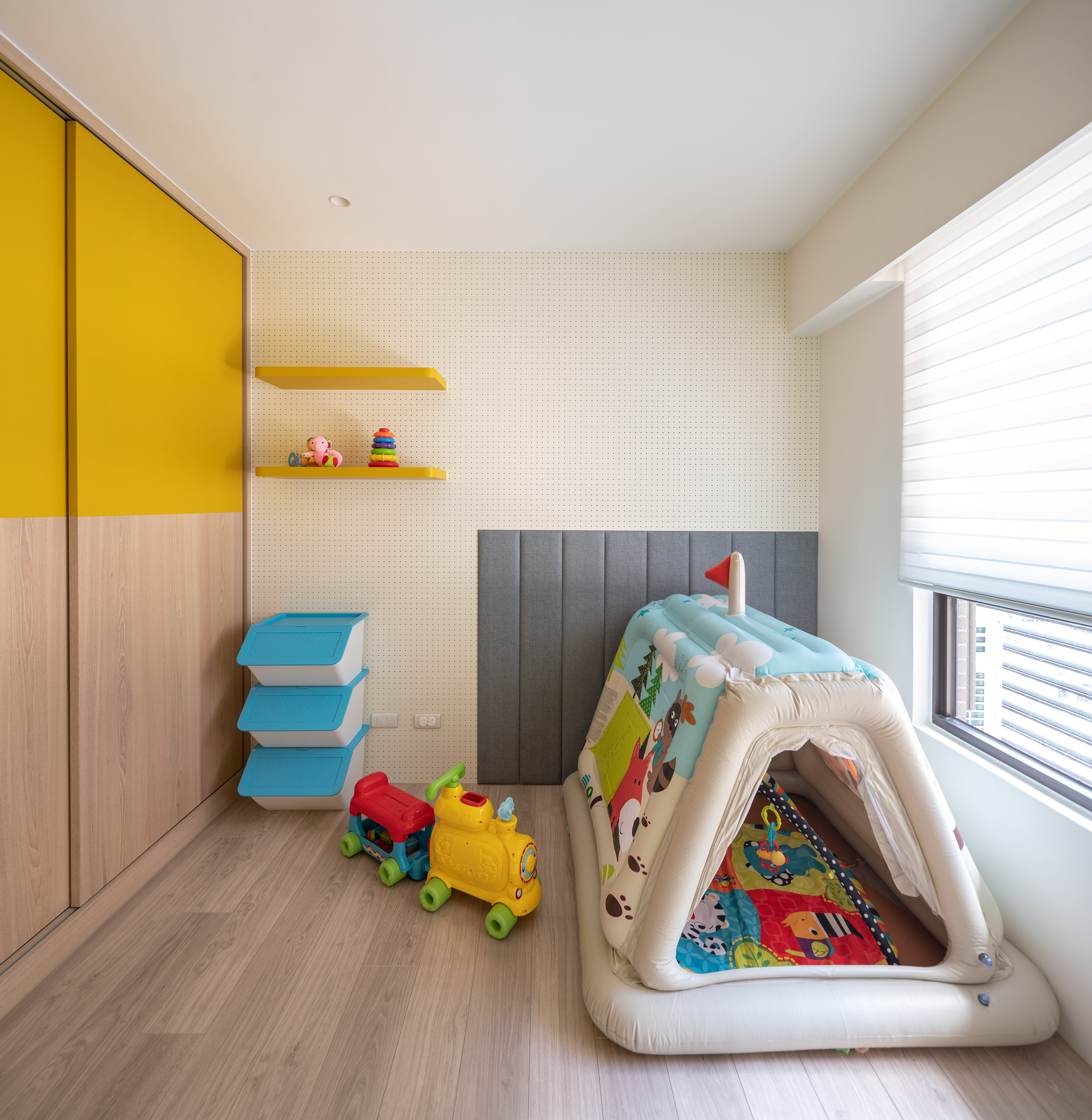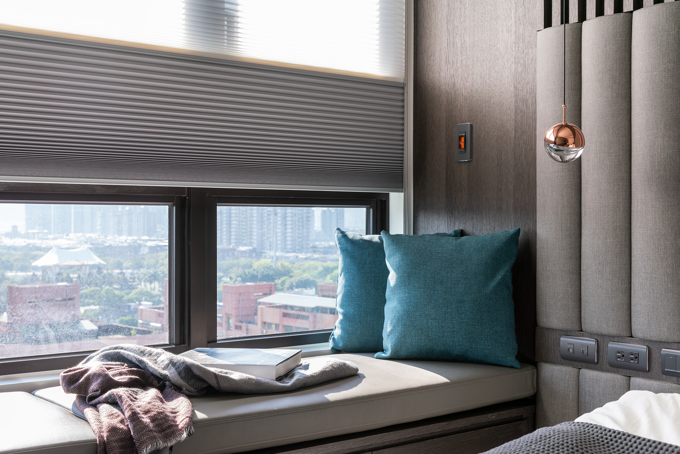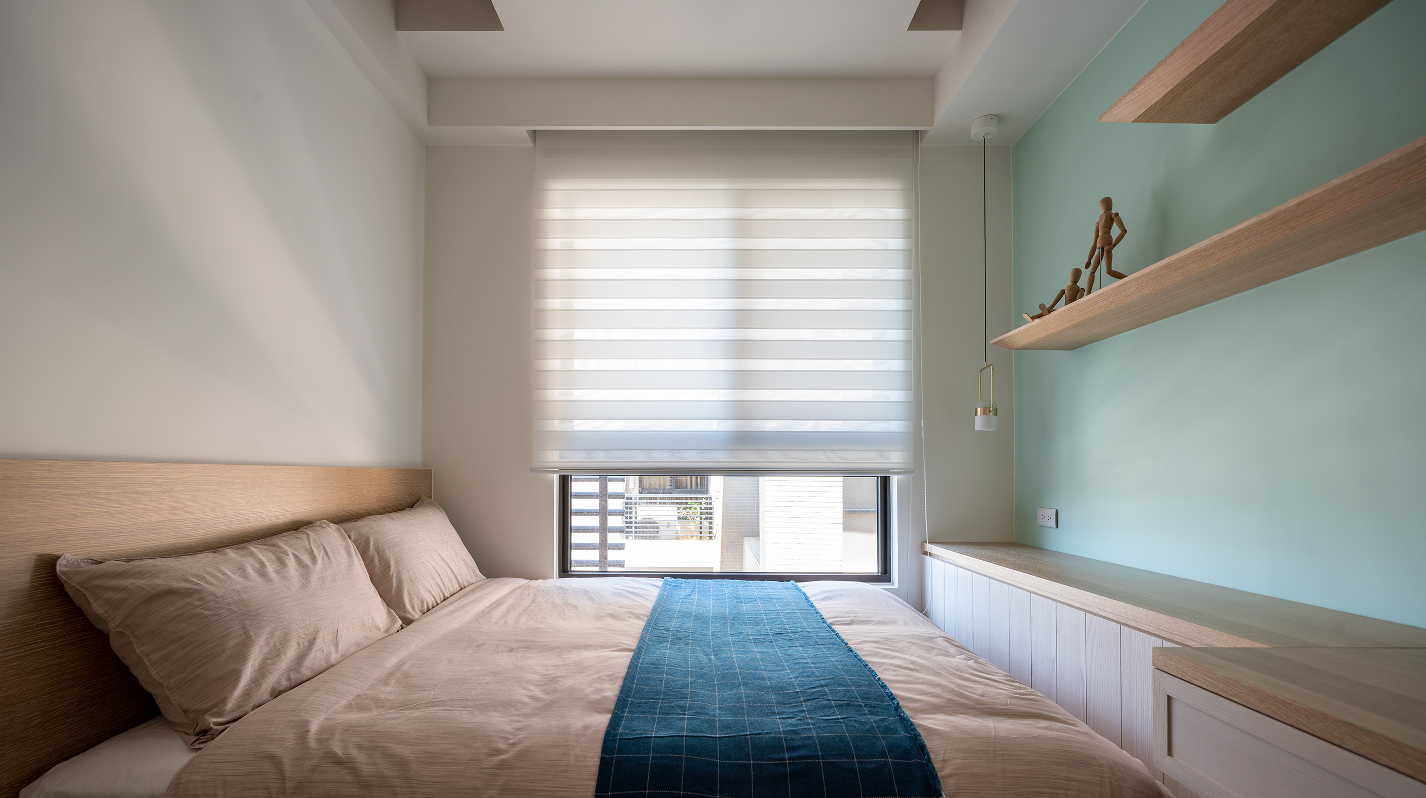 一開始我們將在走道動線上的餐廳空間注入了一個中島,讓走道形成一個環狀動線,帶動了每個空間的連結,並且將各空間門框收成暗門,讓餐廳空間更加舒適。 此案的天花板因消防空調管線問題較為壓迫,因此我們想到以”摺”為槪念,植入在天花、牆面及櫃體,閃避不能更動的現況,爭取空間高度並且營造燈光氛圍。 最後我們將主臥以深色為主,有別於其它空間的明亮色系,讓生活增添更多層次與風格。