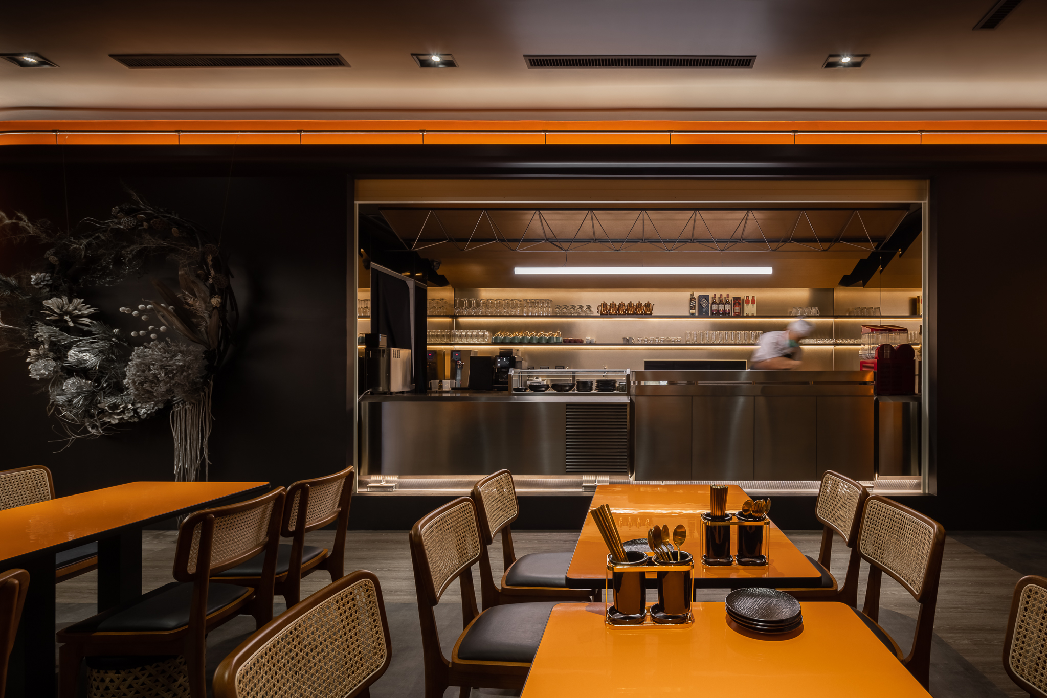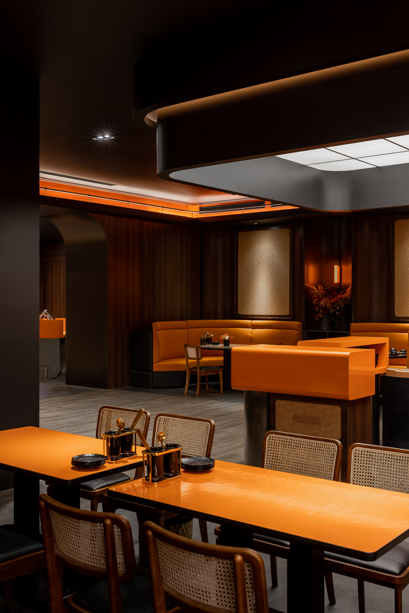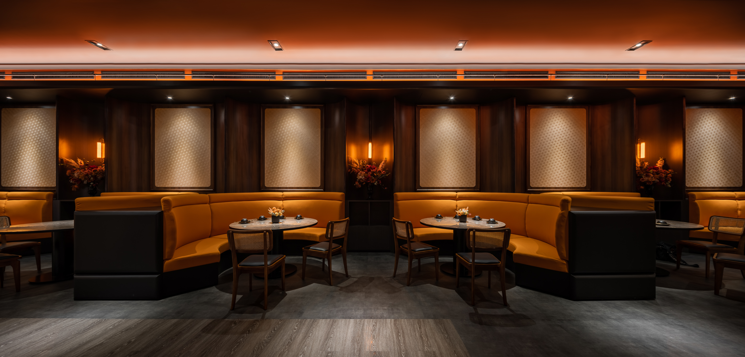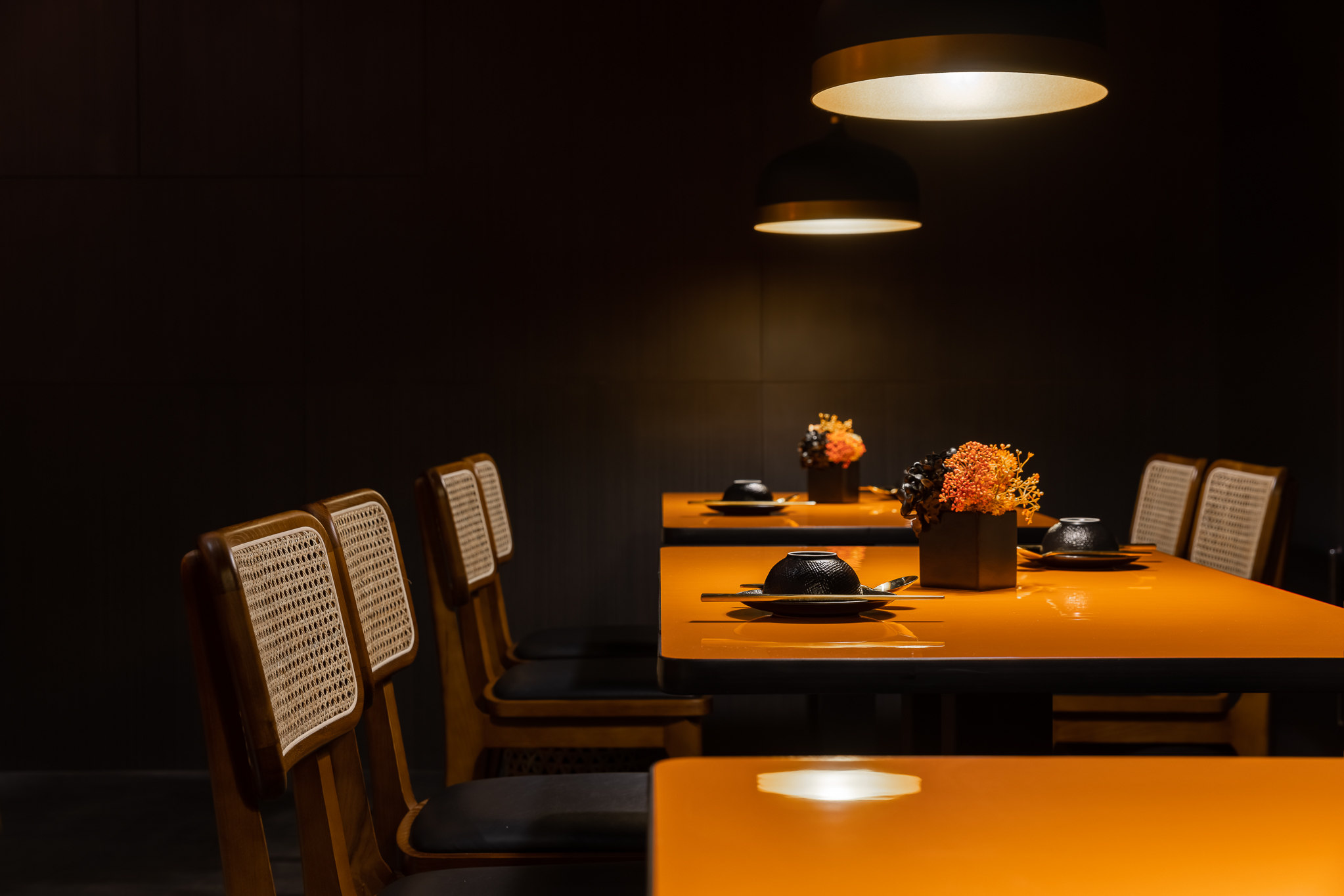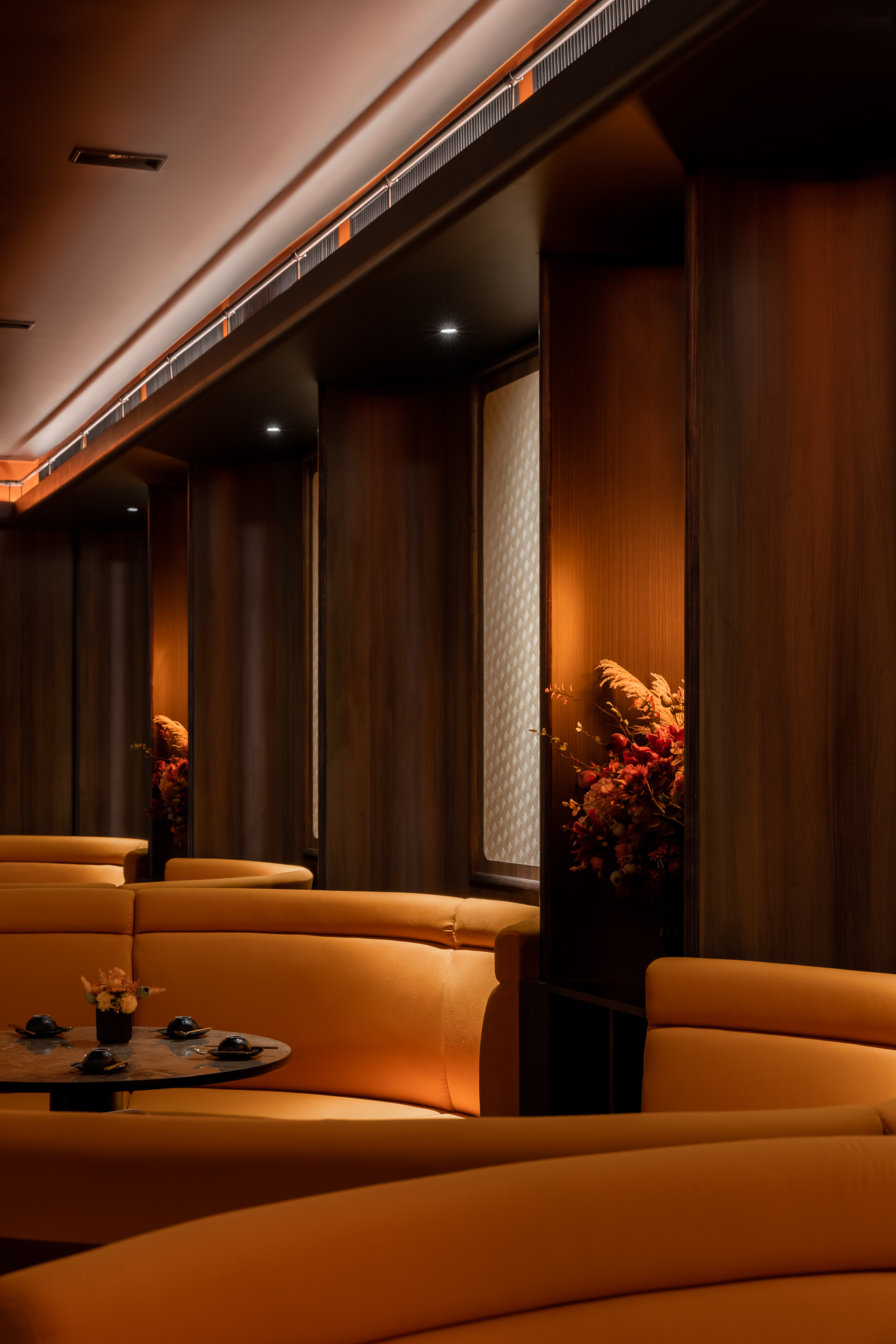 從料理人之間的比劃,到食客彼此的鬥嘴,餐桌彷彿一場武林,連綿的弧形背牆在進退間劃分出每個座席的區間, 形成了襯托這場盛宴的風景,點綴於其中的橘色光源,暈染出如同晚霞的餘暉。