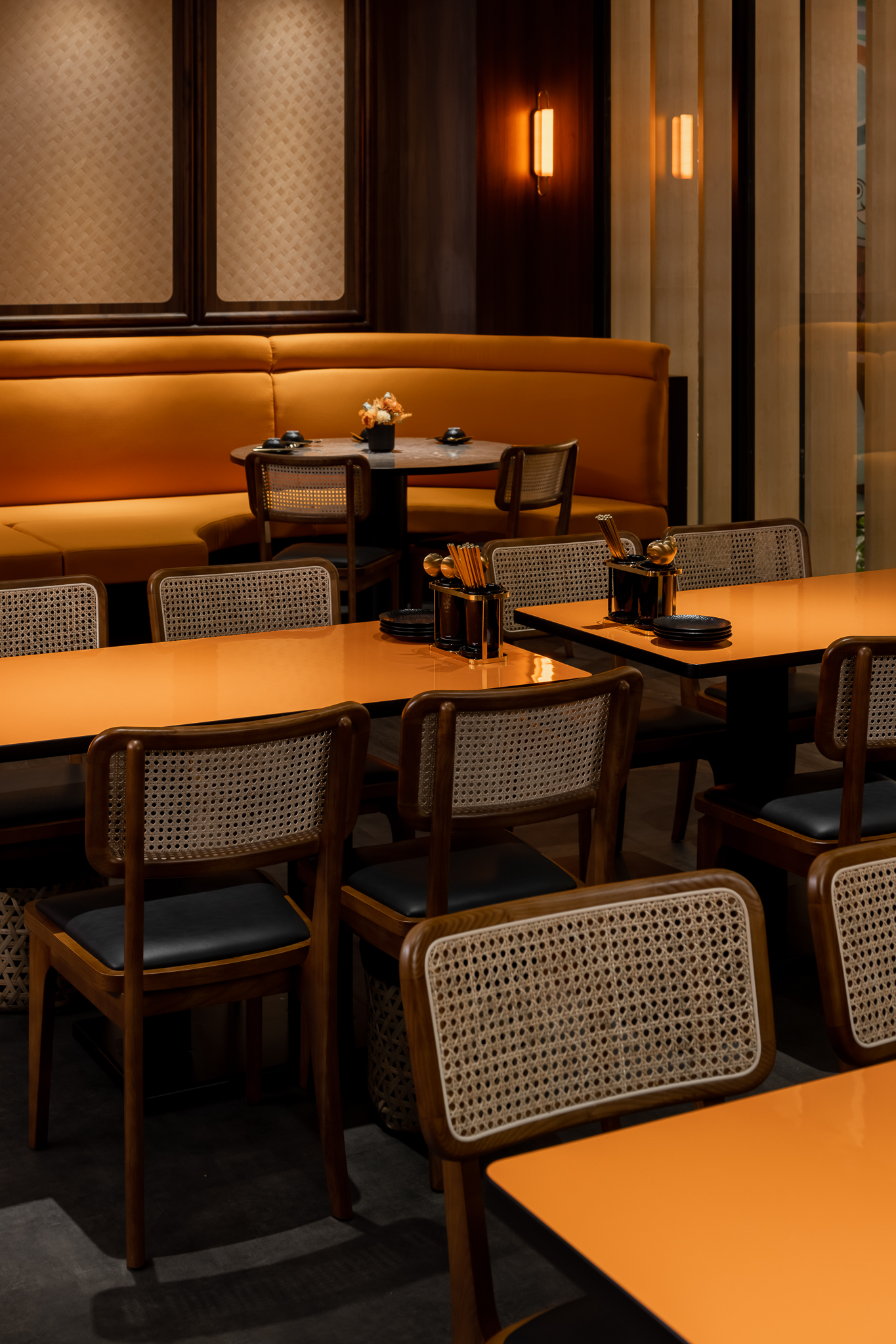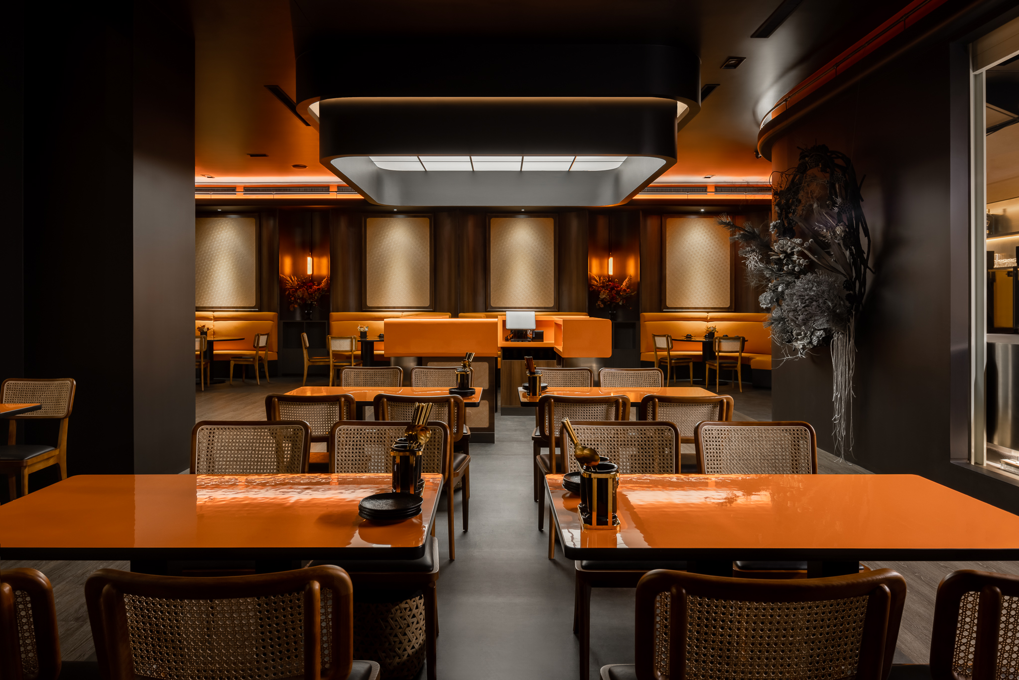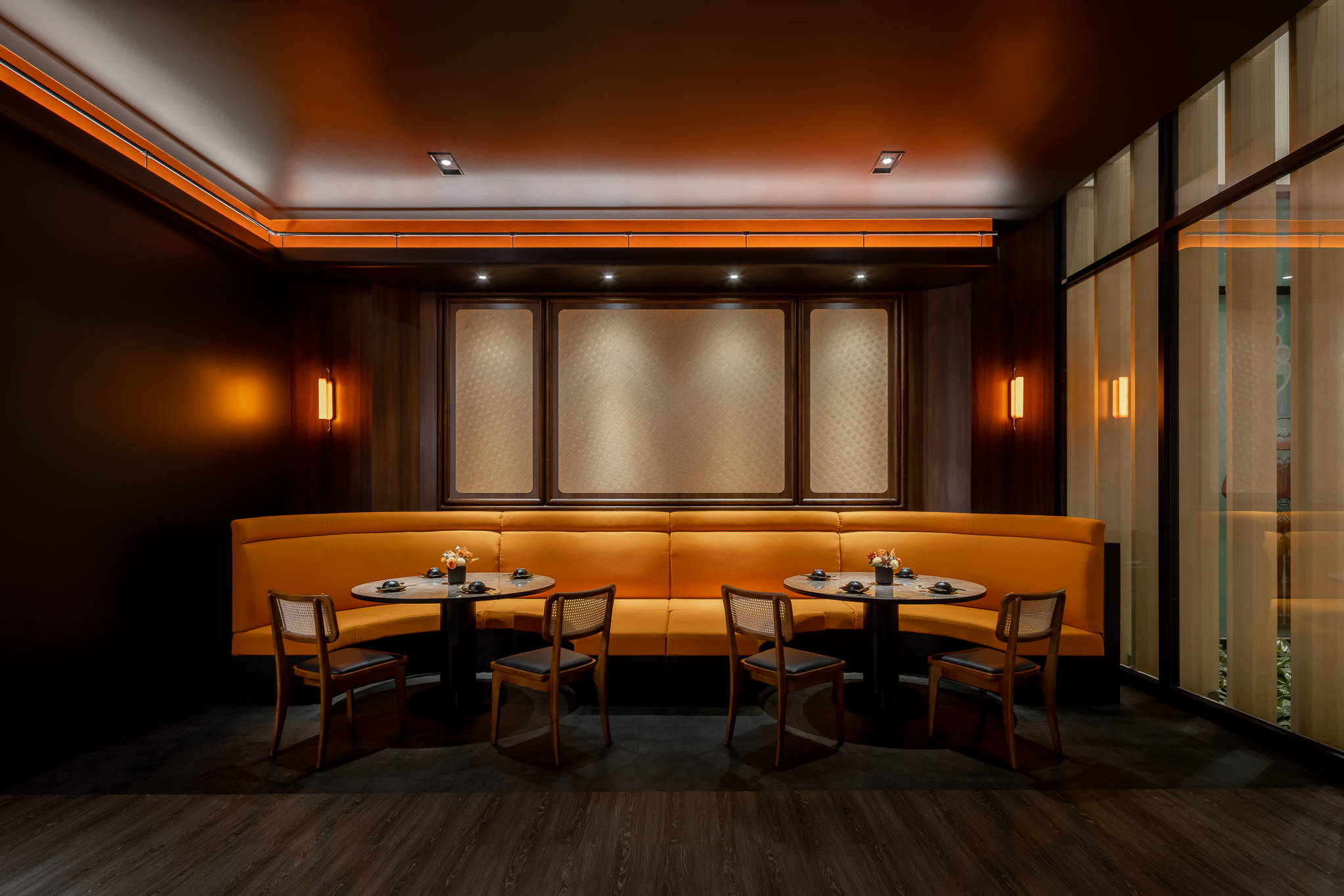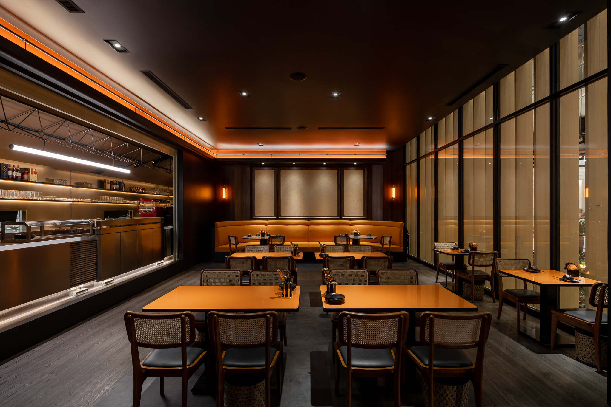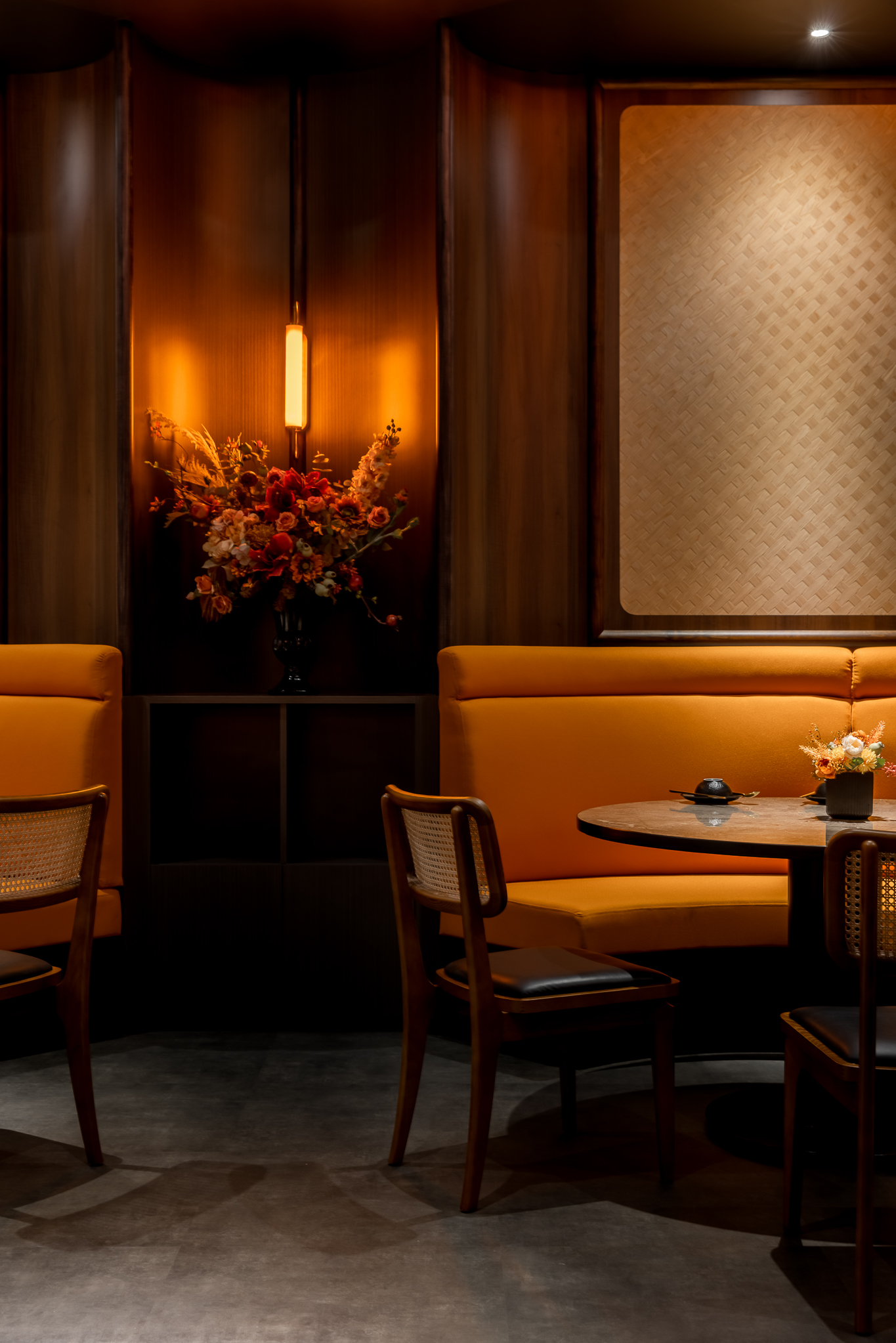 從料理人之間的比劃,到食客彼此的鬥嘴,餐桌彷彿一場武林,連綿的弧形背牆在進退間劃分出每個座席的區間, 形成了襯托這場盛宴的風景,點綴於其中的橘色光源,暈染出如同晚霞的餘暉。