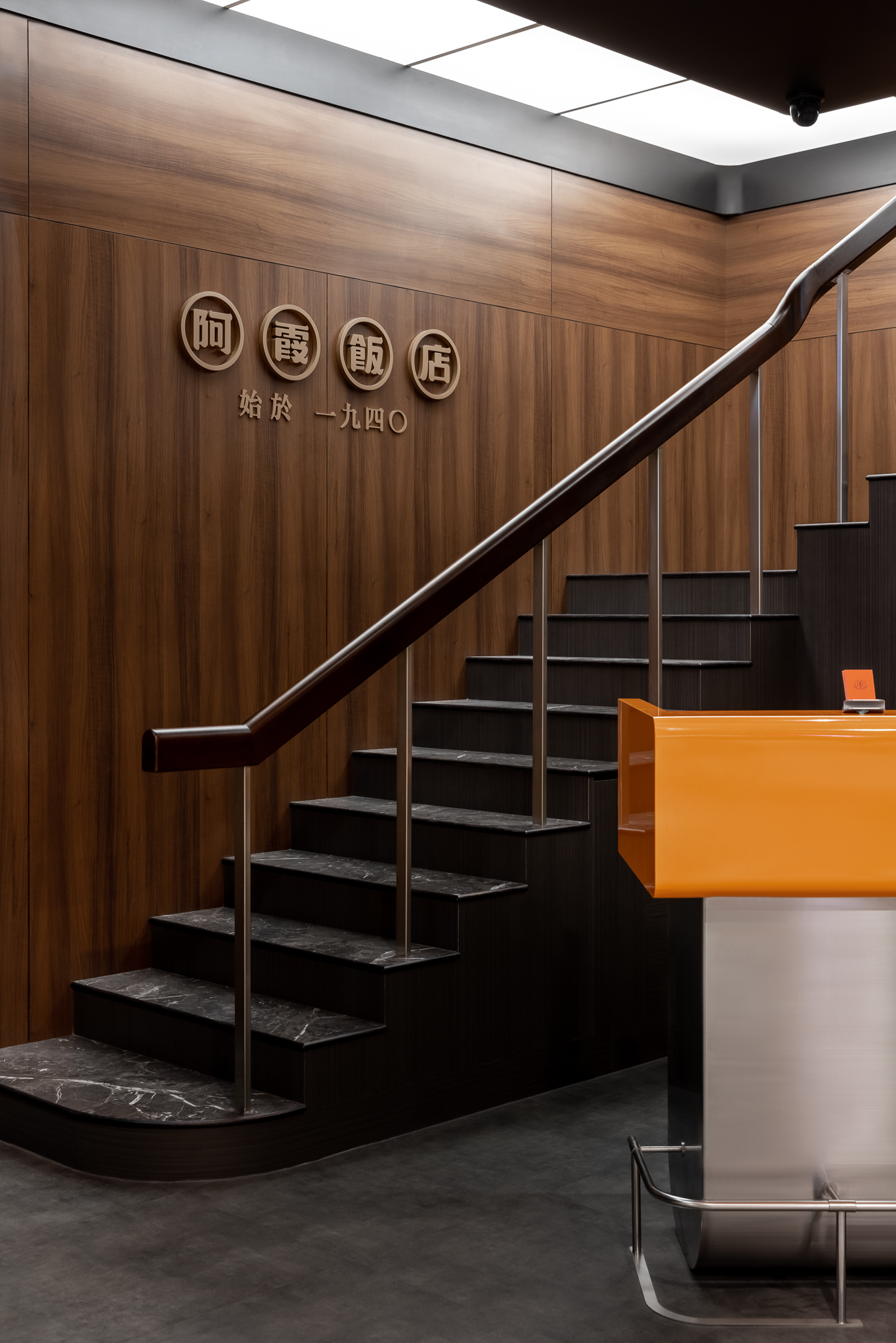 整體氛圍調性以深色為盤,盛裝招牌菜–海味紅蟳的橘,創造內斂穩重的用餐體驗。迎賓起點沿襲阿霞飯店原址的空間記憶:映入眼簾的場景,是一道轉折向上的階梯,隱隱透光的高點在遠觀之際便有了複層的想像,入口梯廳承接通往二樓的遐思,用餐區域的天花挑出一定深度,透過欄杆的安排創造二樓看台般的存在,同時整合間接照明的表現、在頂部圍塑出連貫的線段。外場站點將「霞」字解構並收斂為幾何量體,在空間中錨定了服務的核心,依其形廓發散出座席間的路徑。