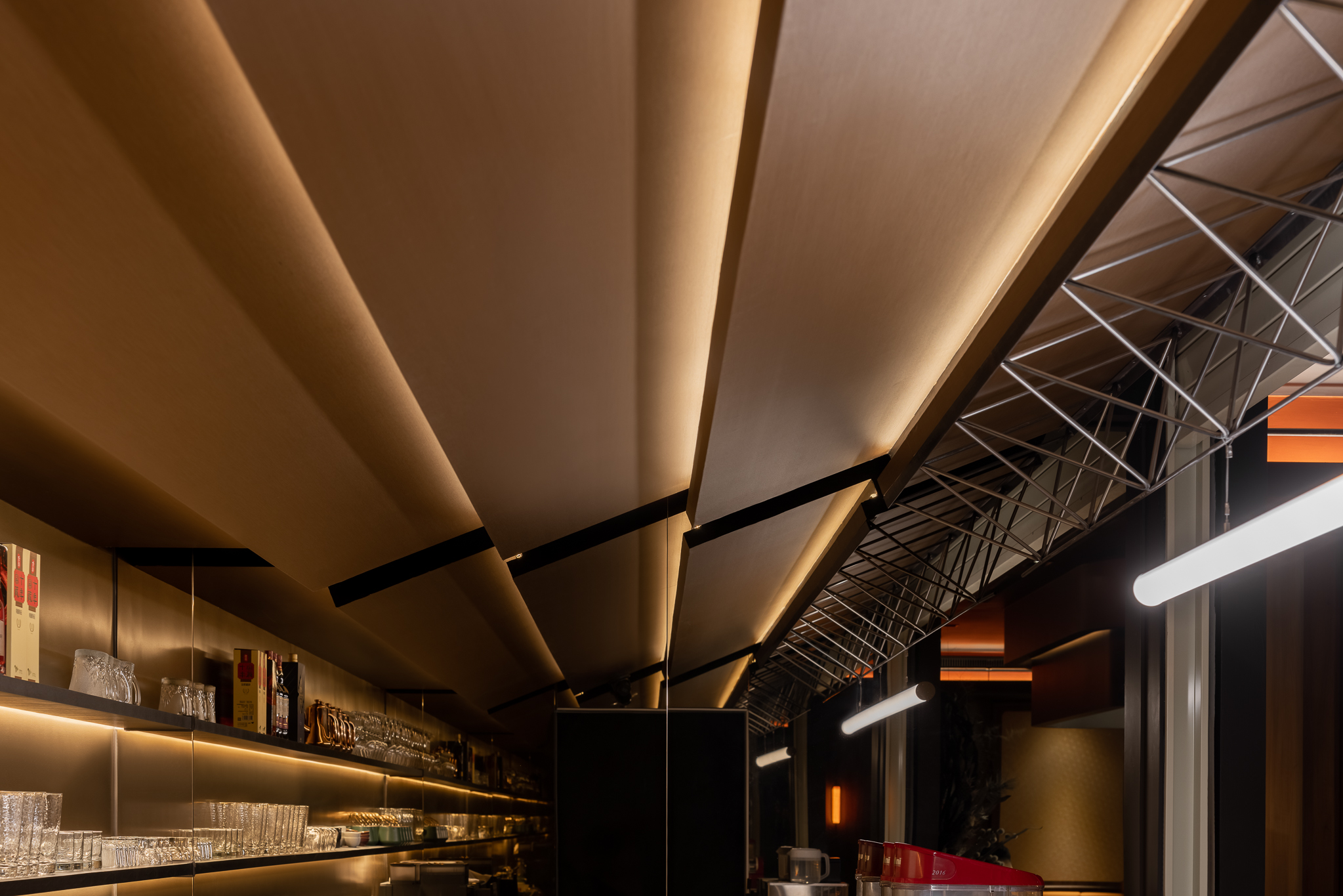 圓形卡座保留了包廂圍合的領域感,敞開的配置寬容地迎接客人入座。藉由材質與比例的搭配,組合出柔中帶剛、豐盛圓潤的厚實感。吧台備料區則從品牌歷史汲取靈感,採樣街邊的點心攤車及早期屋頂力霸鋼架元素,鋪敘過往家常的情感與印象,藉由分層的斜面天花過渡出立面的線條,在框景作用的視覺下,讓備餐與出餐過程也具備了觀賞性。
