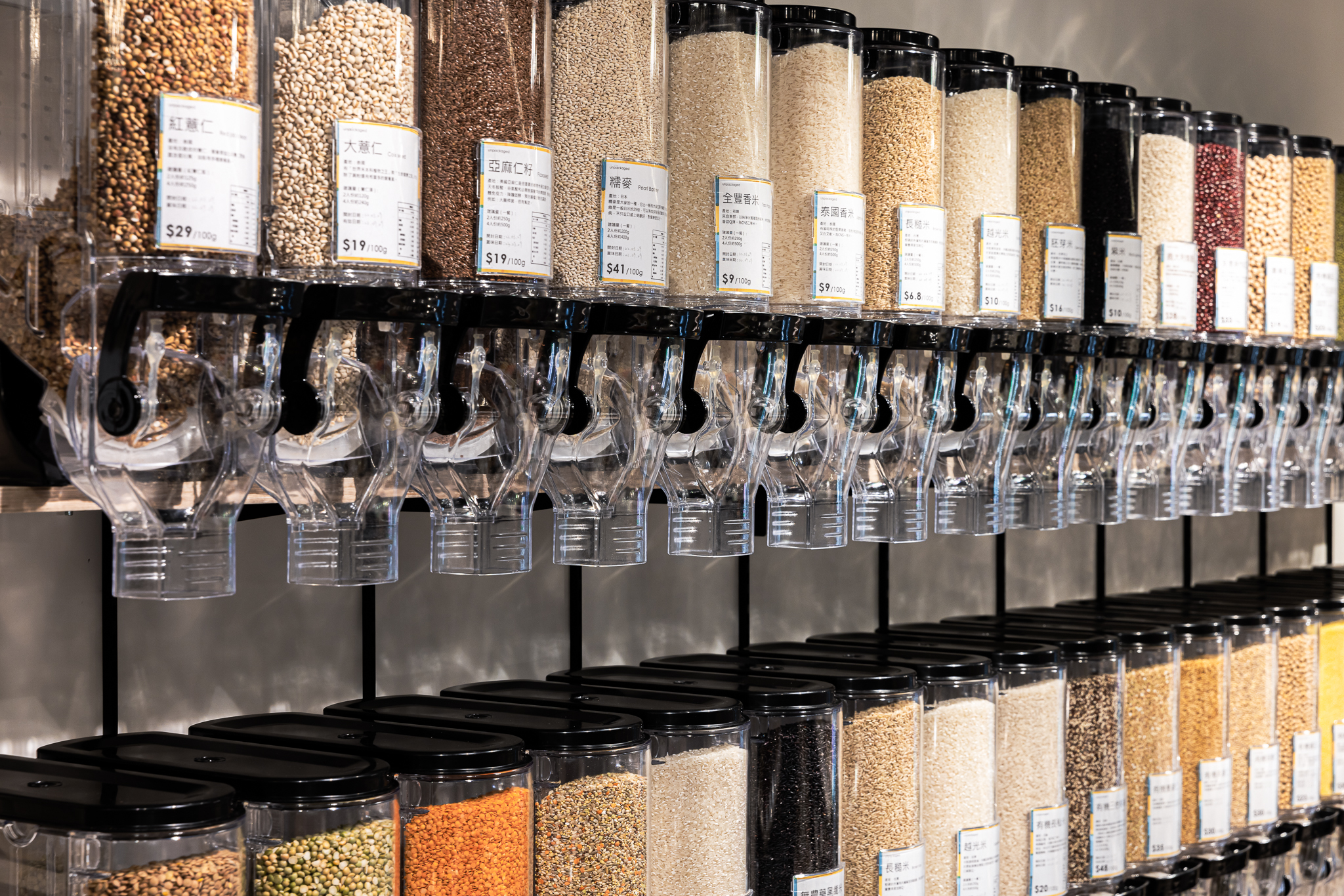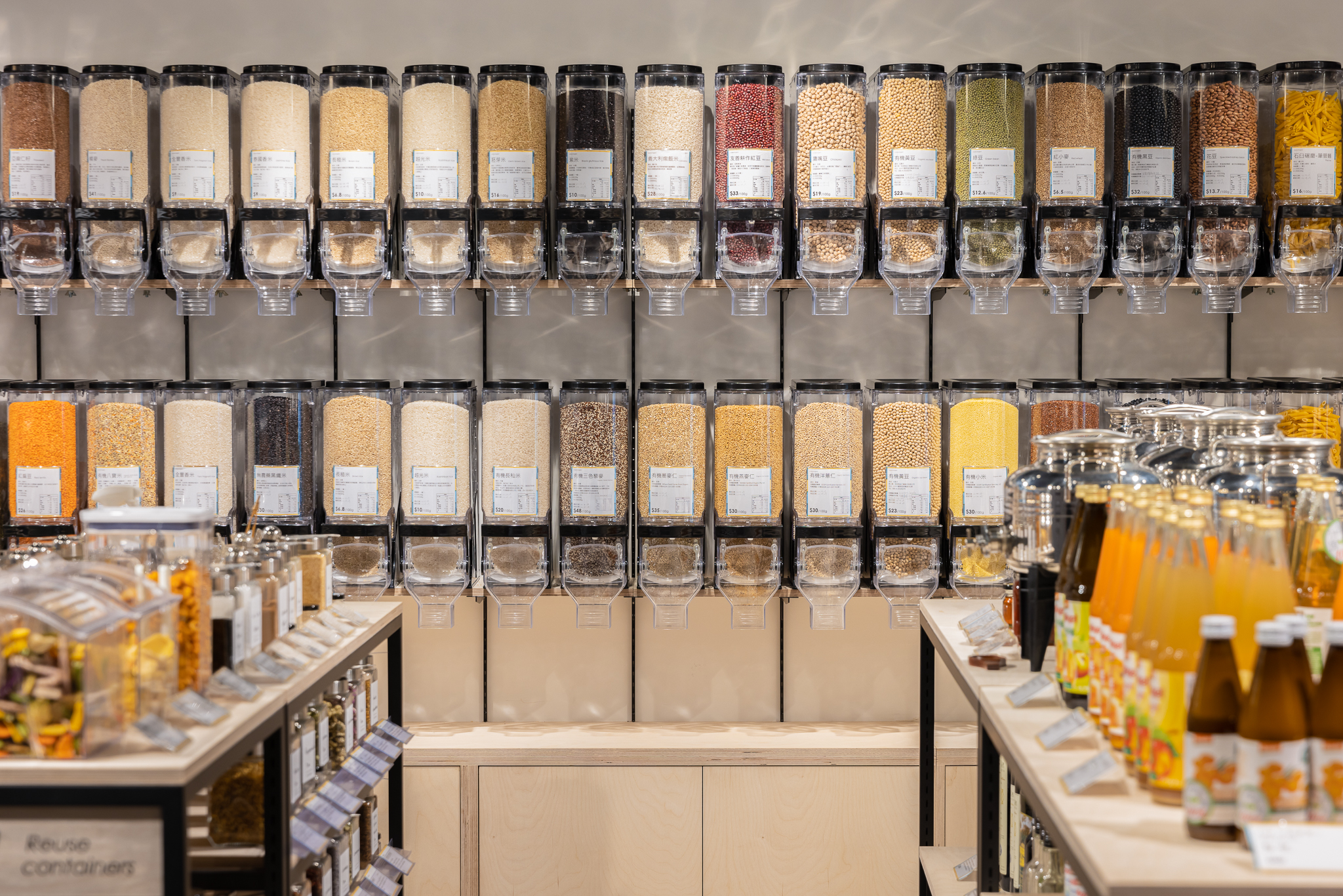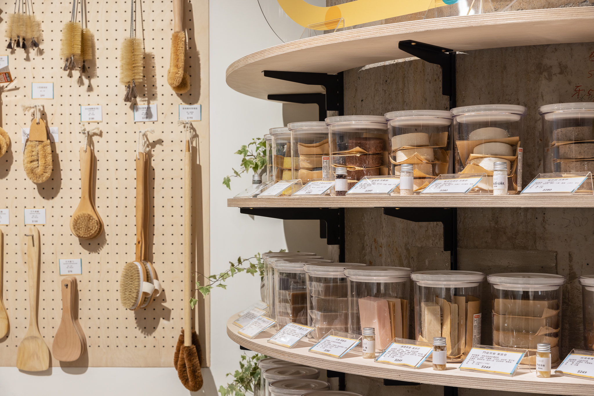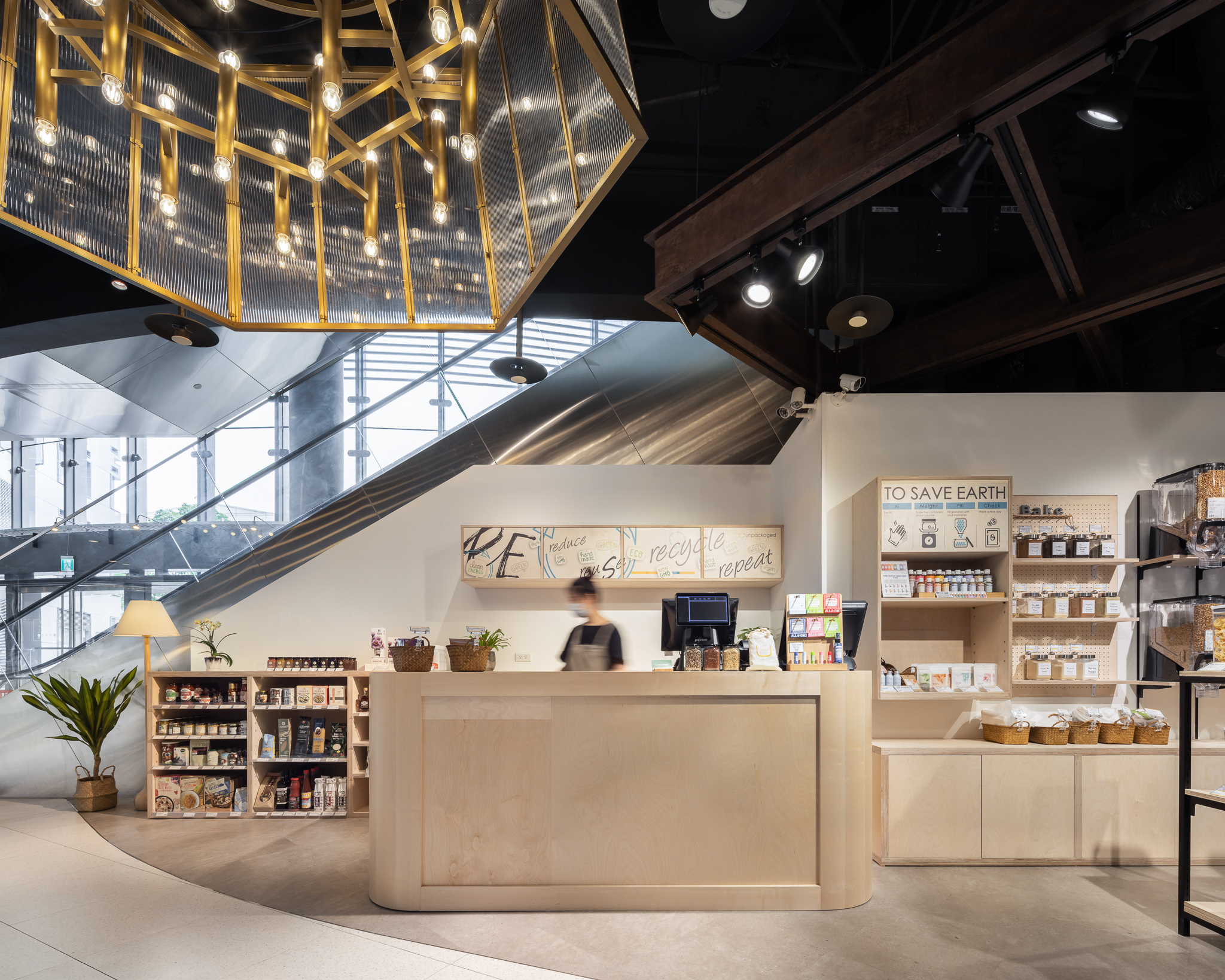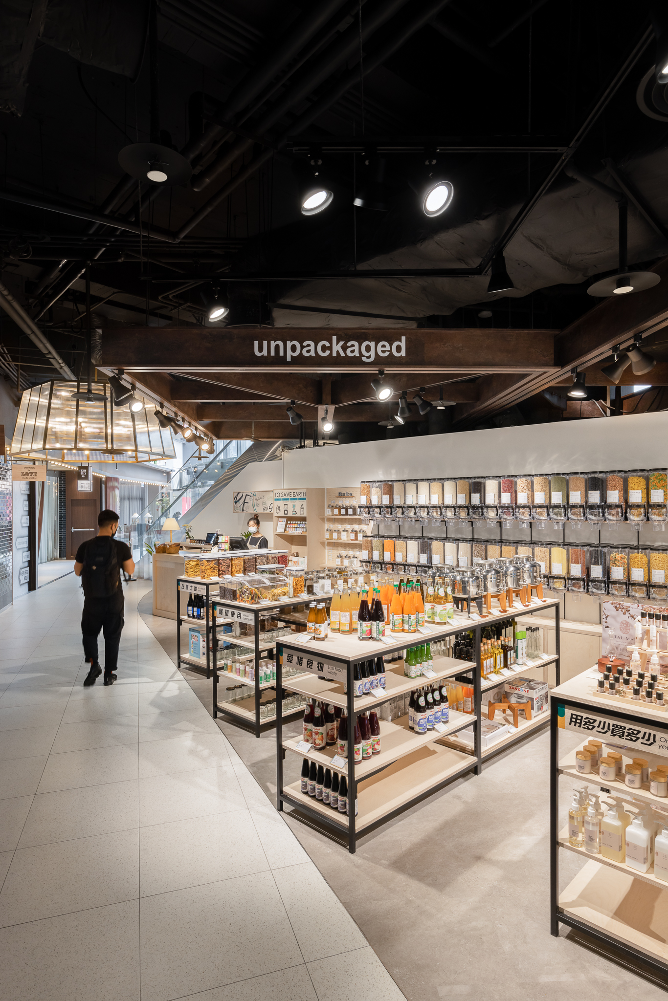 Reflecting the “unpackaged” core value of this environmentally friendly shop, we used natural and minimally processed materials as the main components, keeping the original ceiling structure and granite flooring to create a rustic yet delicate ambience with fiberboards, simple shelves, and bamboo baskets.