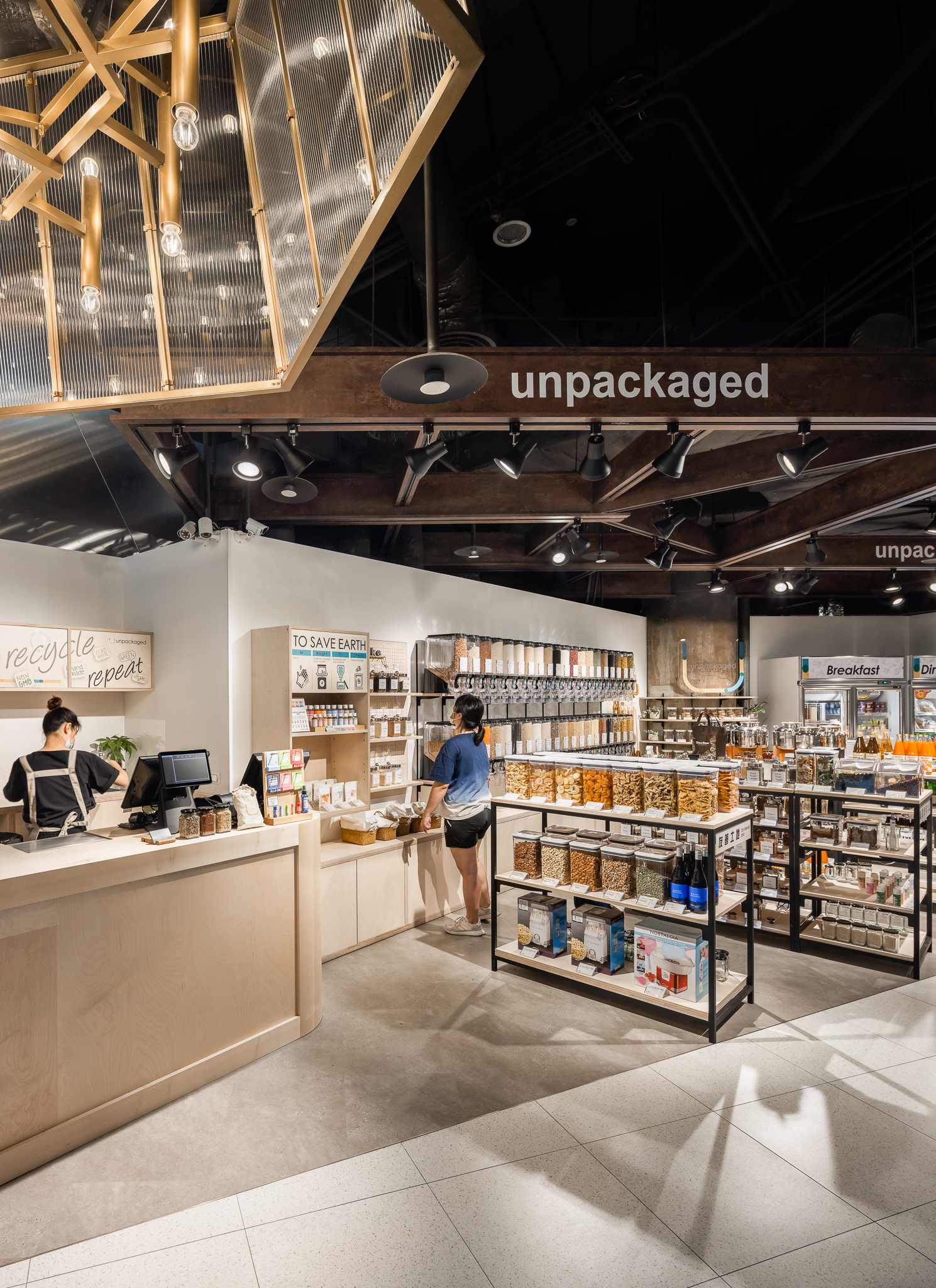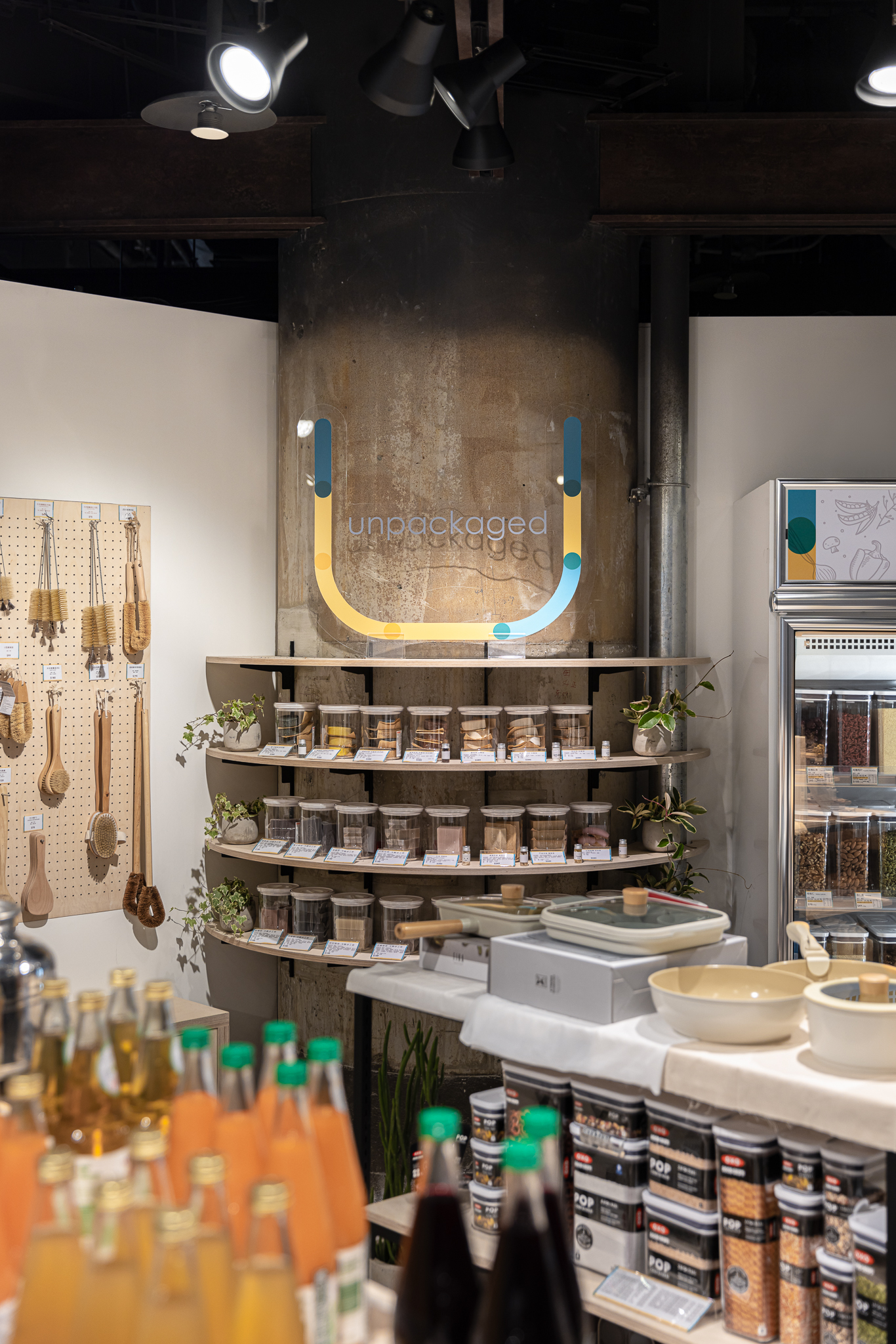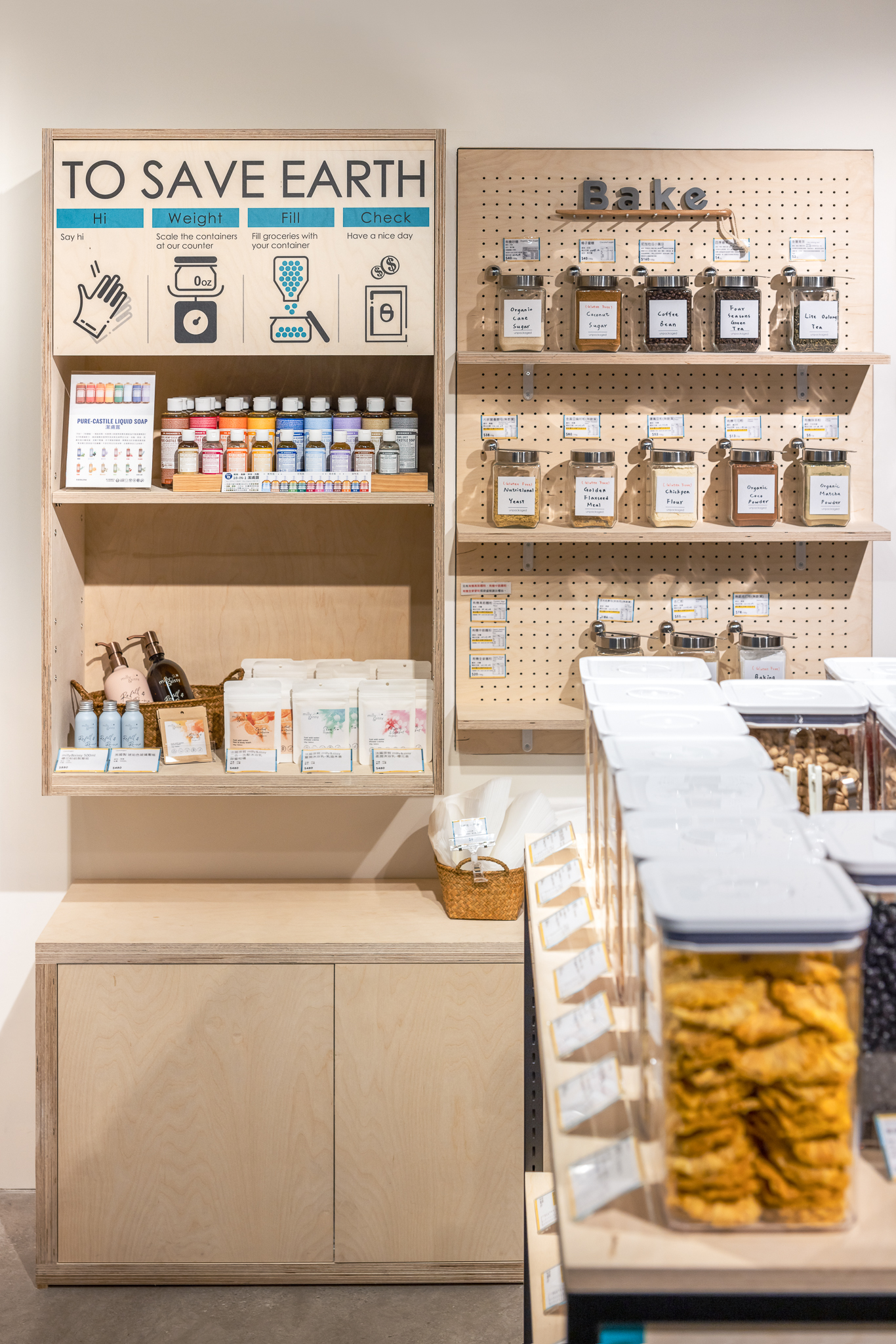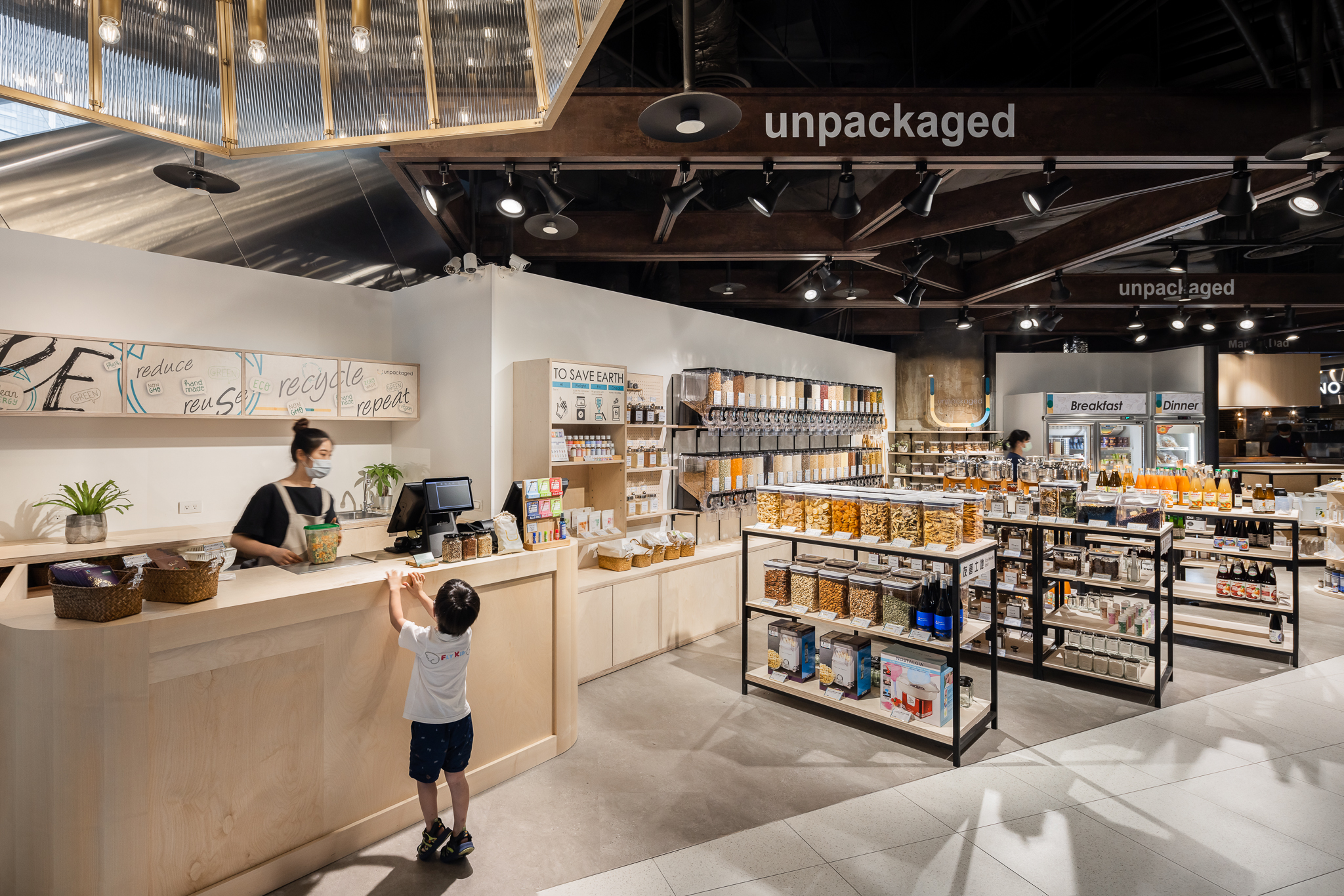 回應「Unpackaged」無包裝商店的友善地球理念,以自然、微加工的材質作為主軸-延用原有天花板骨架與花崗岩地板,選用纖維板及簡易櫃體、竹編籃呈現自然裸質感的空間氛圍。