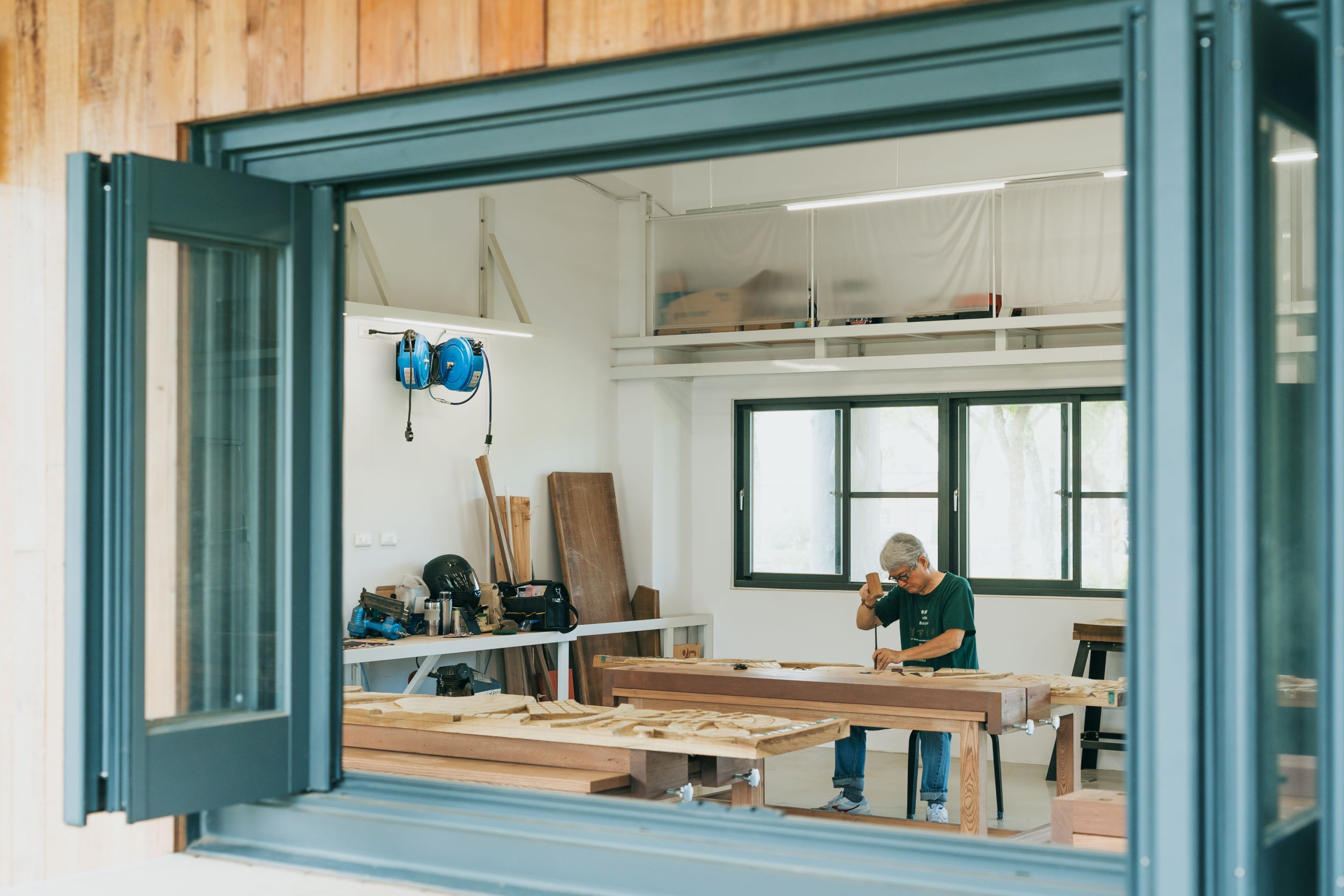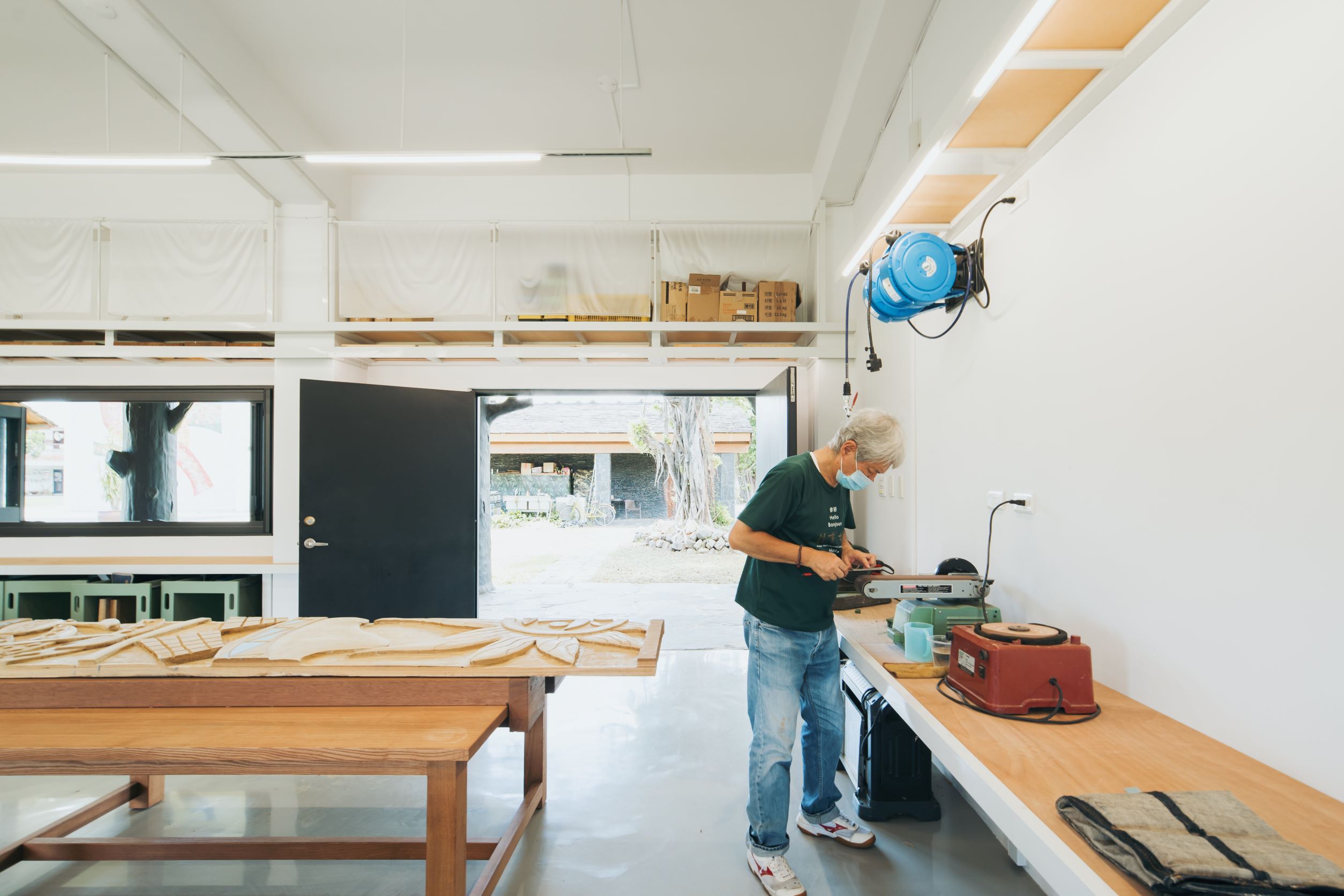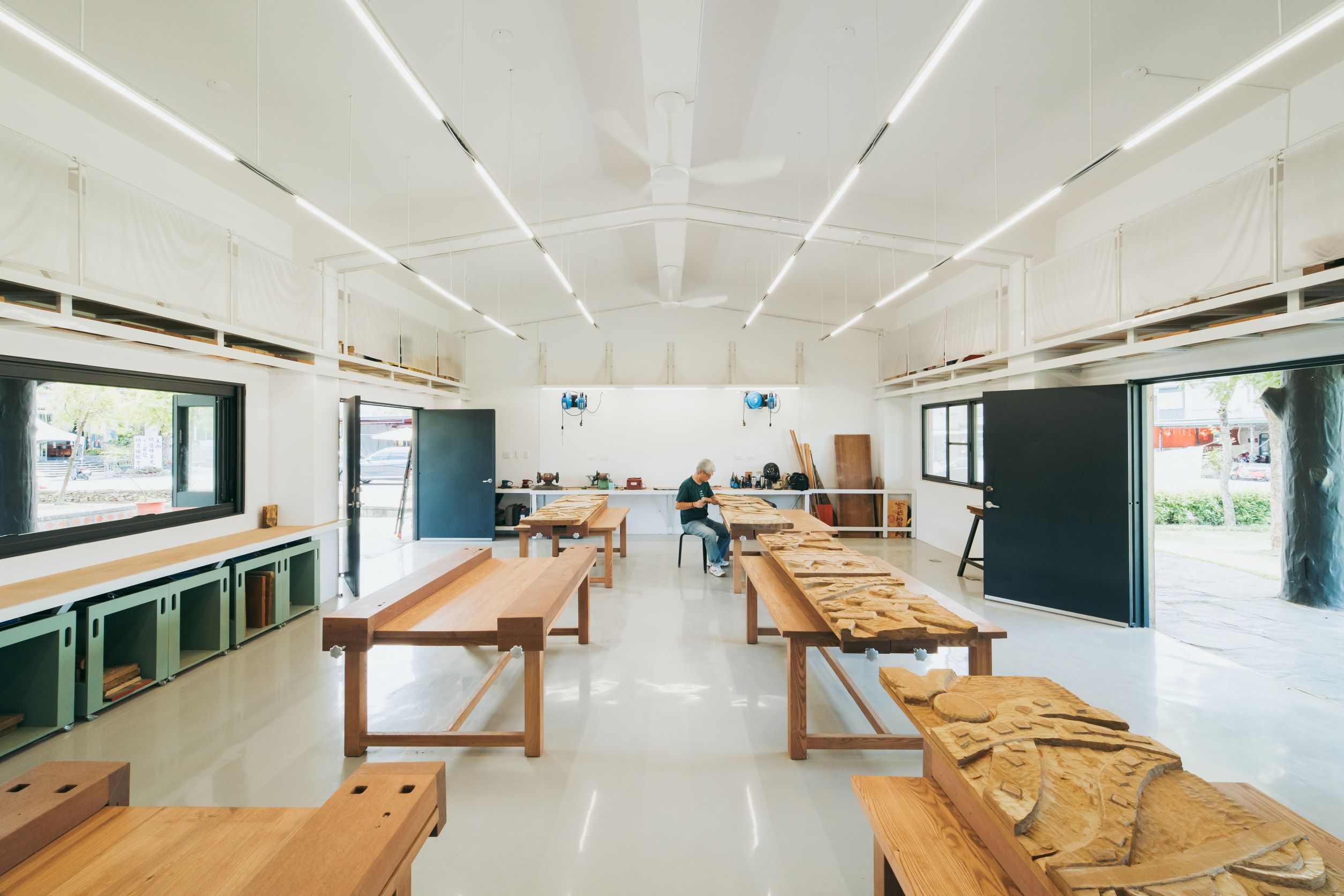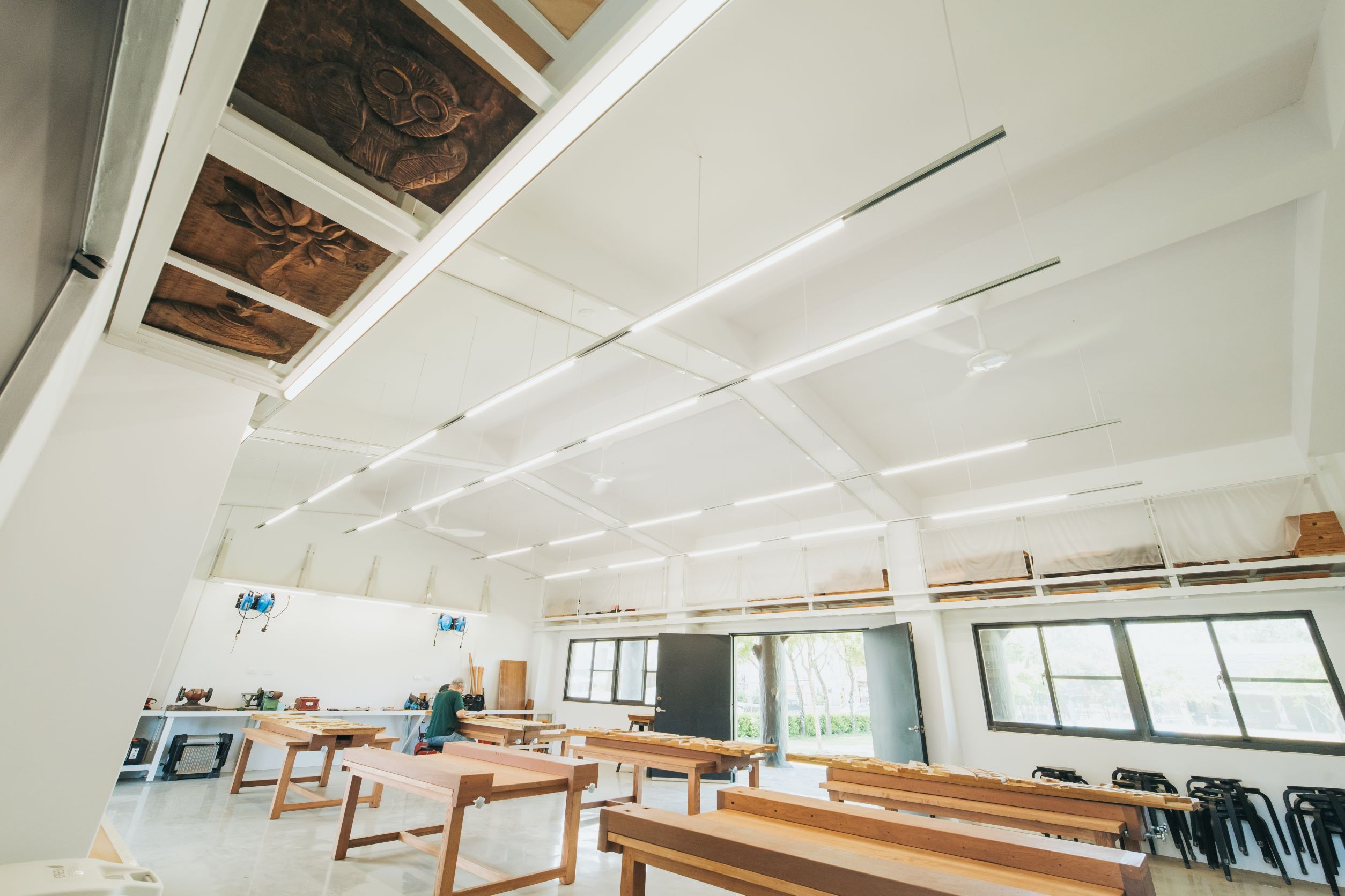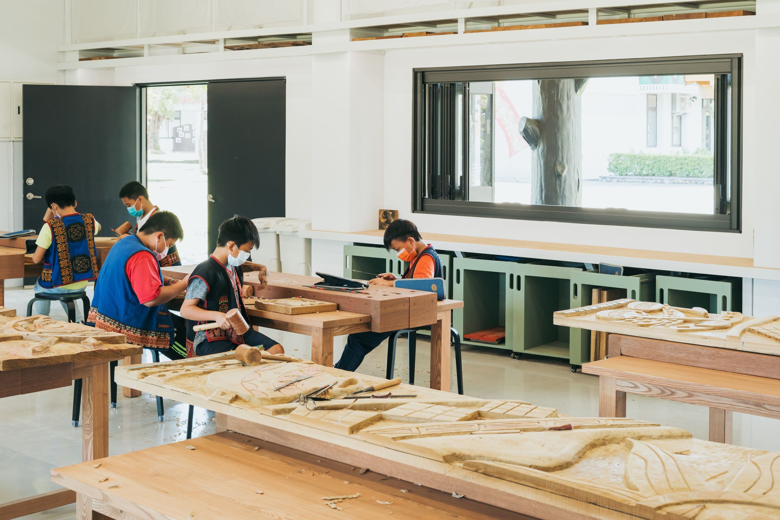 系統性的整合使用機能,搭配訂製的實木木桌及工具推車,用以收納學童未完成之作品及雕刻用具,並保留移動彈性;折窗的更換打開新的視覺軸線,與對側石板屋產生連結,與校園、師生間產生互動與對話;重新配置的空間照明及循環電扇,改善空氣對流及視覺整體性。