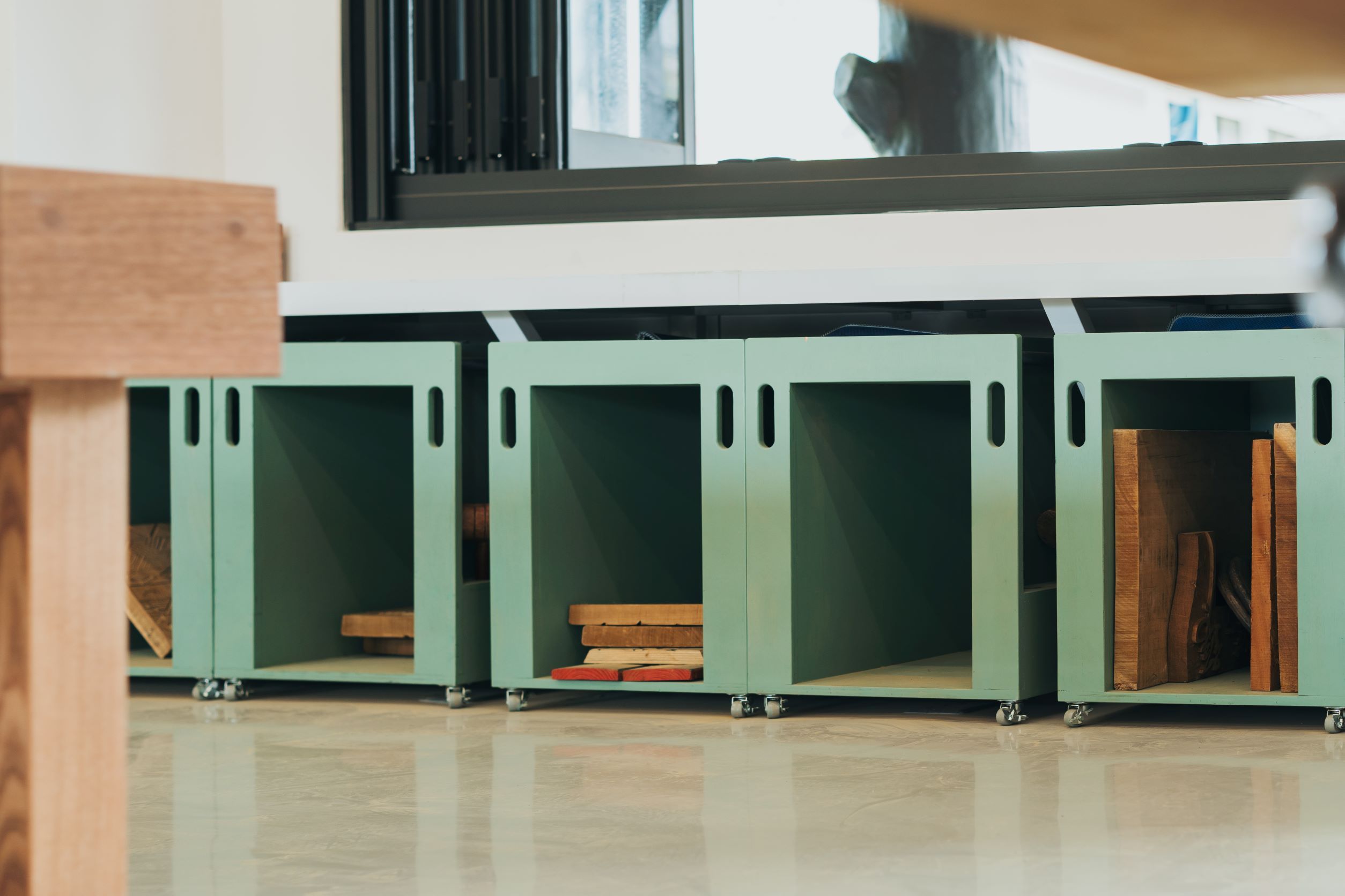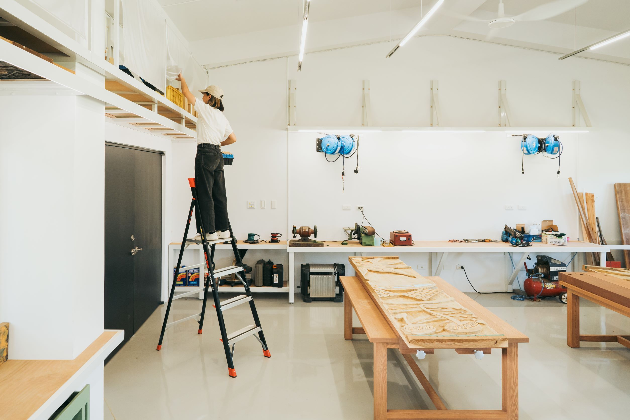 本次改造的標的為校園中的木工教室,在過去因為缺少了系統性的規劃、收納空間不足,導致作品、材料只能堆放於桌面與地上,大量的物品佔據了教室空間,也淹沒了創作被展示出來的可能。