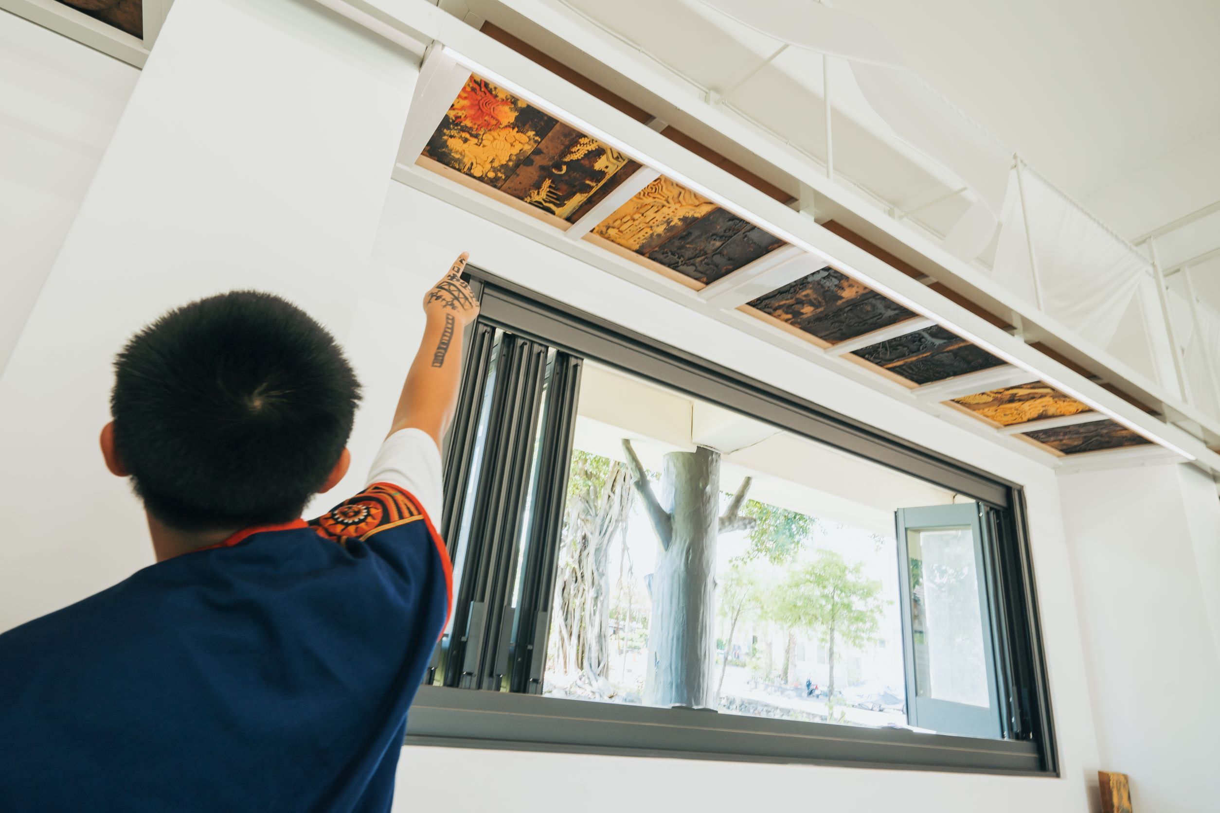 我們重新將教室的焦點回歸到孩子們的創作及活動上:上抬的收納機能保留了下方最大的空白活動空間,透過翻轉作品呈現方式成為空間語彙,膠捲般的影格收錄著這些美好作品及排灣族的珍貴故事,並與進行中的創作相映成輝。