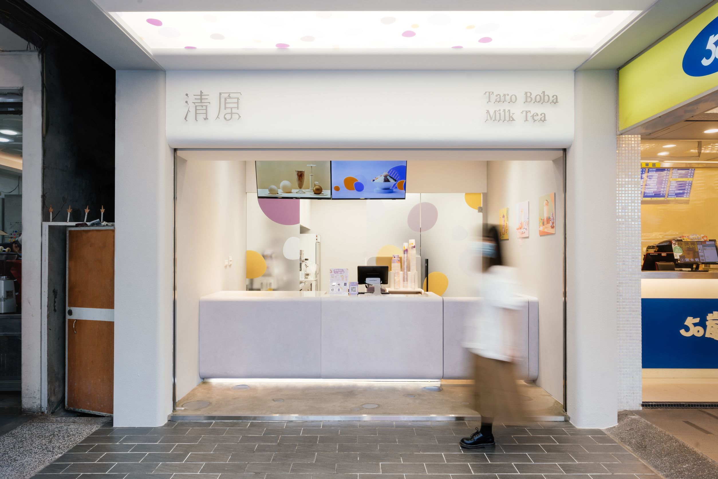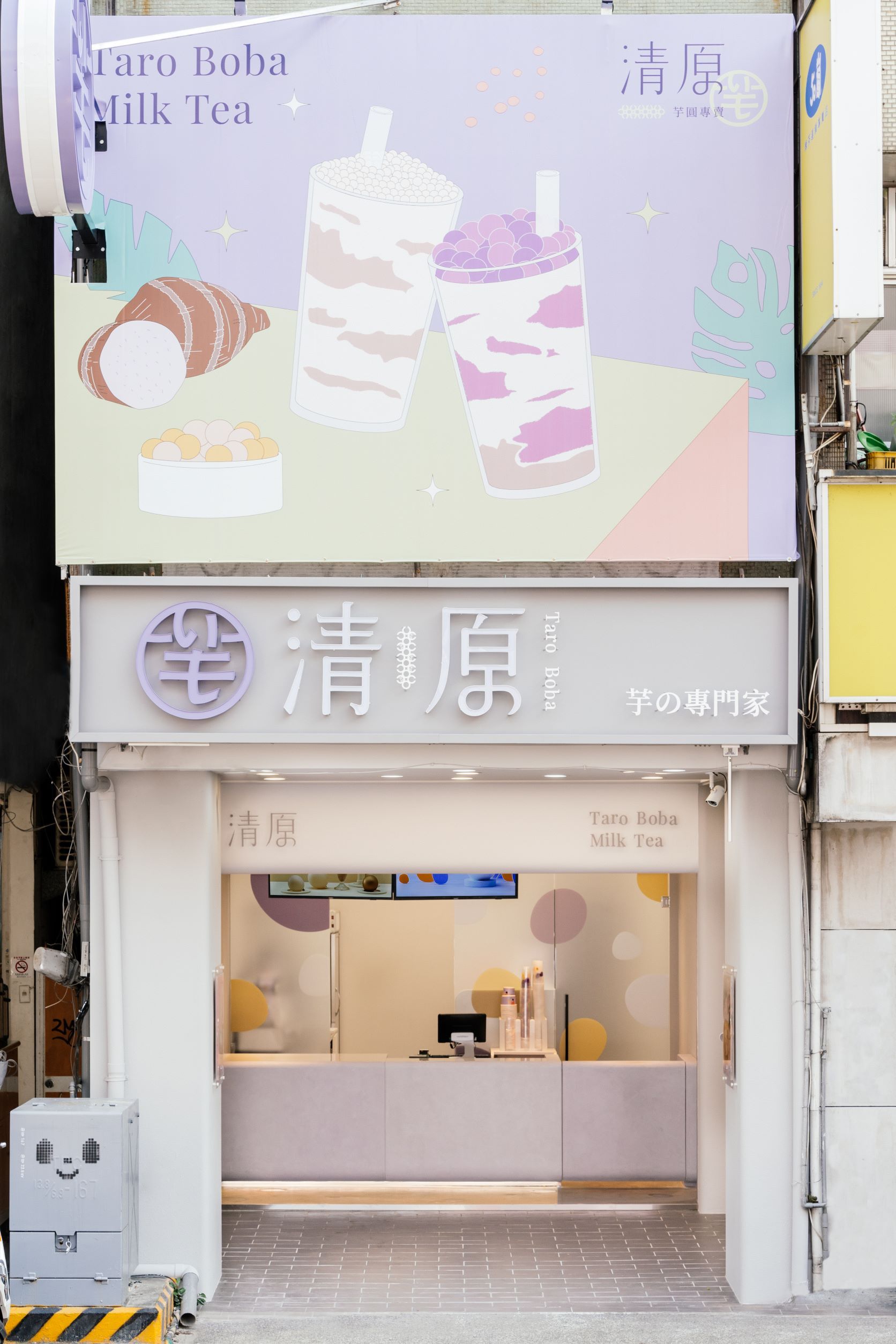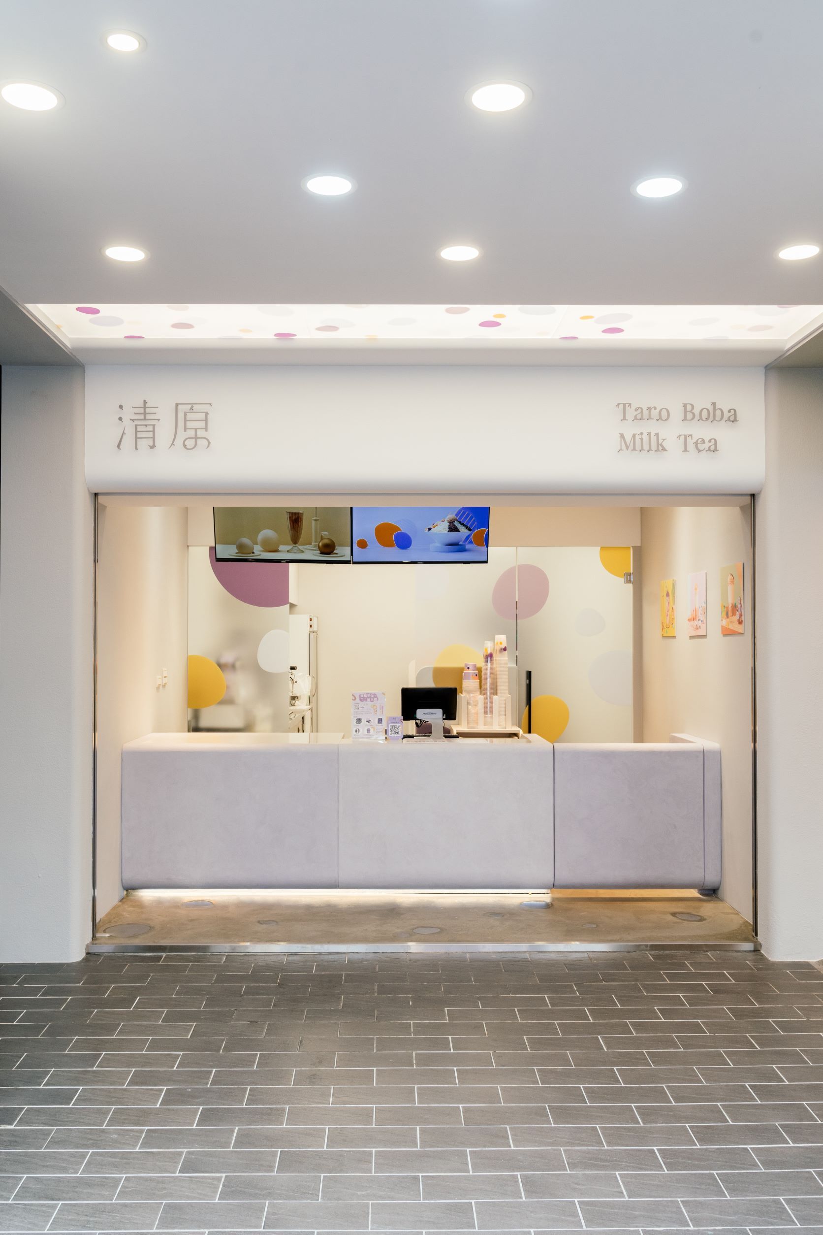 作為4.0店體轉型的開頭。彡苗以簡單、清爽的面貌,試圖以空間向每一位來訪的顧客介紹最純粹的清原滋味。 設計上萃取了清原甜品的印象,柔順的造型天花如牛奶般從騎樓往店內流入;紫色的櫃台是三顆相互緊靠的芋頭塊,透過圓角與藝術塗料的處理,呈現出芋頭的Q彈及芋泥綿密的口感;候餐時不妨抬頭看看仰望杯底的繽紛視角,滿佈在天花燈箱上漂浮的小芋圓和小紫芋,搭配櫃檯後方的玻璃輸出,層層疊疊出清原甜品與豐富配料的味道及特色。