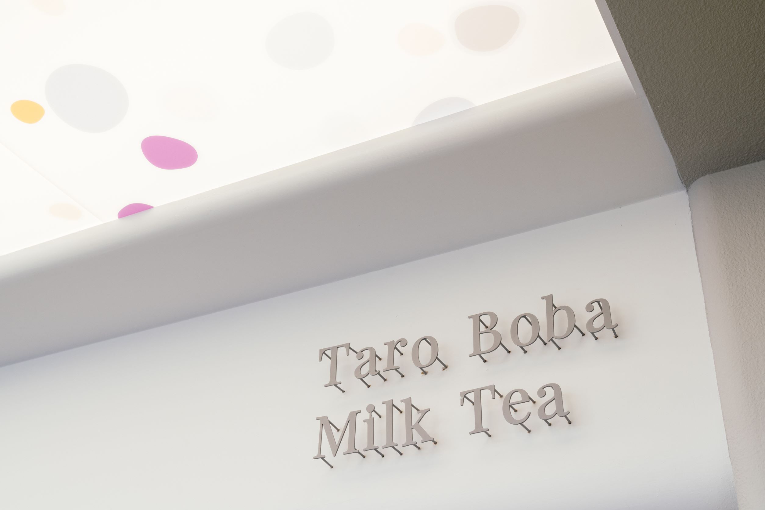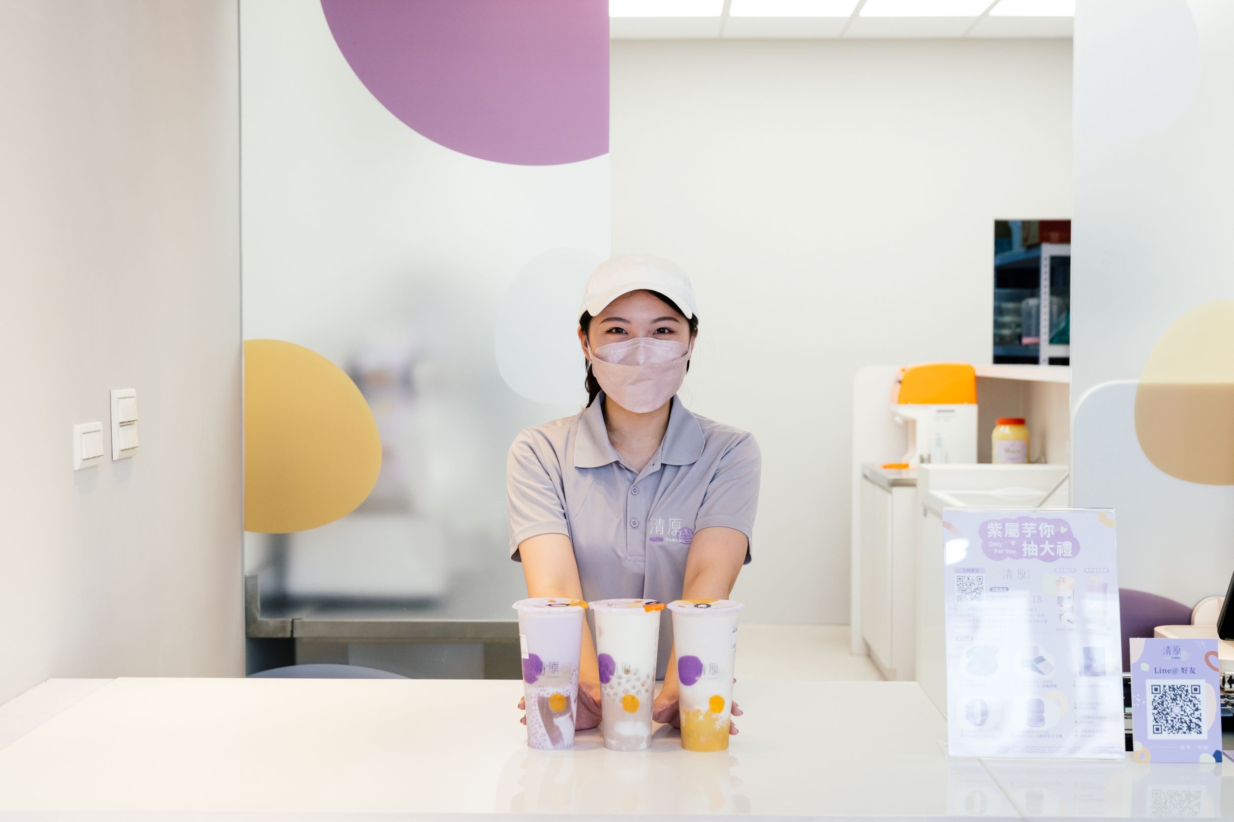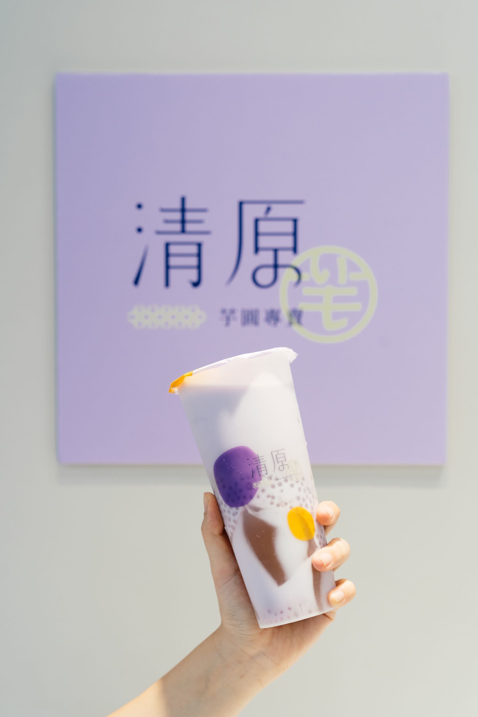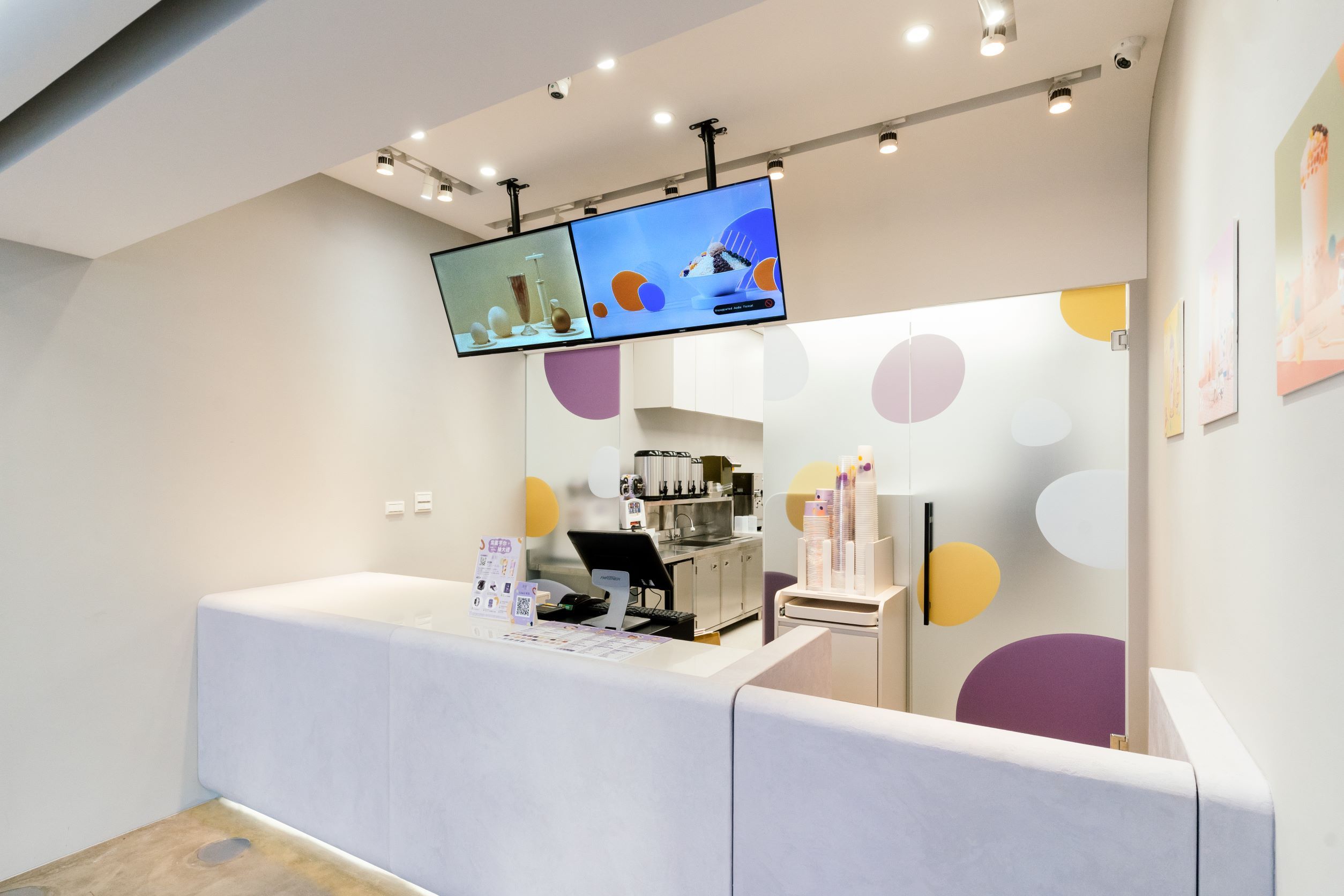 作為4.0店體轉型的開頭。彡苗以簡單、清爽的面貌,試圖以空間向每一位來訪的顧客介紹最純粹的清原滋味。 設計上萃取了清原甜品的印象,柔順的造型天花如牛奶般從騎樓往店內流入;紫色的櫃台是三顆相互緊靠的芋頭塊,透過圓角與藝術塗料的處理,呈現出芋頭的Q彈及芋泥綿密的口感;候餐時不妨抬頭看看仰望杯底的繽紛視角,滿佈在天花燈箱上漂浮的小芋圓和小紫芋,搭配櫃檯後方的玻璃輸出,層層疊疊出清原甜品與豐富配料的味道及特色。