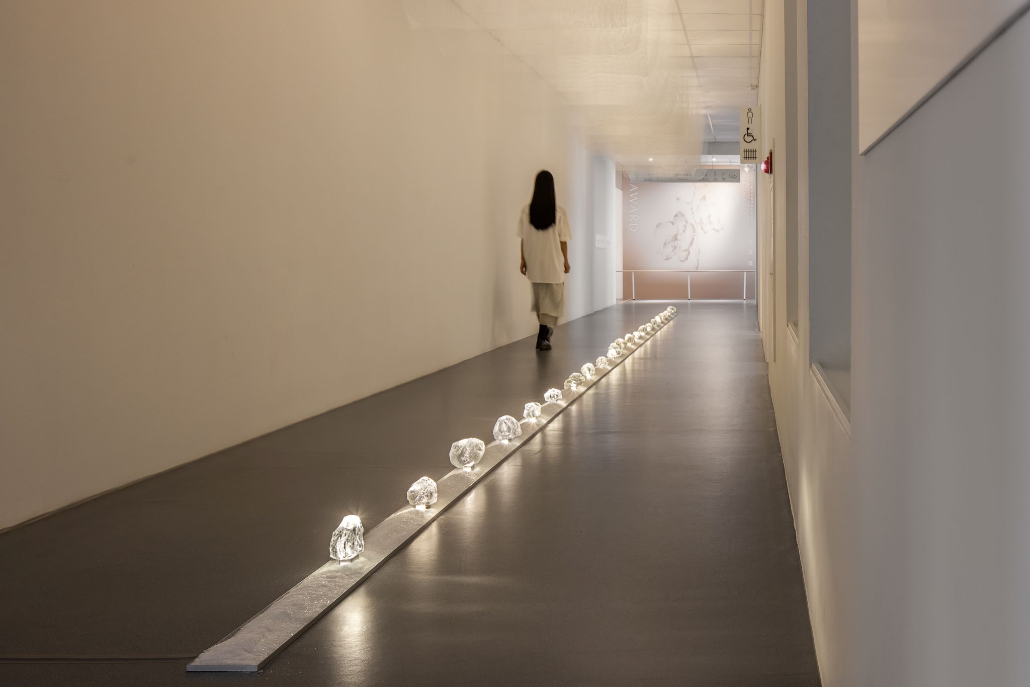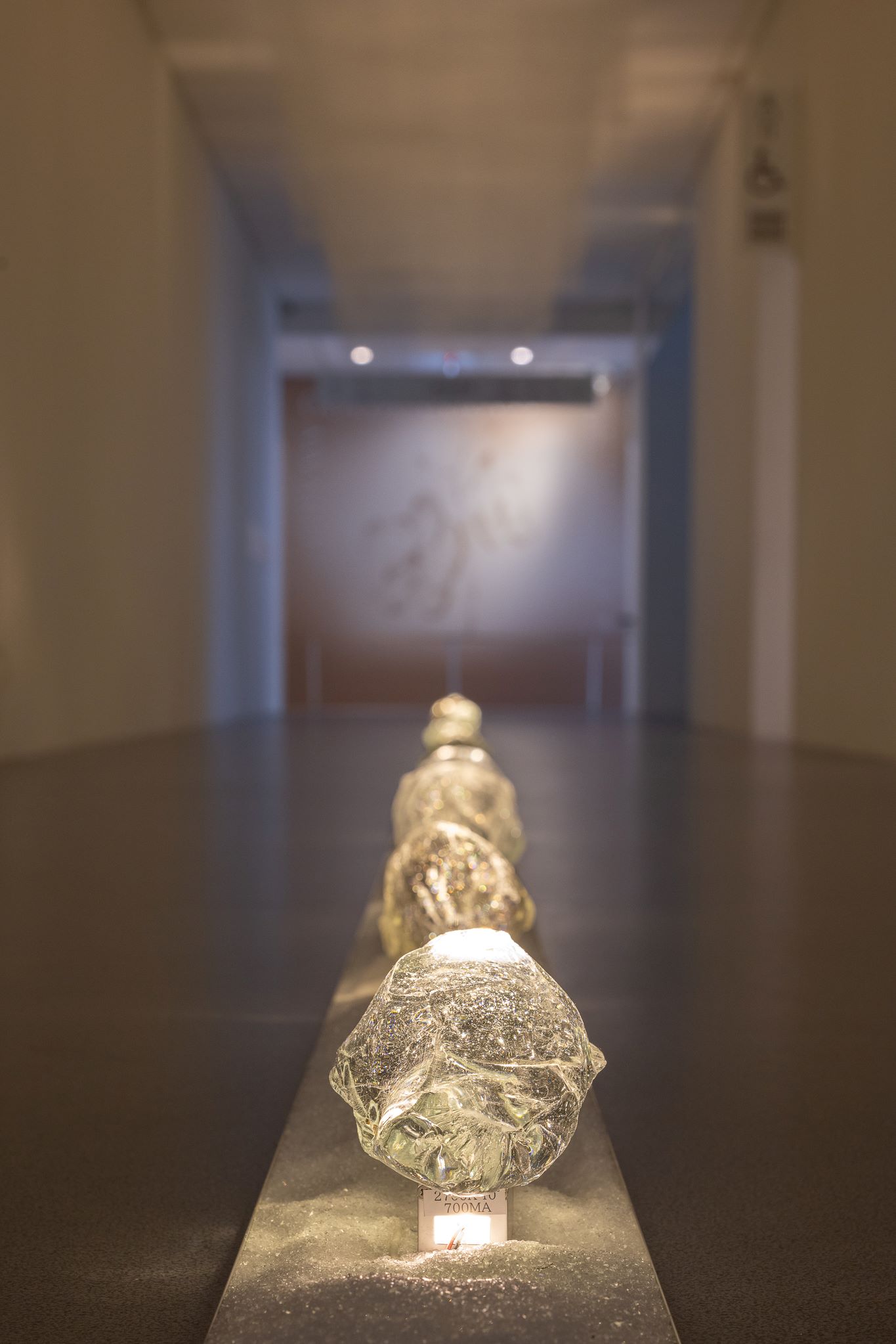 入口廊道的「勿忘榮光」敘說台灣過去60、70年代新竹的玻璃榮景,從小時候家家戶戶都曾經穿線代工的 #聖誕燈泡,到曾經新竹玻璃產業出口占全世界近七成的盛況,以新竹玻璃美學累積至今的榮光,在廊道上串起如聖誕燈泡的21組玻璃燈光裝置來回應本屆 #金玻獎 的21位得獎者。