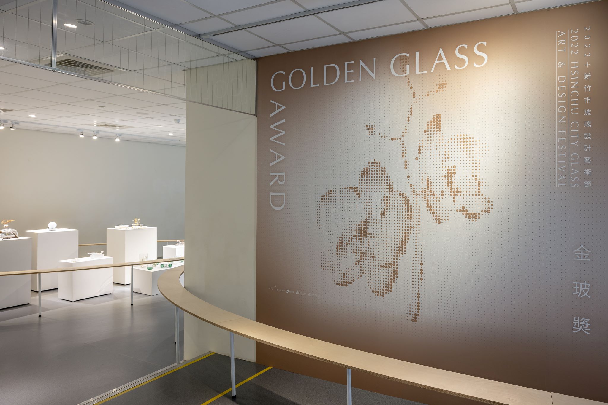 「金玻光芒」展區,展出本屆金玻獎精彩得獎作品,從美學與城市發展角度切入探討玻璃工藝與時代美學,配合得獎作品與空間佈局安排白色高低展示台,串連室內及戶外空間,並設置環繞作品的環型光芒,圍塑出作品空間領域。