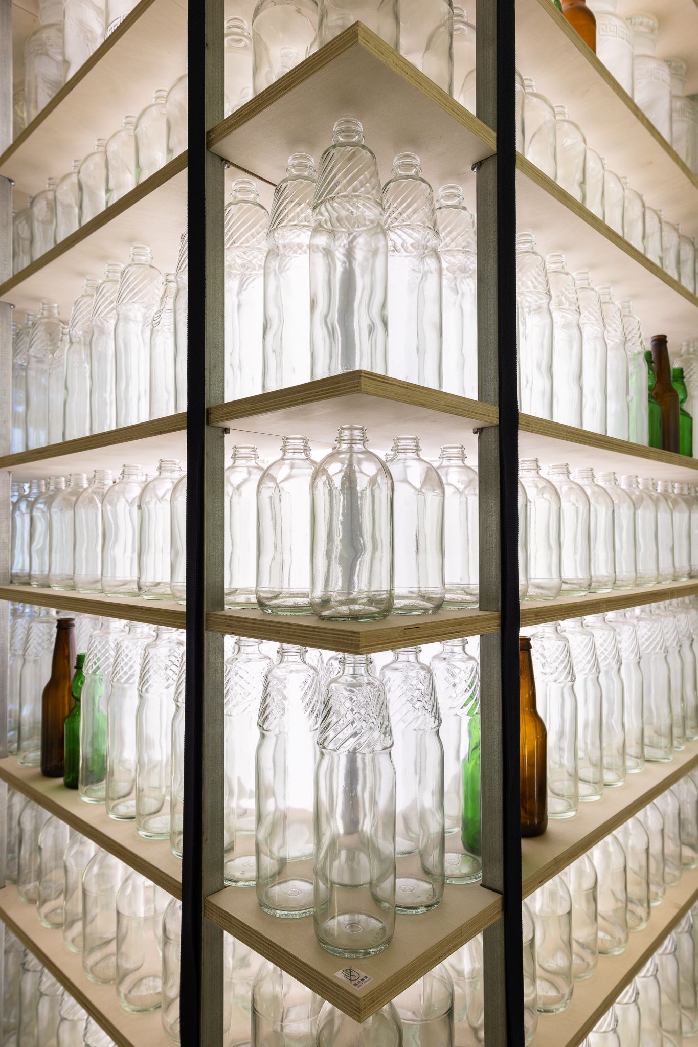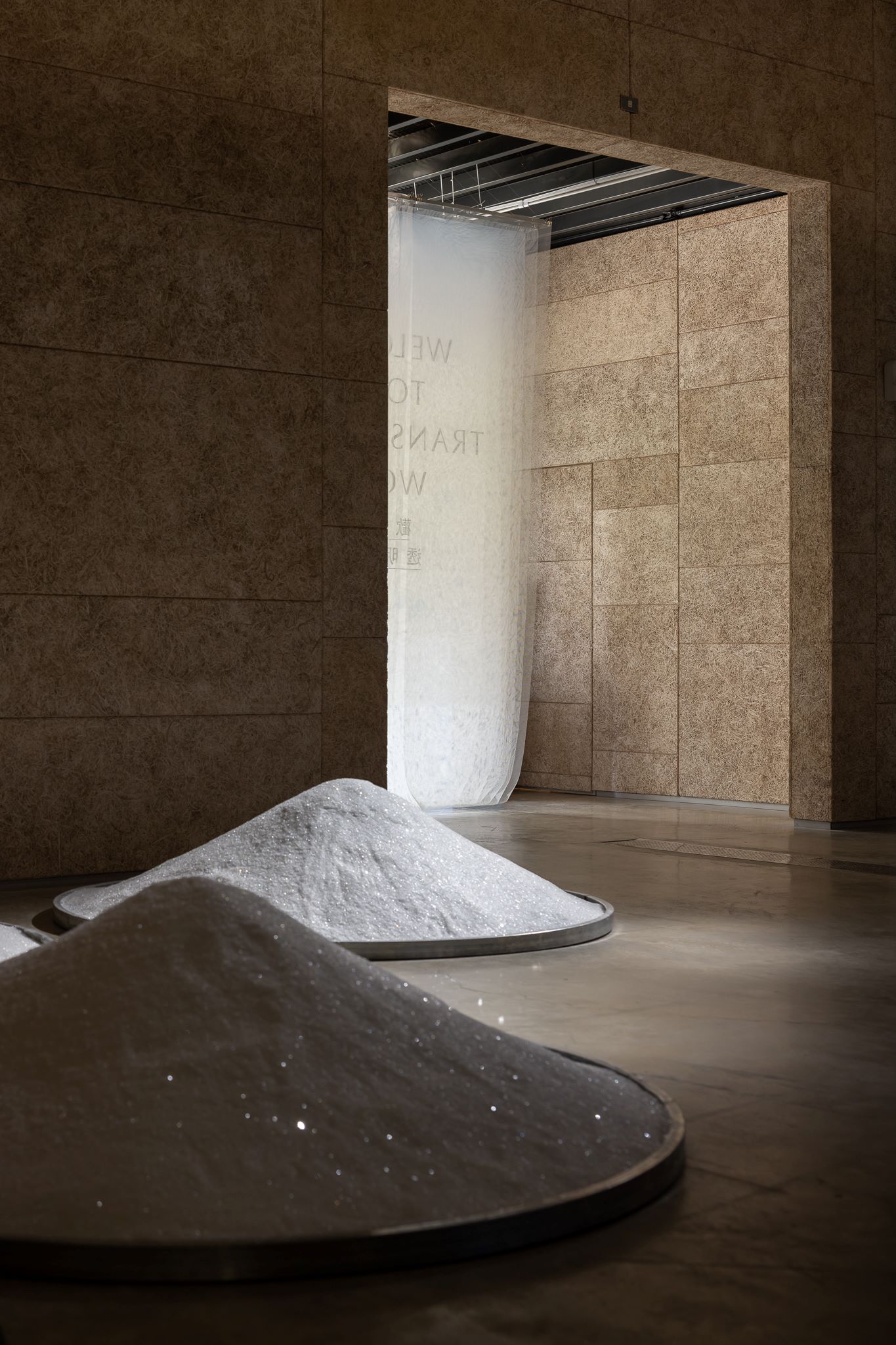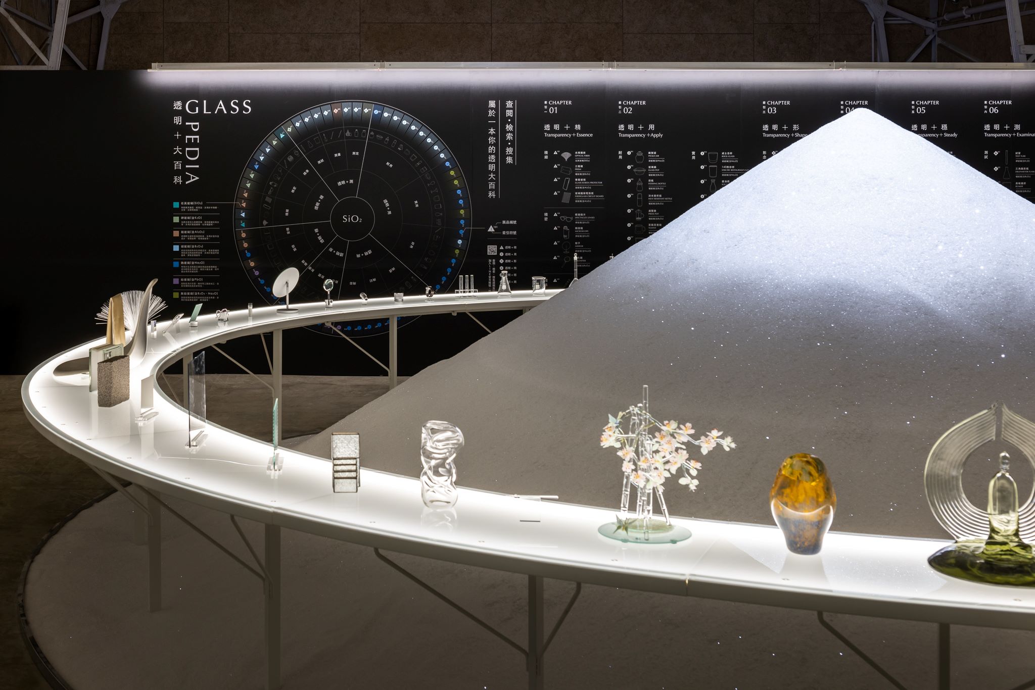 透過與 春池玻璃 Spring Pool Glass 合作的移山計畫來呈現玻璃的原始樣貌 #SiO2,解釋玻璃最初(過去)與最終(未來)的型態,我們試著以非教科書的方式將循環經濟及永續發展的理念埋入日常空間,將春池玻璃回收工廠的回收玻璃砂山移到展區裡,讓平常玻璃回收產業中看不見的循環過程呈現在觀展者的眼前,將回收後的玻璃原料帶回展場,回應透明大百科的玻璃樣態,從玻璃的原點出發,再回到生活與日常。