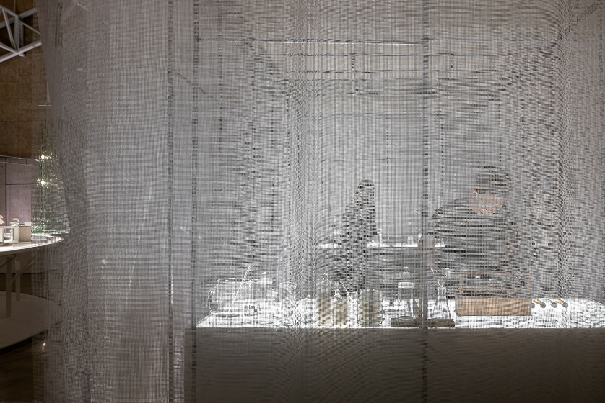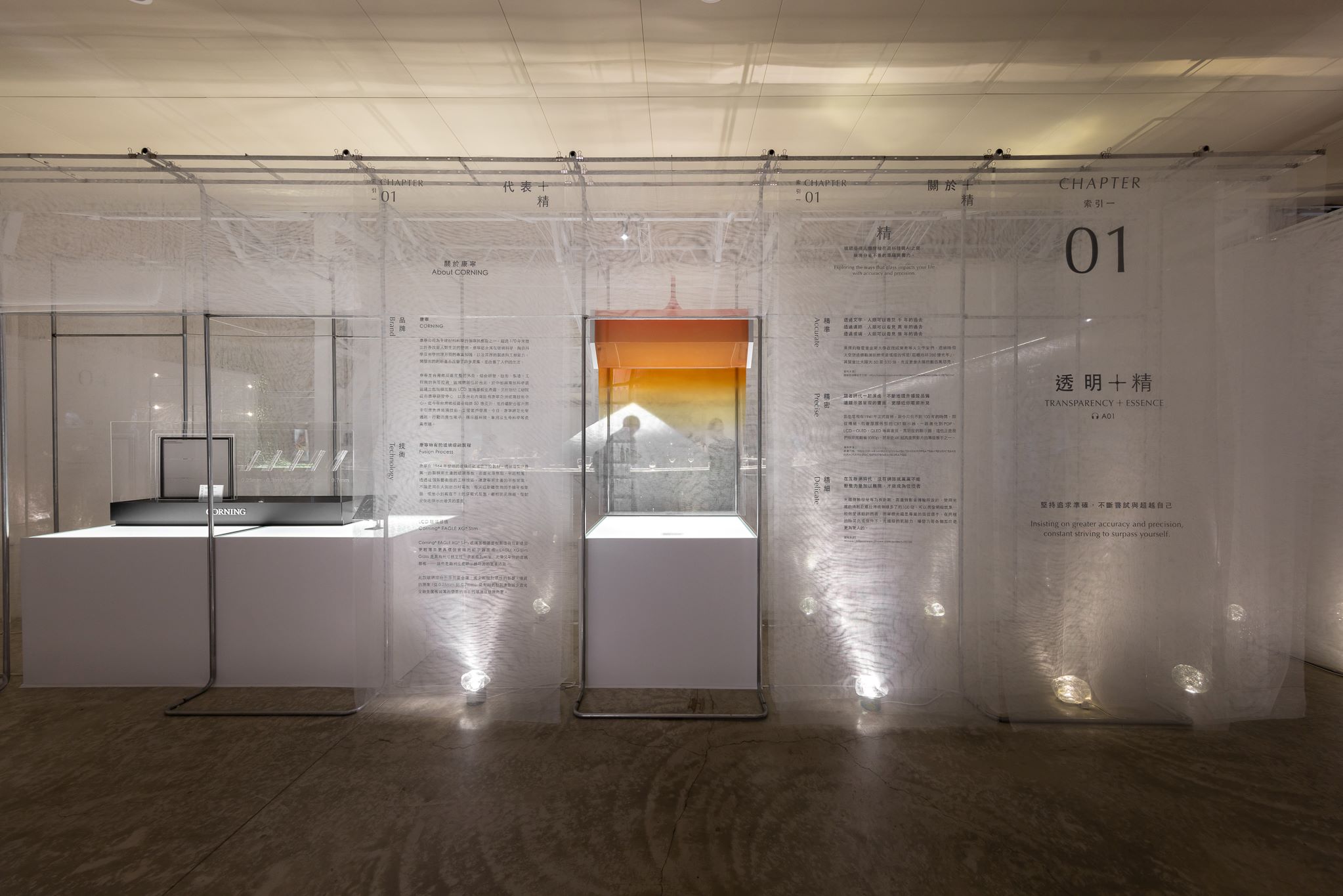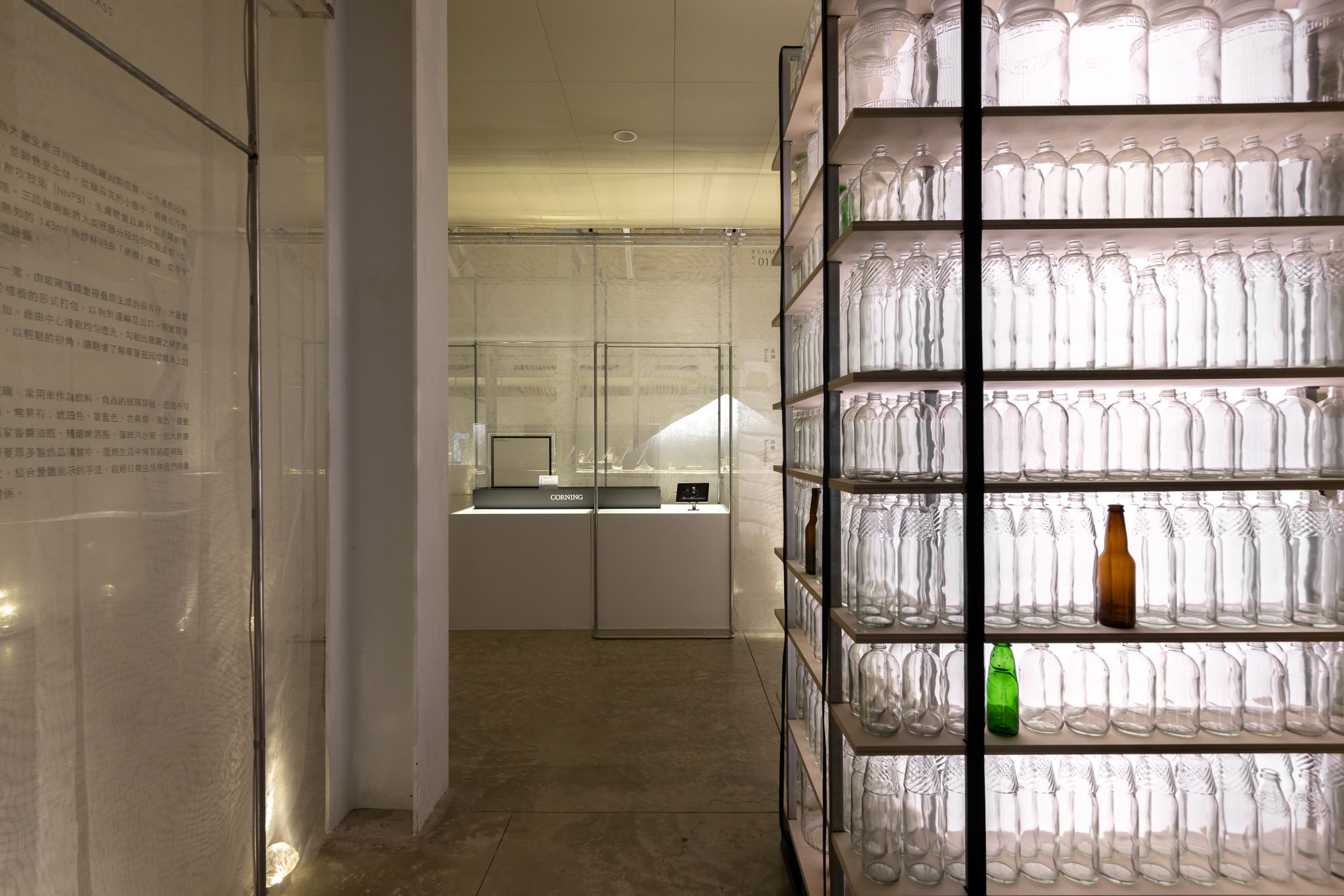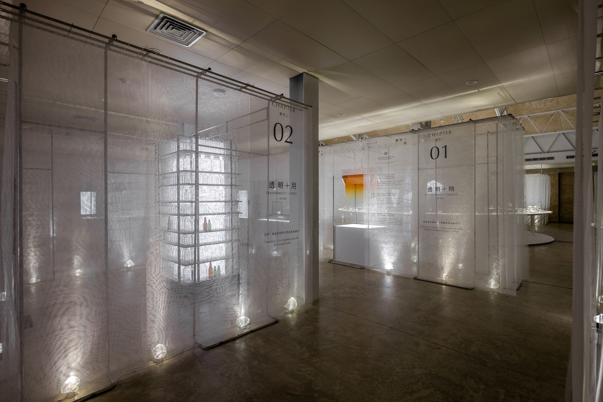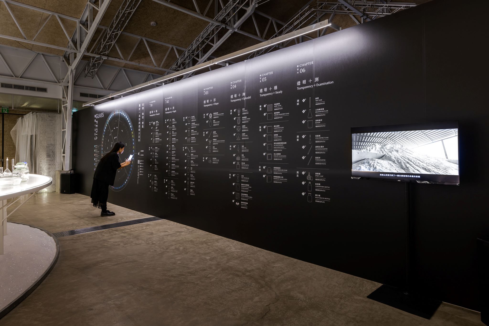 穿過介面,延續無氏製作剖析玻璃的歸類象限,以「間」的方式將索引分為六大區塊,各區塊透過展台、展品與裝置的安排呈現,闡述著分類內容,一步步引導參與者體驗透明大百科。