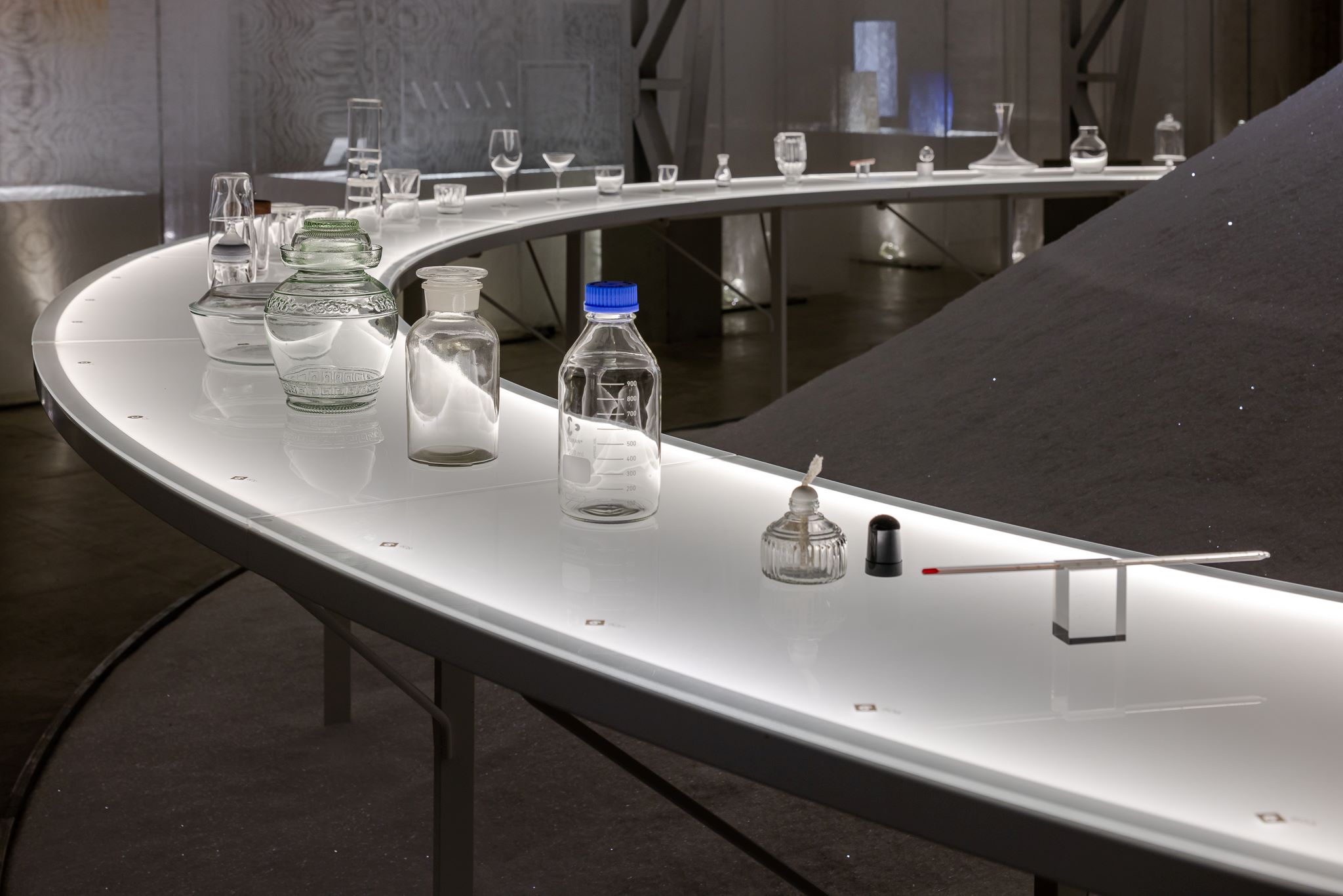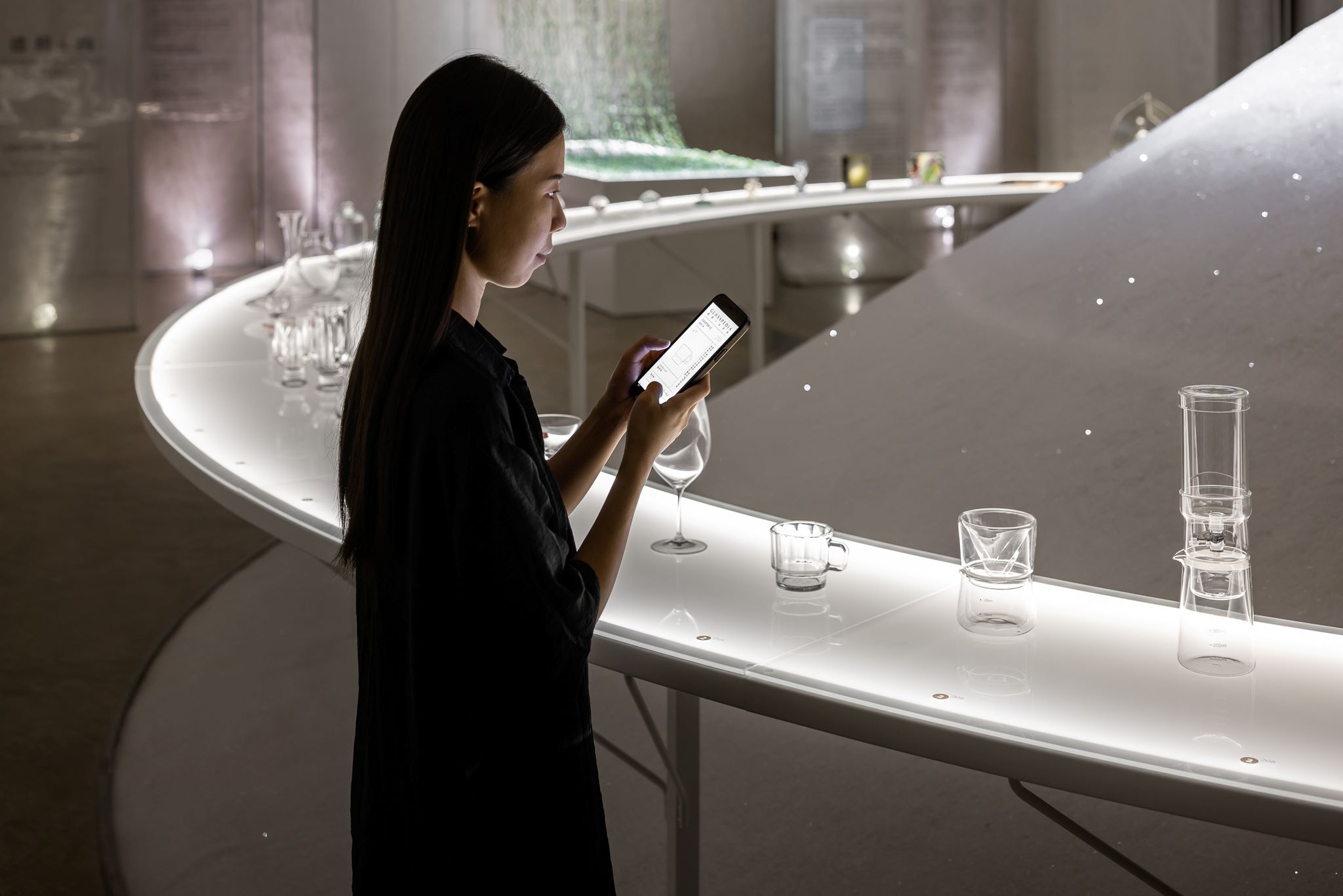 穿過層層介面與索引體驗,進入透明大百科的核心區域,以直徑8公尺的環型玻璃展台來展現透明大百科光譜中的玻璃展品,集結索引分類上的玻璃應用,呈現玻璃之於生活的各種向度。