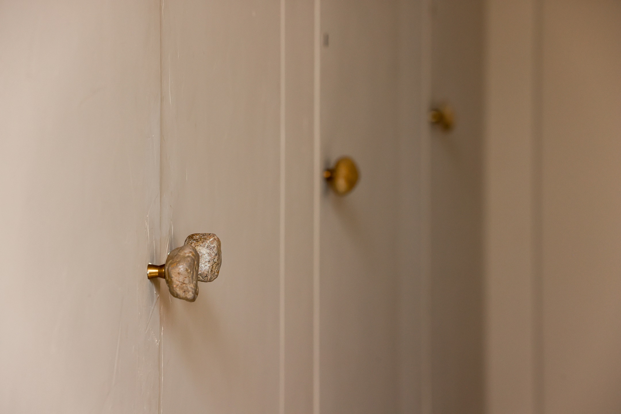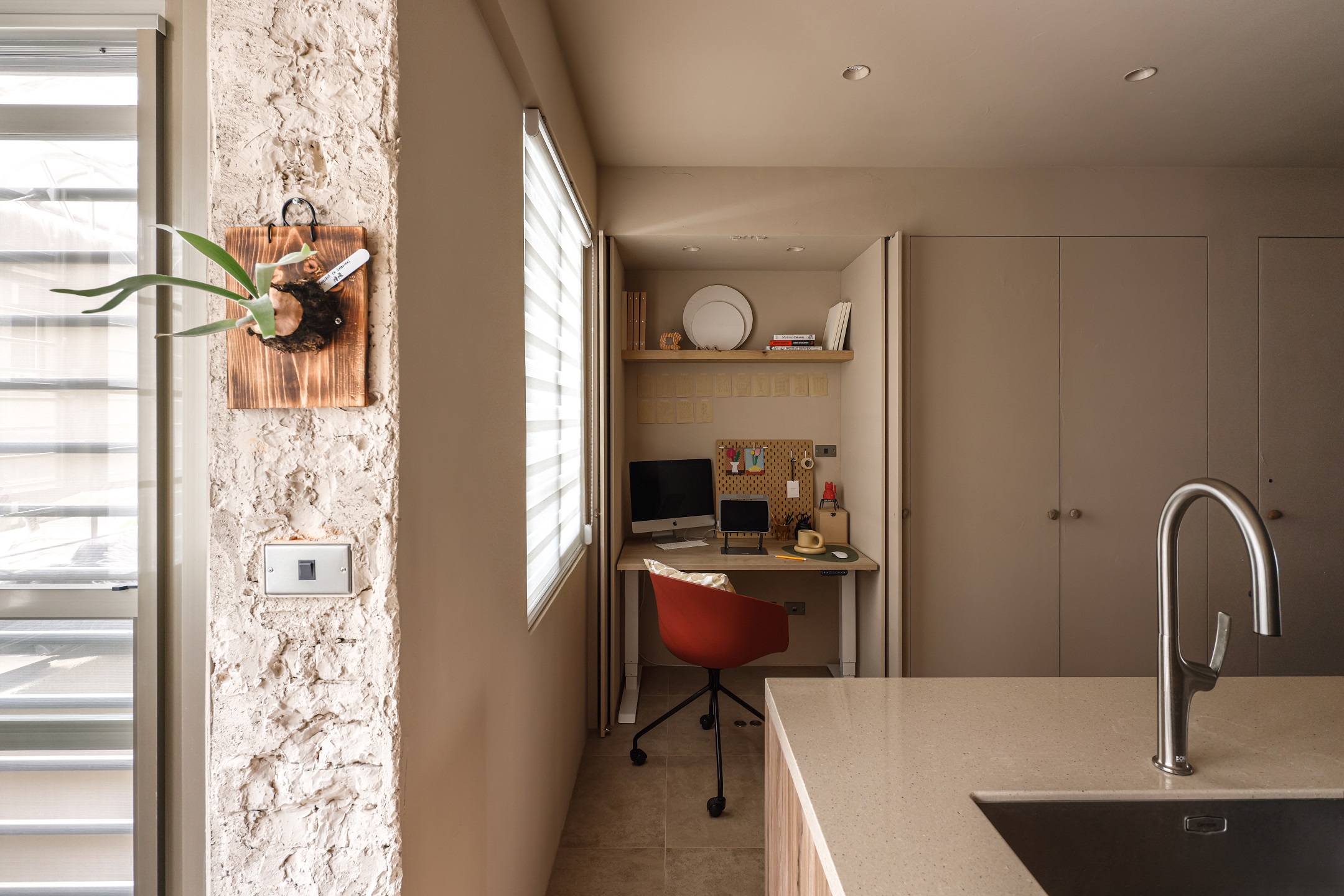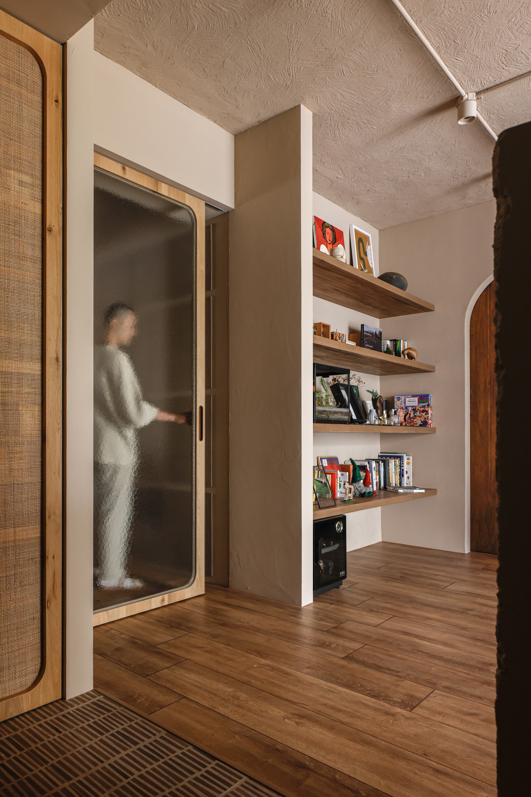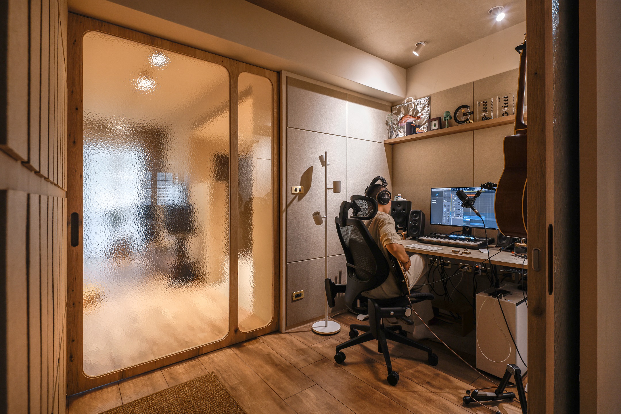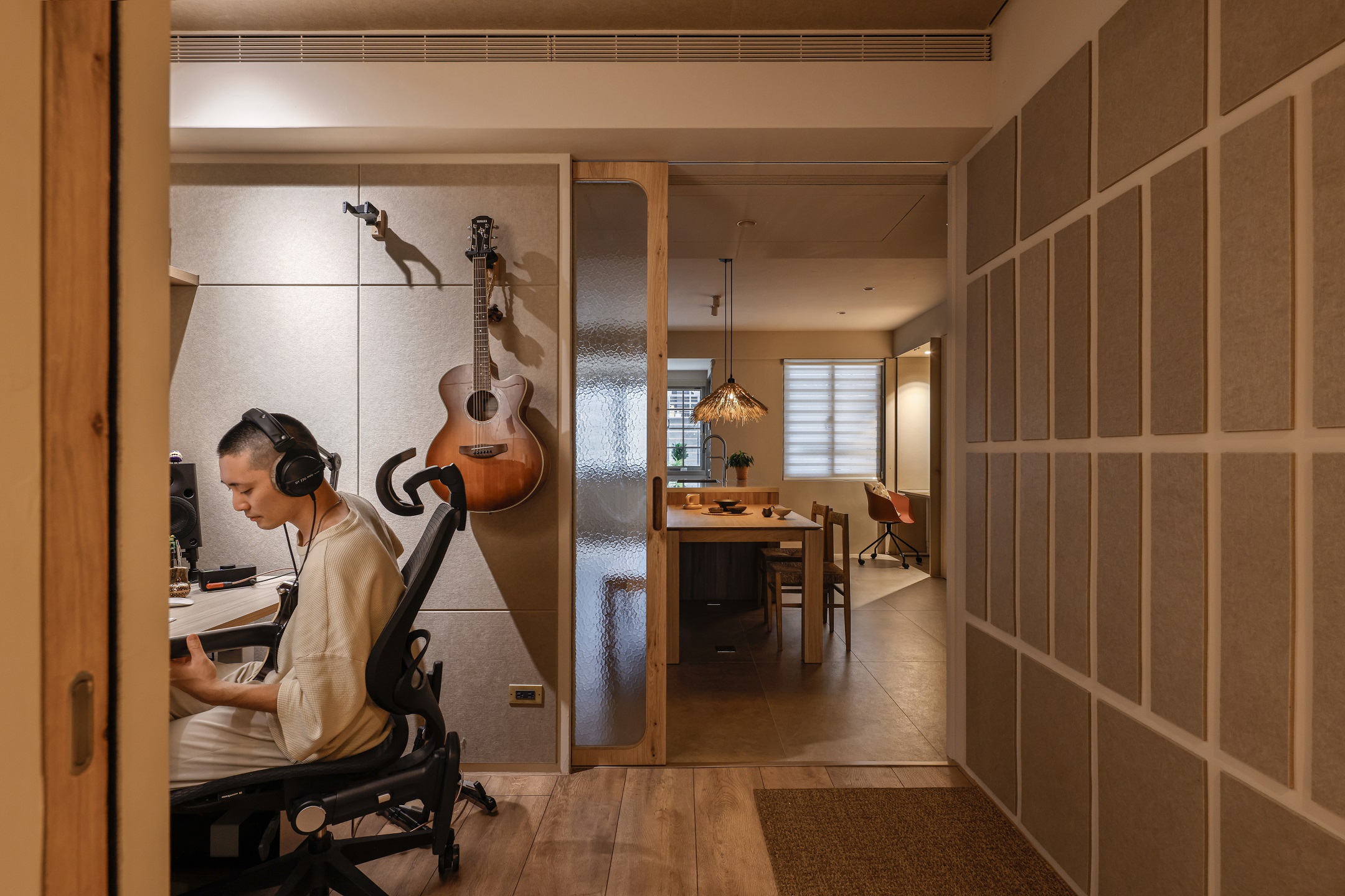 TRU的工作空間位於客廳與餐廳之間,利用可以隱蔽的玻璃口袋拉門,在需要專注工作時,提供了完整獨立的作業空間。吸音羊毛氈附貼在同色系的天花與牆面,除了滿足錄音時需要的漫射功能,也透過視覺上的分割,成為壁面設計上材質的巧思轉換;位於餐廳對側的收納櫃牆,鑲嵌著各式原石般的門把,打開的是DEE小時候的心願,隱密在內的工作空間成為DEE能盡情作畫的創作天地,猶如藏寶盒般,當門片關上,各種想像也一併被收藏。