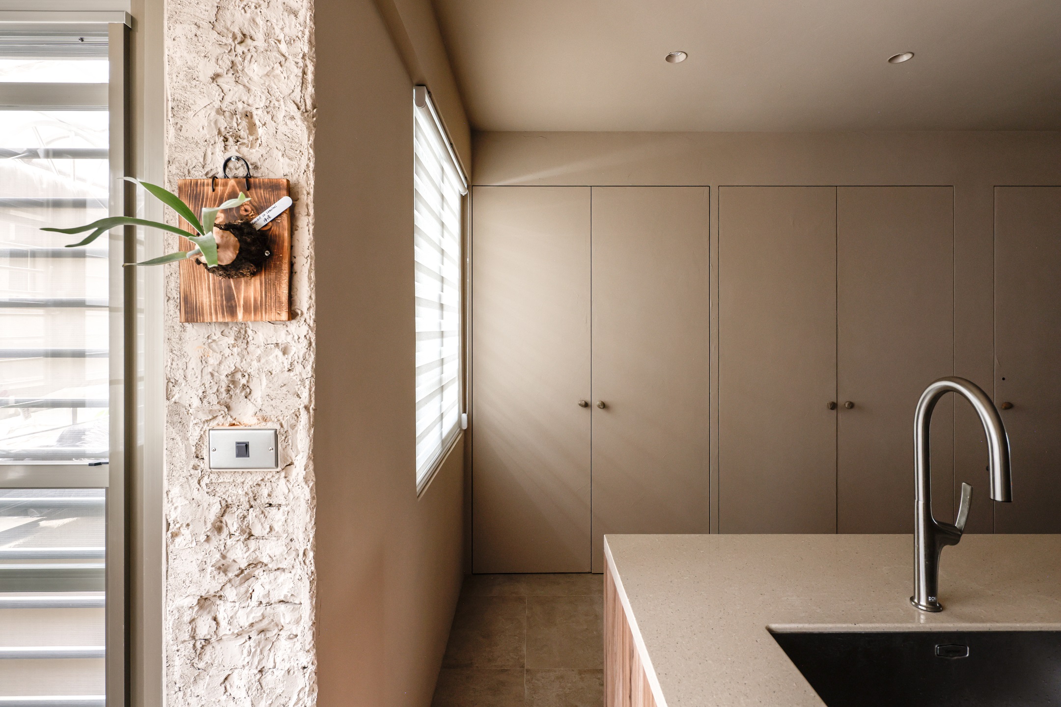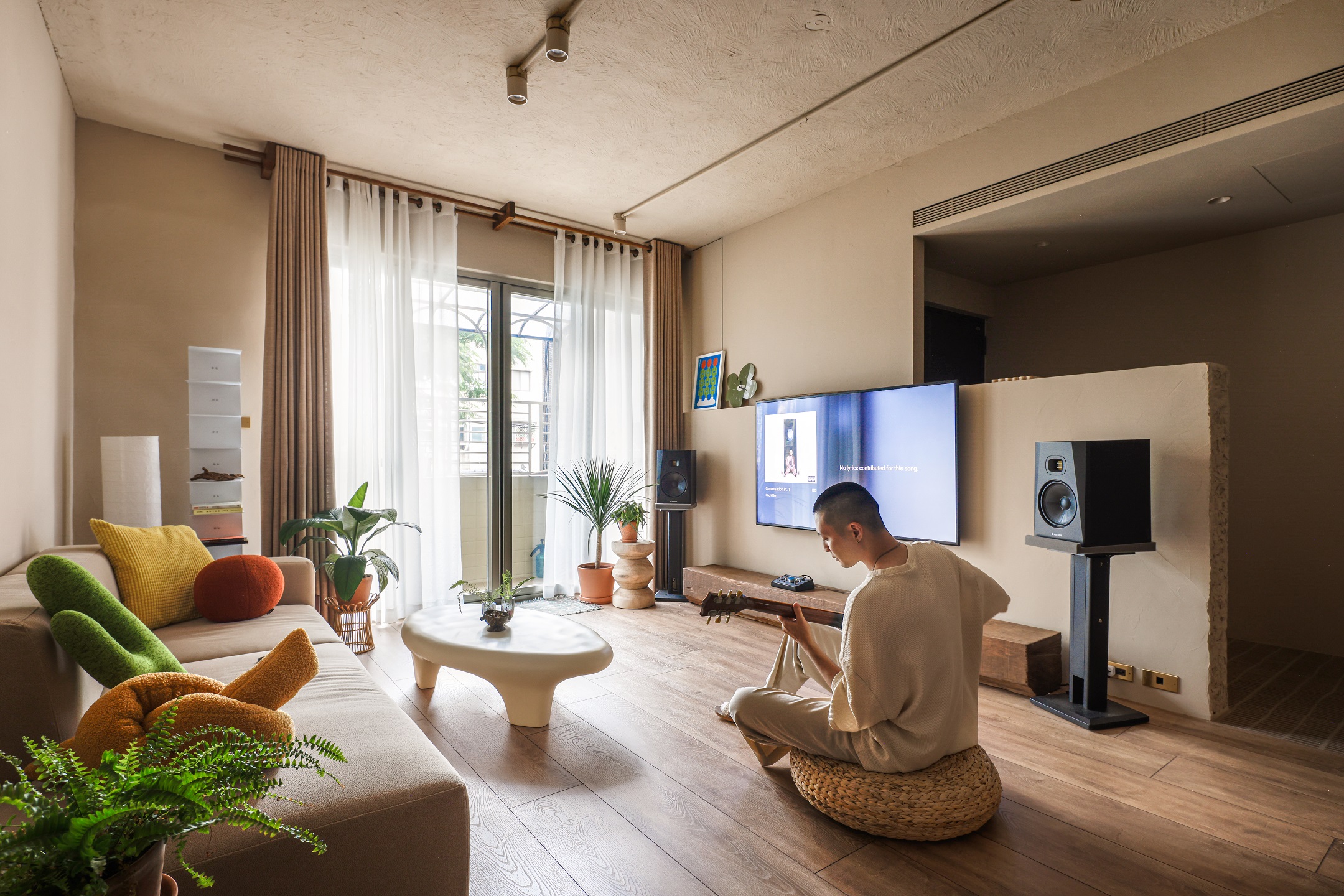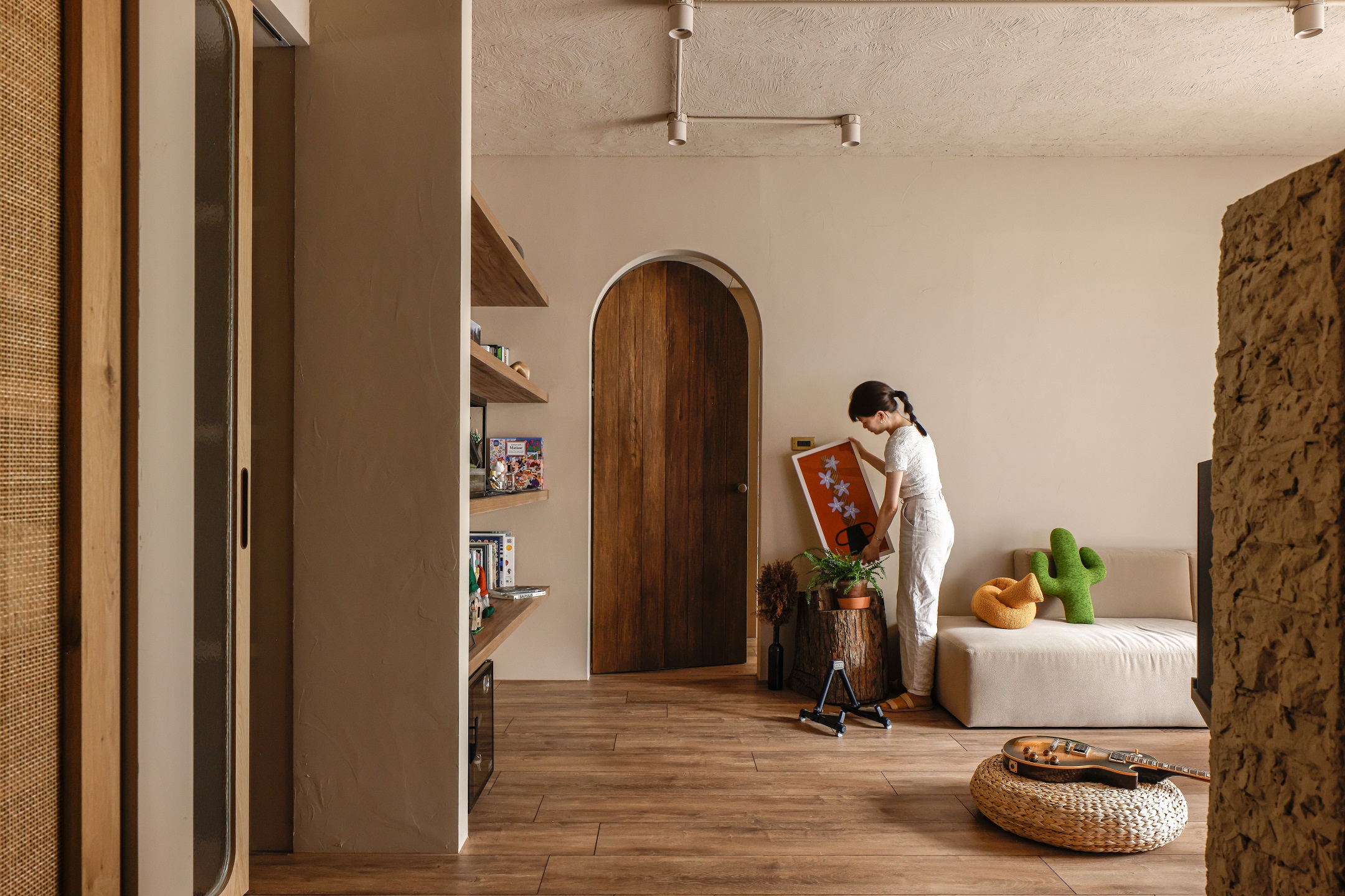 從玄關開始,粗曠的水泥木條磚和天然的藤編鞋櫃揭示了TRU與DEE對樸實材料的喜愛。走過電視背牆的磚鑿斷面望向客廳,由實木匠人製作的八尺扁柏枕木,靜靜地躺在厚實溫潤的橡木地板與主臥的檜木拱門對望。一以貫之的大地色調佈滿整個空間,利用「平順、批塗、刻鑿等漸次工藝紋理」在牆面、天花和斷面間呈現出細緻而講究的差別。DEE用色鮮明的創作畫作、倆人的珍藏與綠意盎然的大小植栽,填補了LUCY家的生動色彩,記錄著倆人日常生活裡豐富的品味與靈感。