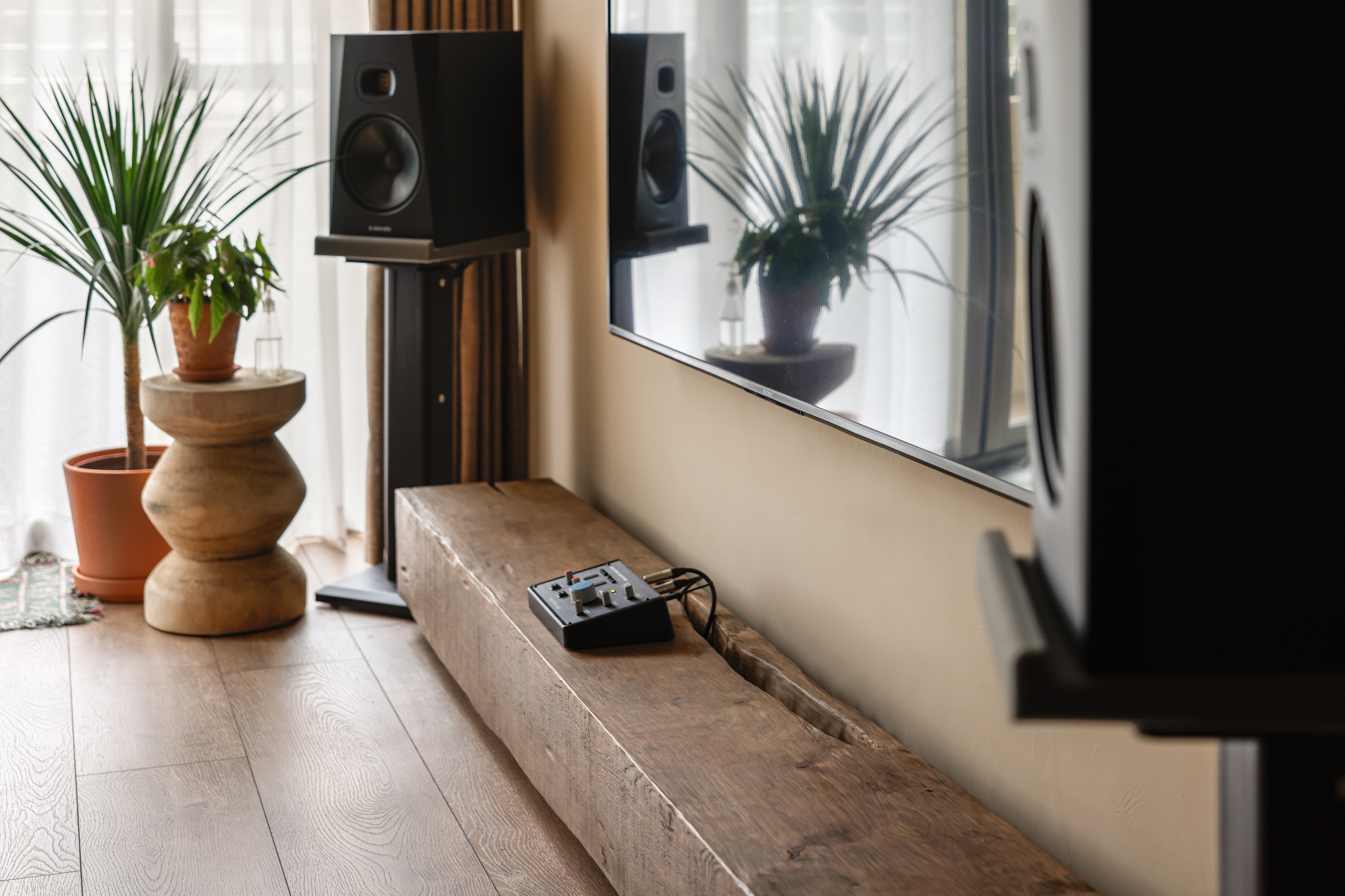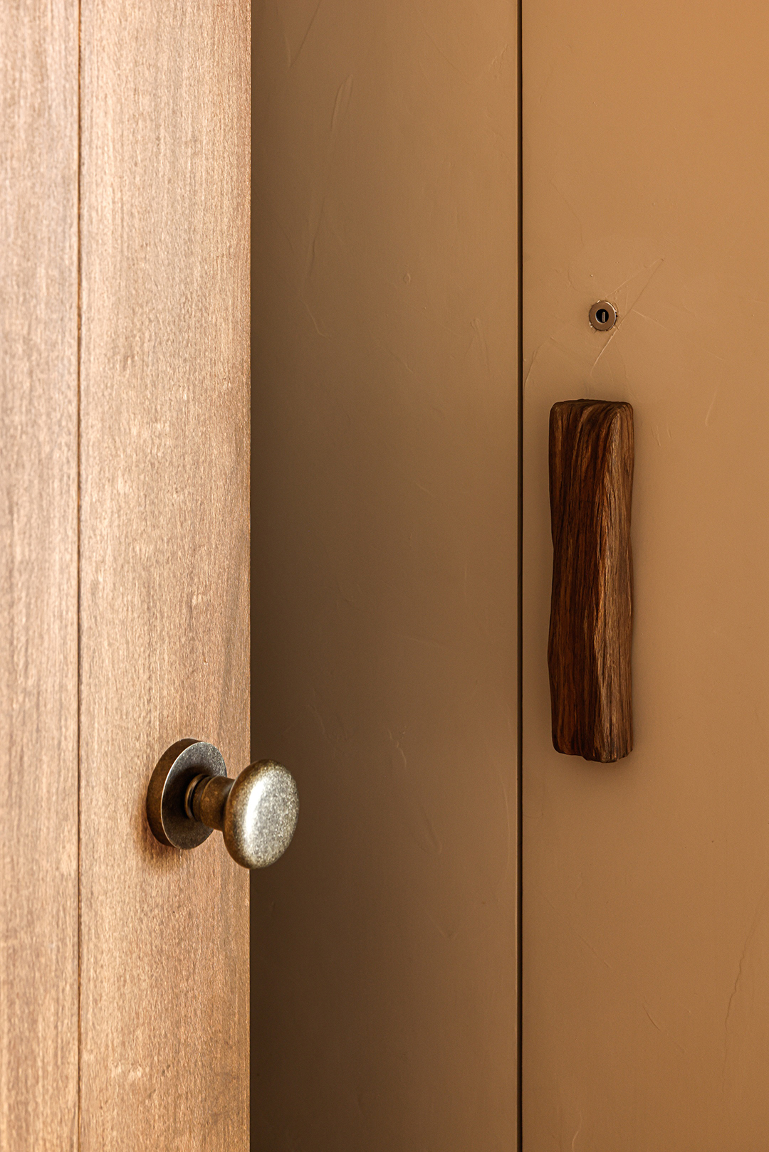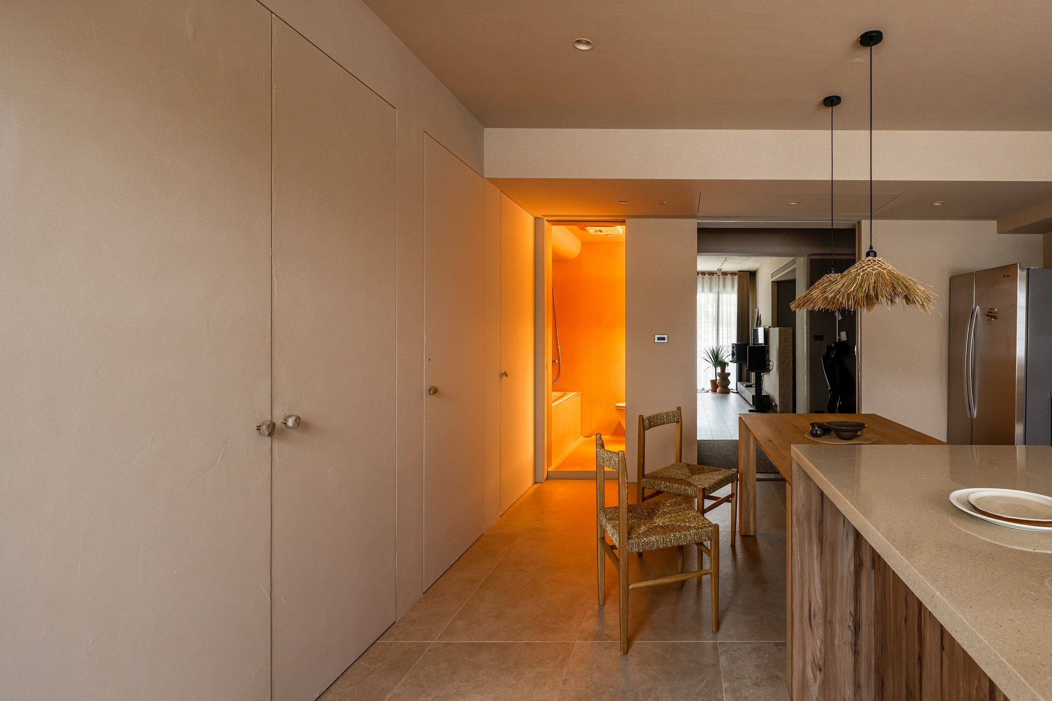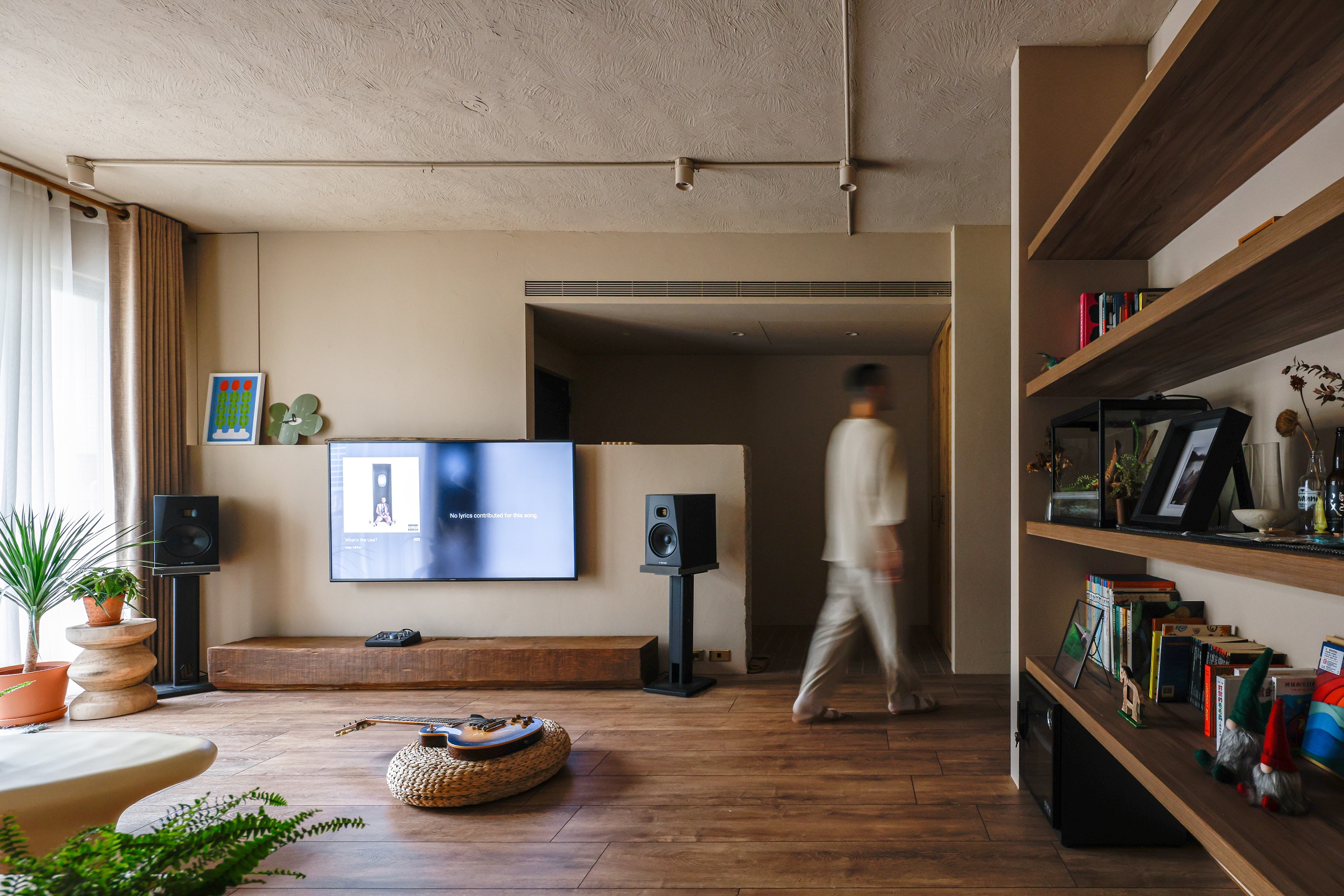 從玄關開始,粗曠的水泥木條磚和天然的藤編鞋櫃揭示了TRU與DEE對樸實材料的喜愛。走過電視背牆的磚鑿斷面望向客廳,由實木匠人製作的八尺扁柏枕木,靜靜地躺在厚實溫潤的橡木地板與主臥的檜木拱門對望。一以貫之的大地色調佈滿整個空間,利用「平順、批塗、刻鑿等漸次工藝紋理」在牆面、天花和斷面間呈現出細緻而講究的差別。DEE用色鮮明的創作畫作、倆人的珍藏與綠意盎然的大小植栽,填補了LUCY家的生動色彩,記錄著倆人日常生活裡豐富的品味與靈感。
