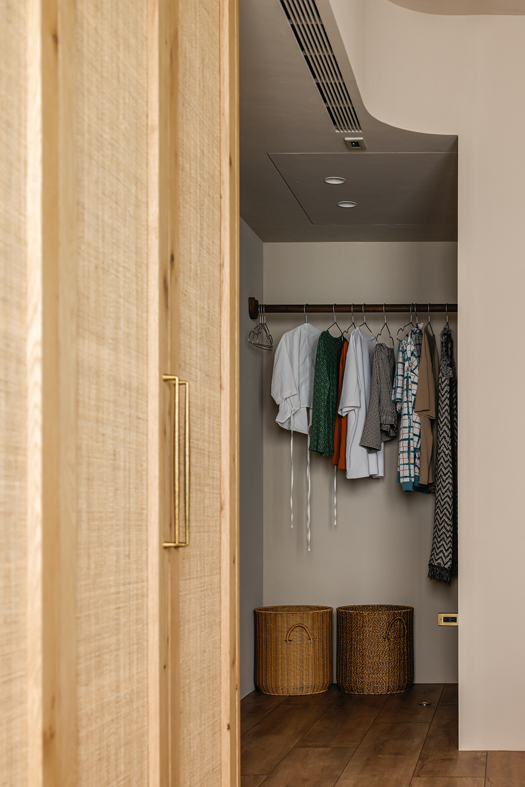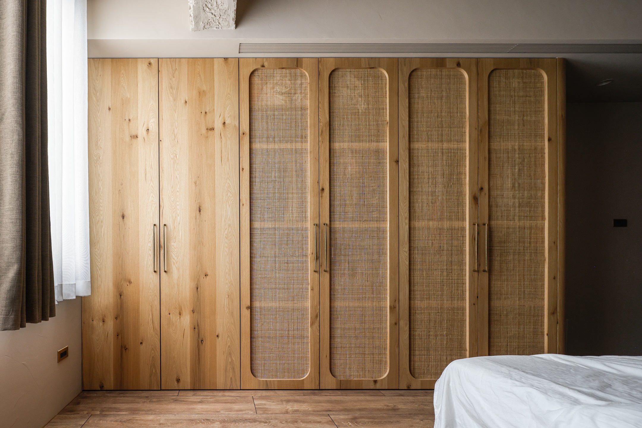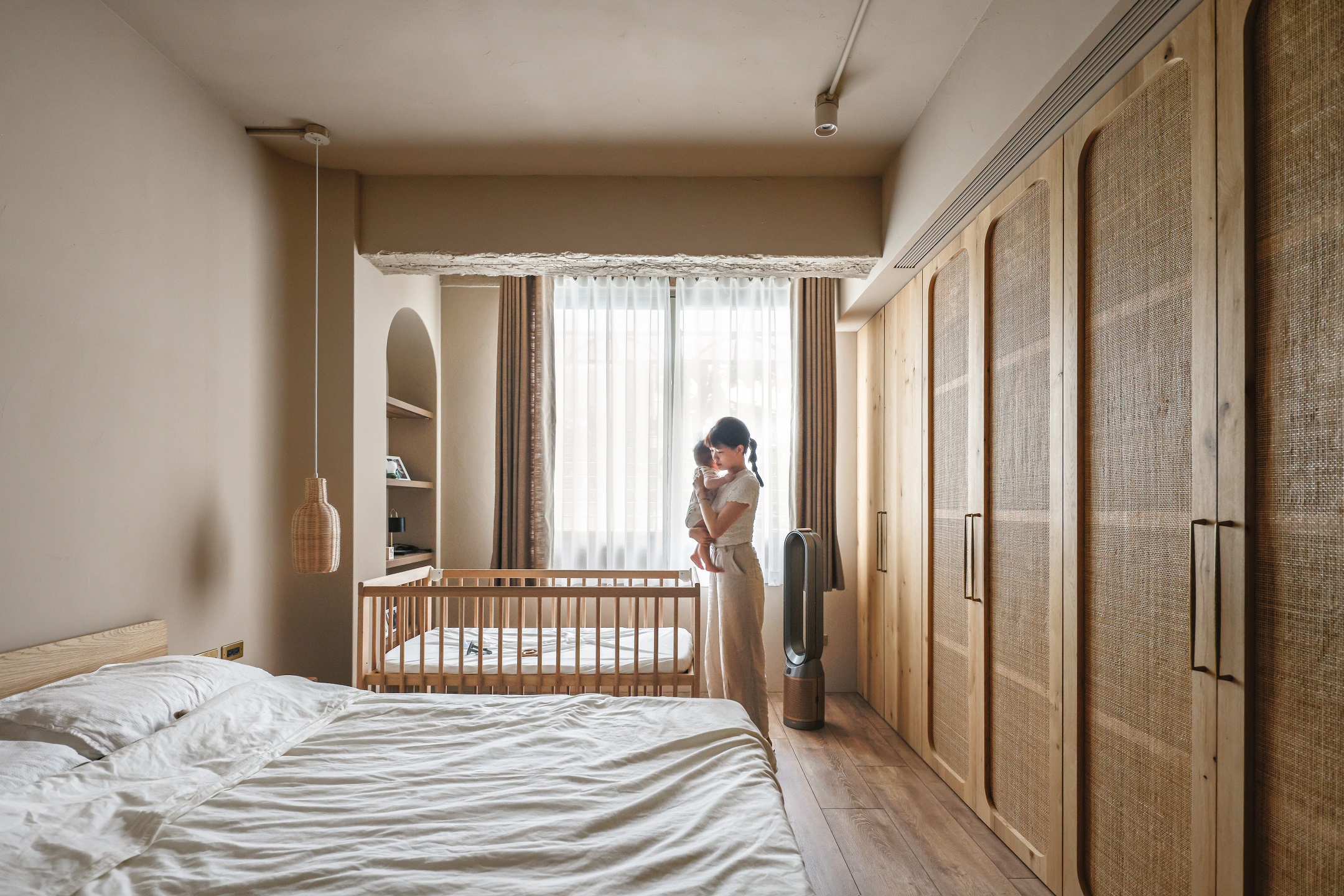 面對不斷成長的未來,客房空間保留了彈性運用的留白,可以根據使用需要變成DEE的繪畫室、TRU的攝影棚,或是LUCY的遊戲房使用。主臥室延續全室溫暖氛圍,柚木訂製的把手和衣桿、編織的藤片衣櫃、以及窗簾透進的自然光線,都將成為LUCY對於家的初始印象,在爸爸和媽媽的愛中持續成長,留下無數最美好的時刻。