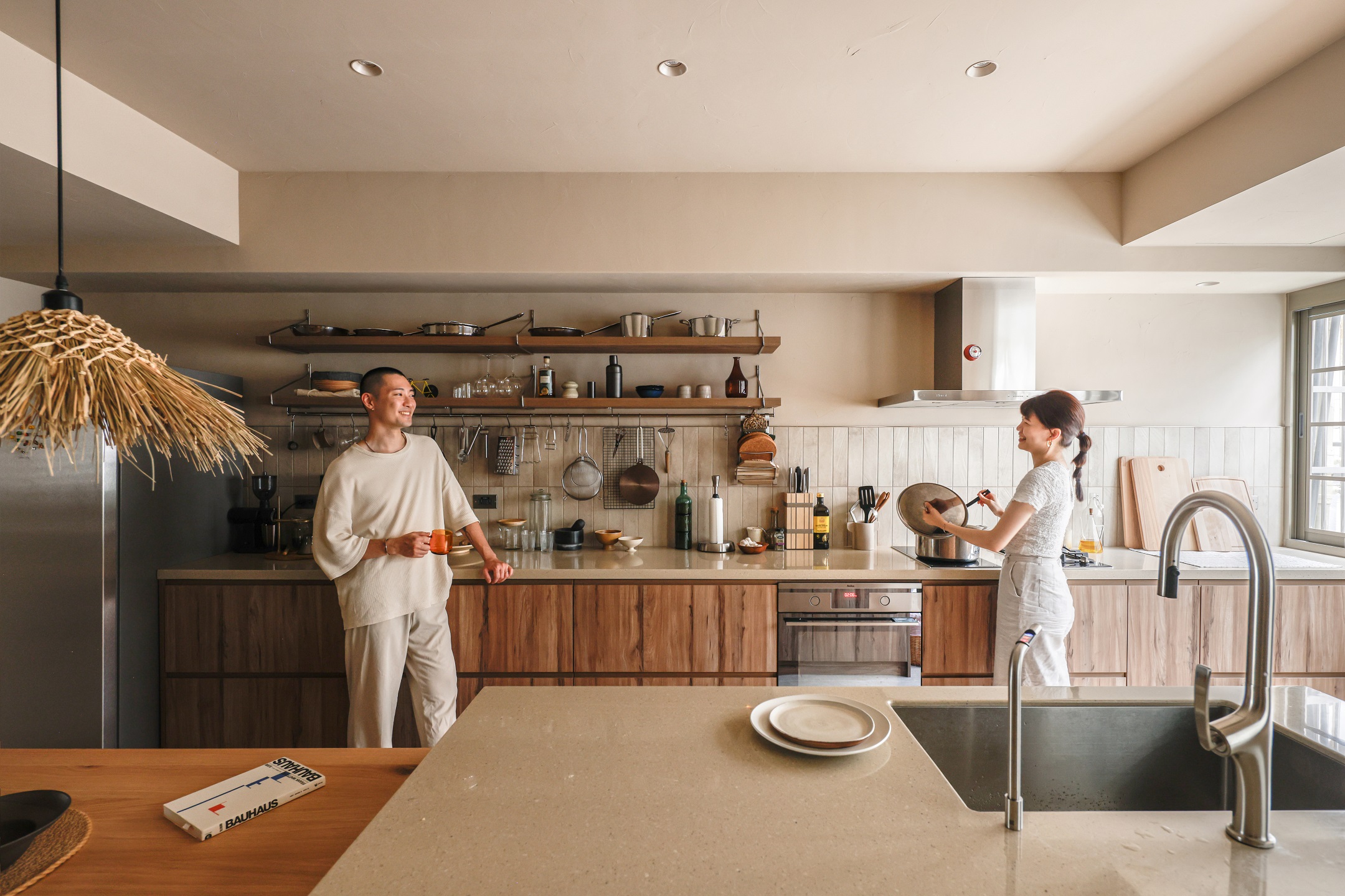 洗鍊的金屬支架與木層板讓各種烹煮器具有序清晰地陳列,無論是早晨的手沖咖啡還是精心烹煮的美食佳餚,這個開放且寬敞的中島廚房提供了充裕的操作檯面與動線,讓一家人能自在的並行使用,創造料理之外也豐富了彼此之間的交流時光。