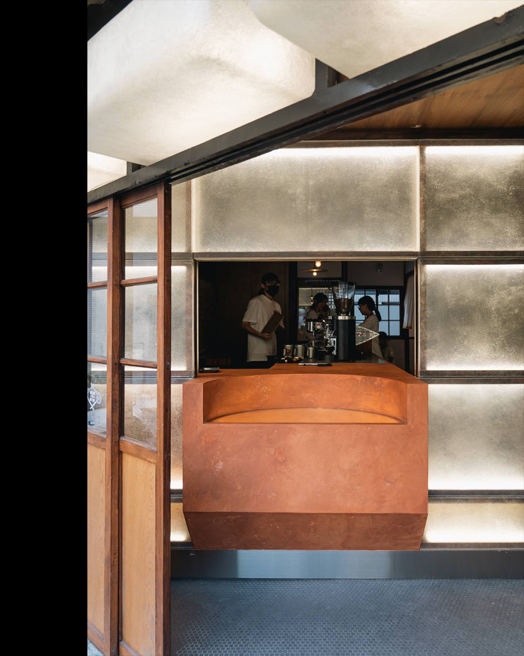 ✸ 一樓以退縮的玄關為隱晦的入口,作窺探的開端,微微發光的玻璃纖維搭配實木框架,重譯日式老屋的和紙印象,橘色斑駁的櫃台輕巧地向外穿透延伸,和進入的人輕聲招呼。