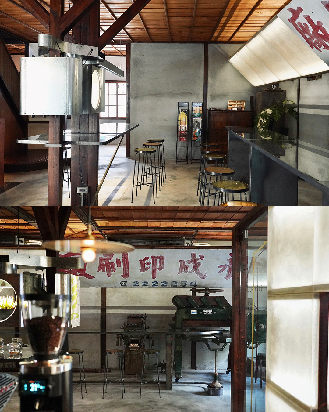 ✸ 空間後方的鐵件長桌檯彷彿重現記憶裡舊時印刷廠正運作生產中的流⽔線,由倚靠牆面的古老裁紙機為起點開始延伸,結合老印刷廠招牌搭配的玻璃纖維燈罩,柔和中心金屬件的銳利感。