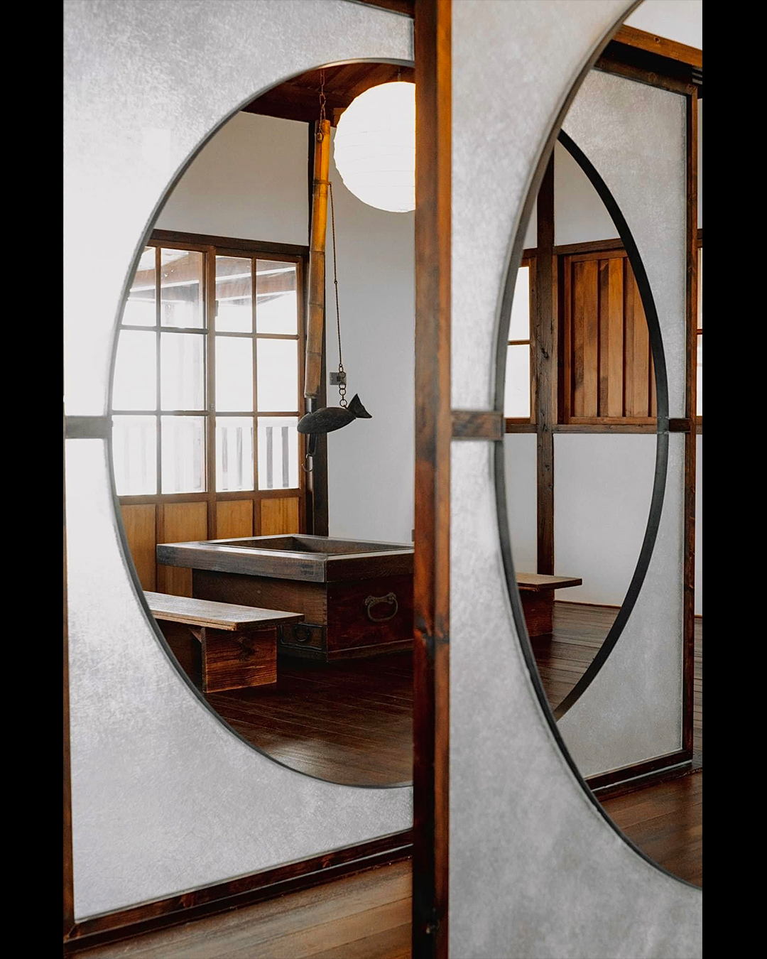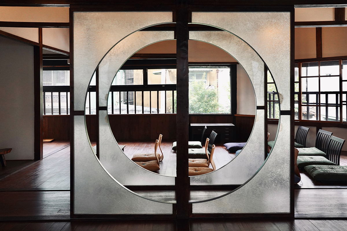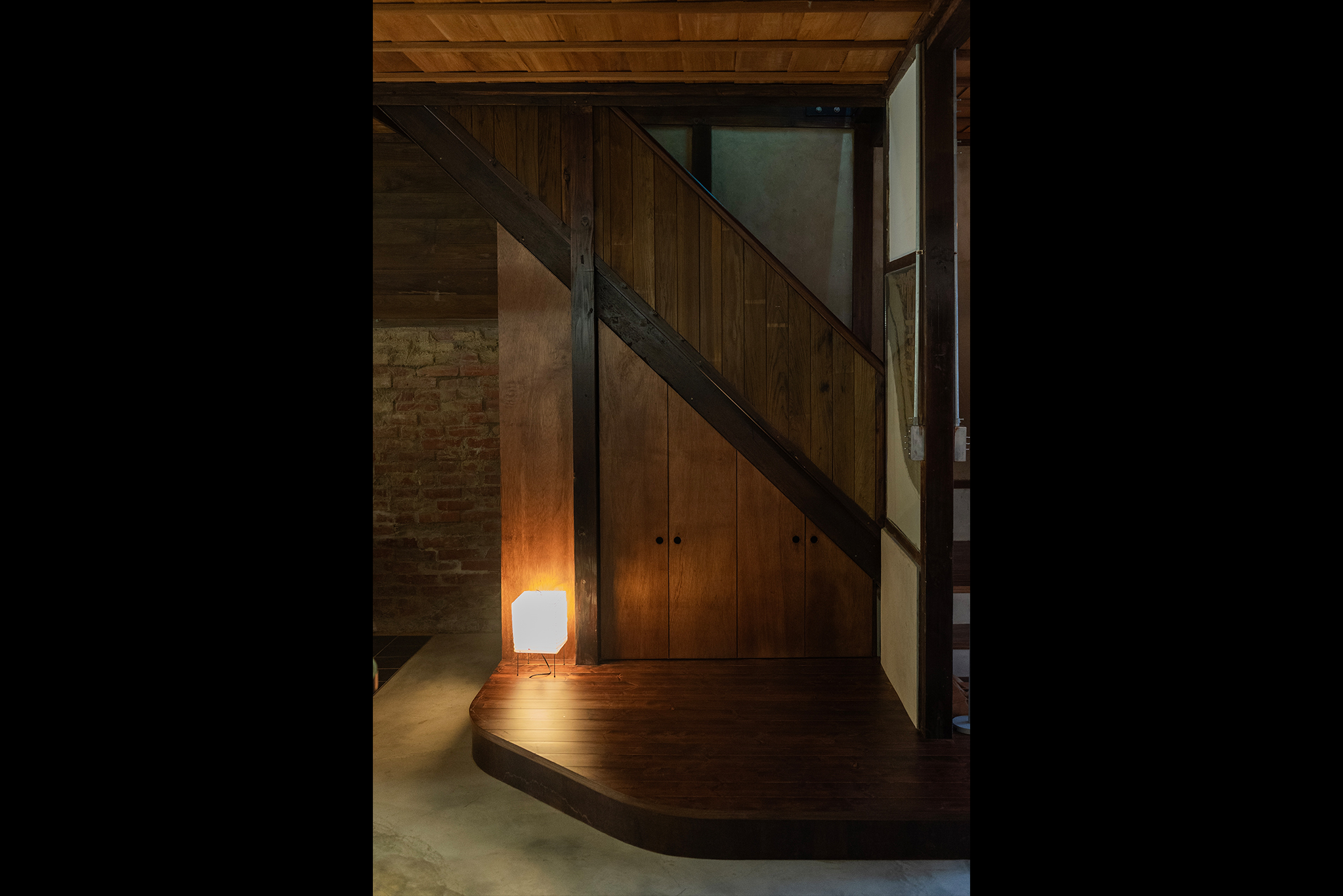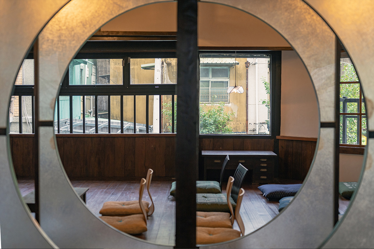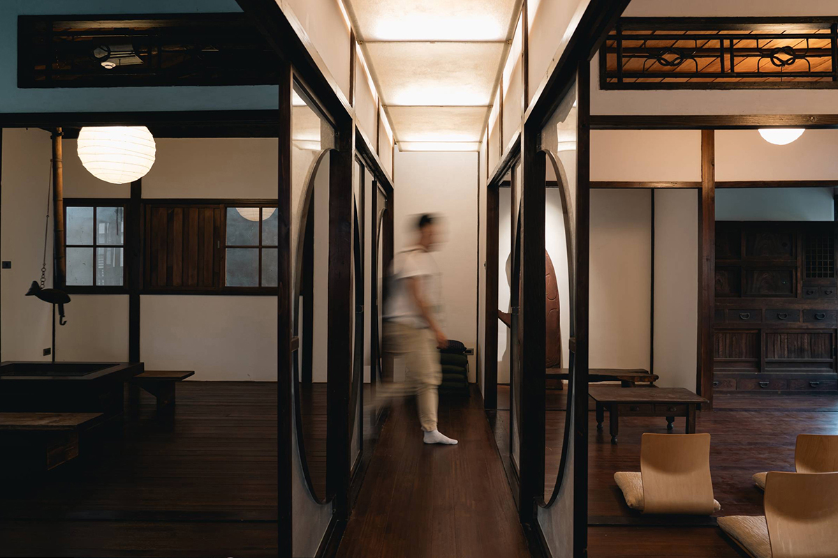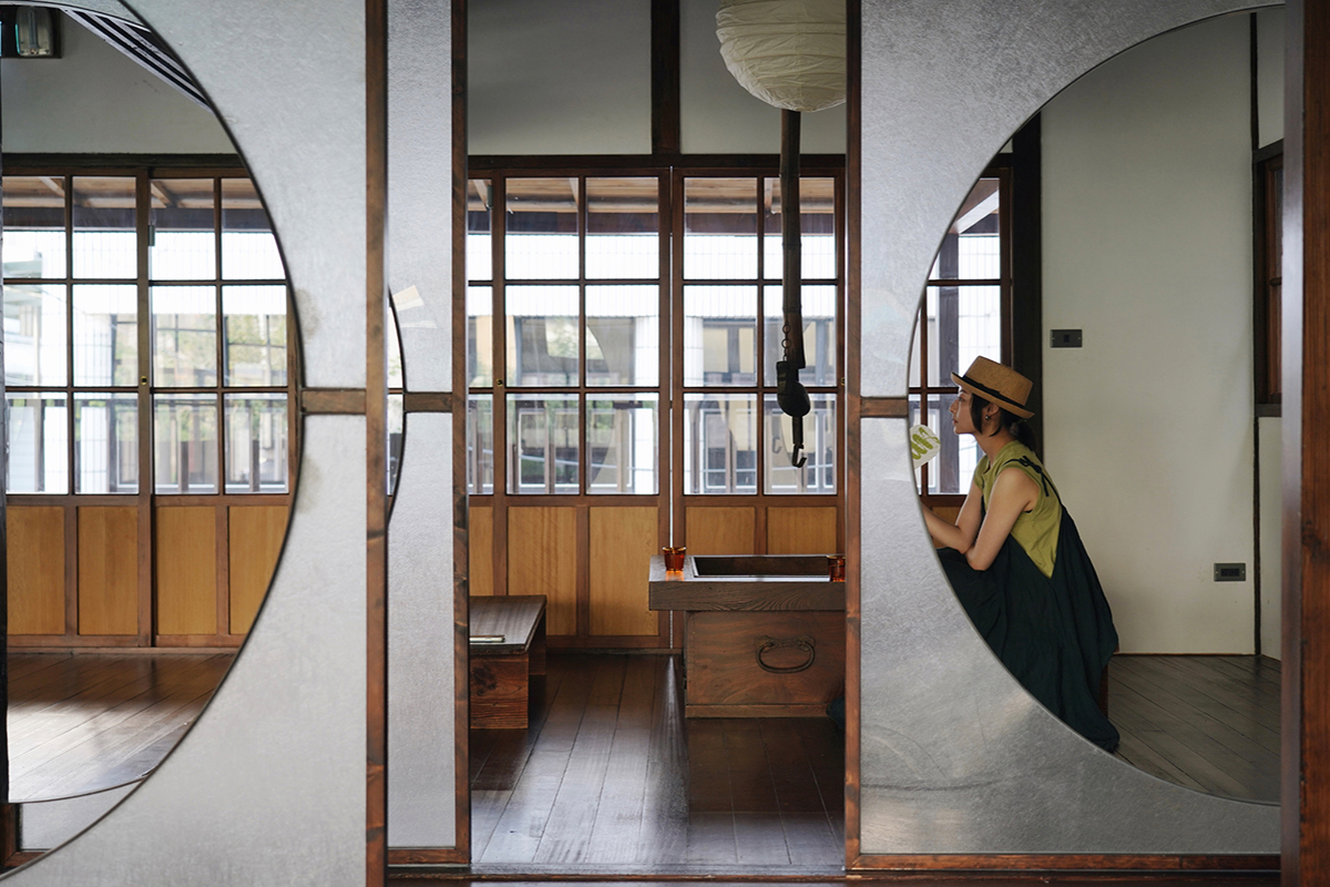 ✸ 通往二樓的木梯口新增了架高實木地板的換鞋區,為往二樓空間的路徑多了一份儀式感的空間經驗。進入二樓空間,與一樓燈罩選用相同材質──半透明玻纖屏風有秩序卻又錯落的區分空間,利用屏風上的半圓洞口作為視線及光線的穿透,搭配古物件及日式吊燈點綴整體氛圍,呈現新舊共存的曖昧狀態。