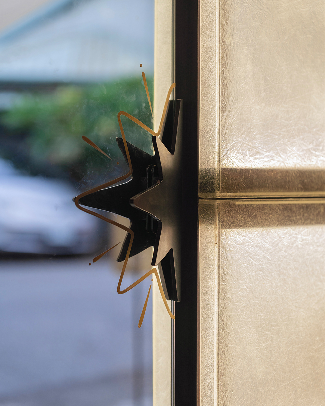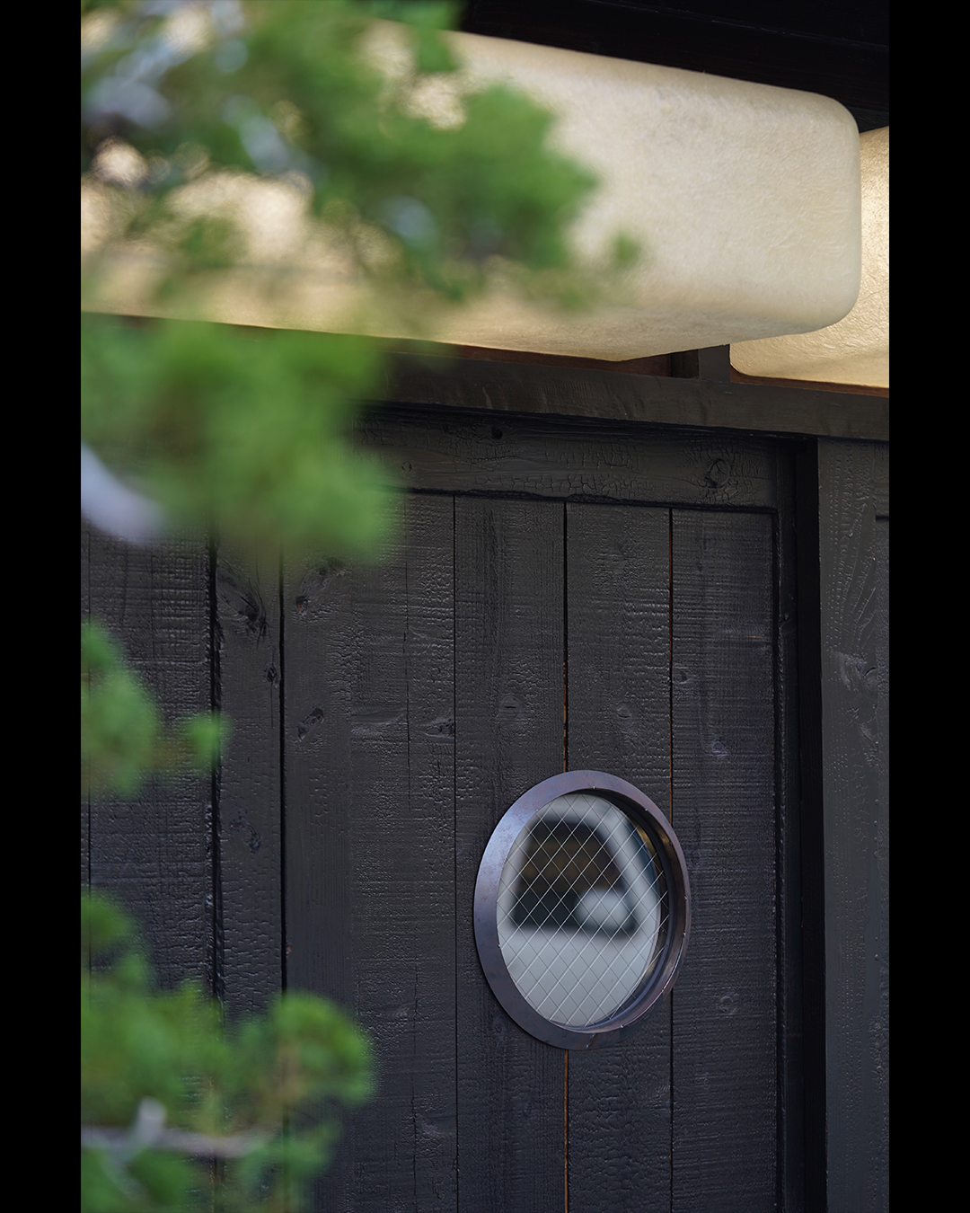 ✸ 入口使⽤燒杉工法的四面木門,在木門上鑲上一個鐵絲玻璃小圓窗為窺探的主軸拋出開端,玄關邀請salmo work表現出復古手繪的招牌字風情,搭配開門時手握星型門把的動作暗示即將踏入這個魔幻的空間內。