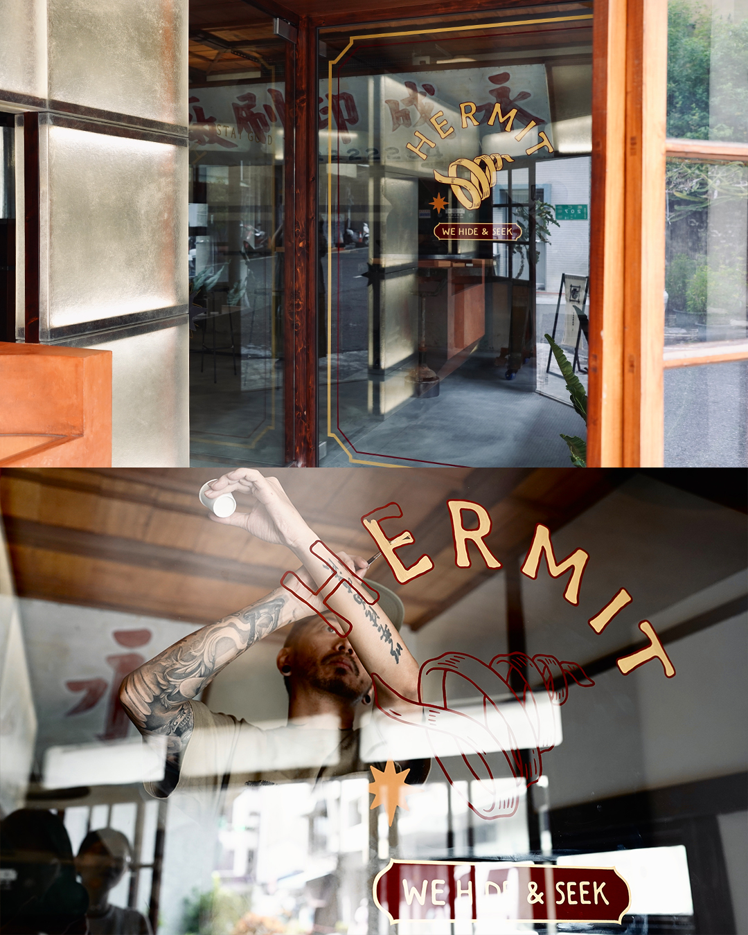 ✸ “HERMIT”有寄居蟹之意,這個空間像時間沖刷走歷史卻沒被帶走的殼,深埋在細沙裡靜待被尋回。⽽HERMIT也像⼀位隱⼠,低調佇立在單⾏巷弄轉⾓,⽊頭窗框透出澄黃的燈光,沒有張揚的牌招,這裡更像是和城市玩起捉迷藏的隱⾝之處;木更、彡苗、本事此次以「窺探」概念開啟空間引⾔,互相拋出從平⾯、空間到材質的相異相會。