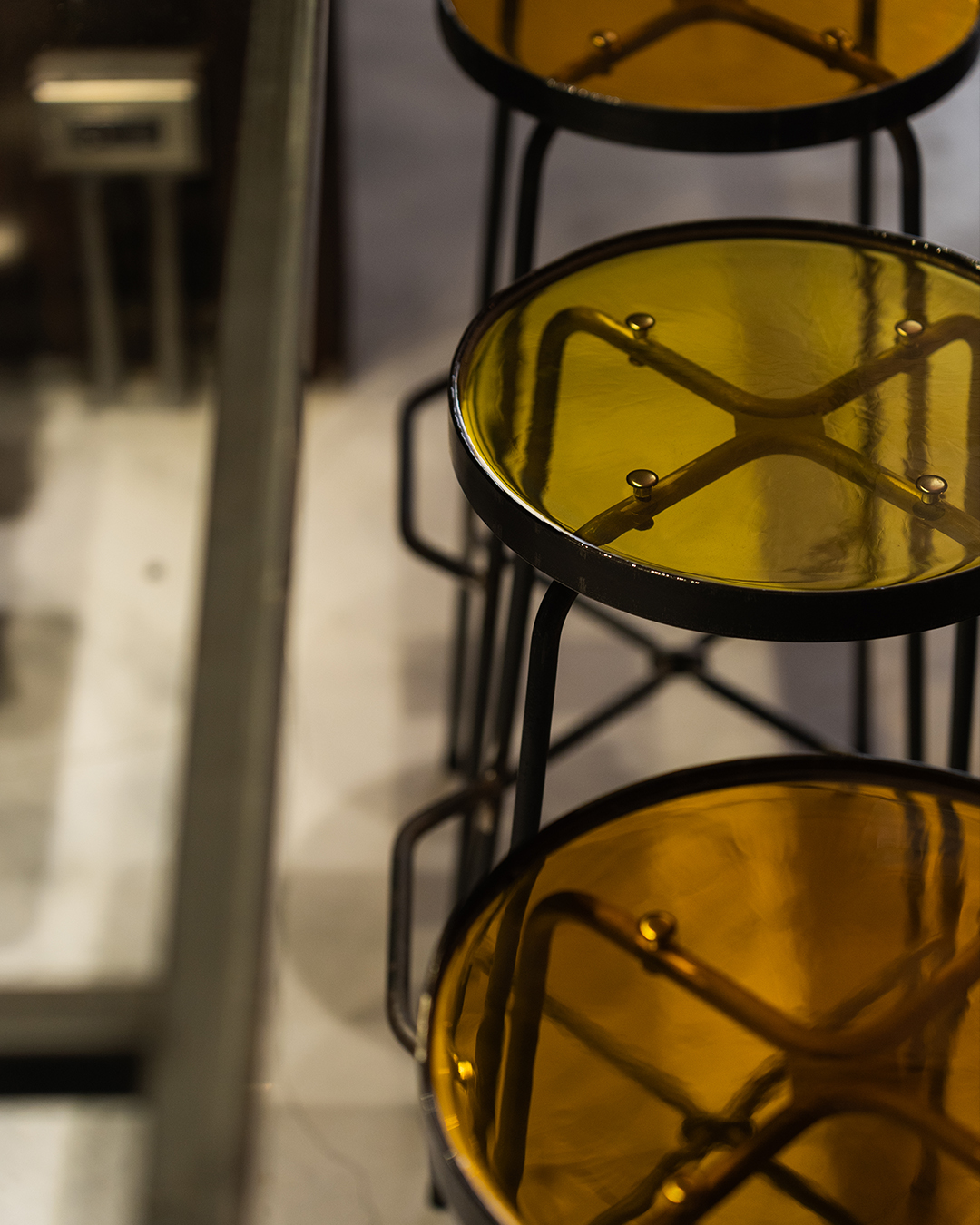 ✸ 店內以橘色結合深木色作為空間上的定調,搭配如黑鐵及鍍鋅材質等自然鏽蝕的表現,以及玻璃纖維和環氧樹酯自帶的半透明效果,回應在不同物件之上。如樹酯搭配黑鐵的高腳椅、實木搭配玻璃纖維的光牆、及鍍鋅配合清玻璃構成的中島座位…等,創造新舊材質混搭、若隱若現的平衡。