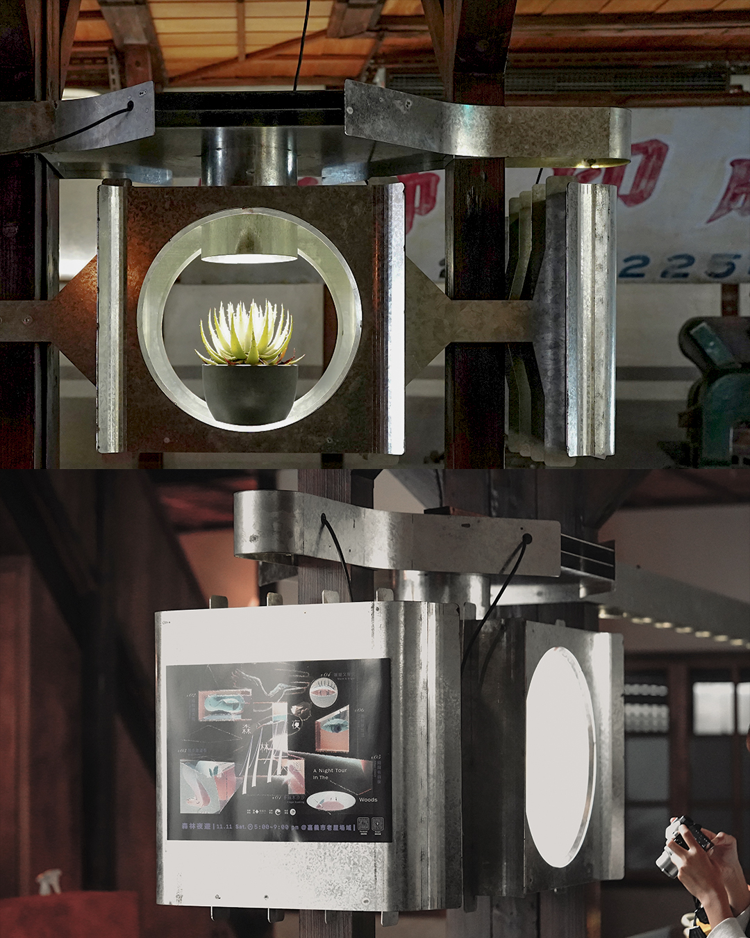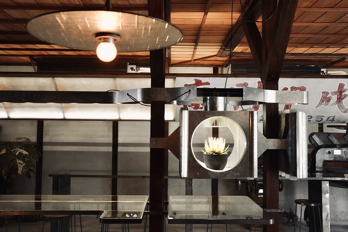 ✸ 空間中心以鍍鋅金屬及植栽作為與木更意象的連結,呼應早期印刷廠的記憶,機械感的金屬構件架接於老屋實木柱體,以燈具的形式串連被柱子分開的左右兩個場域,玻璃製成的吧檯桌面也隱隱約約反射映照出整個空間的樣態。