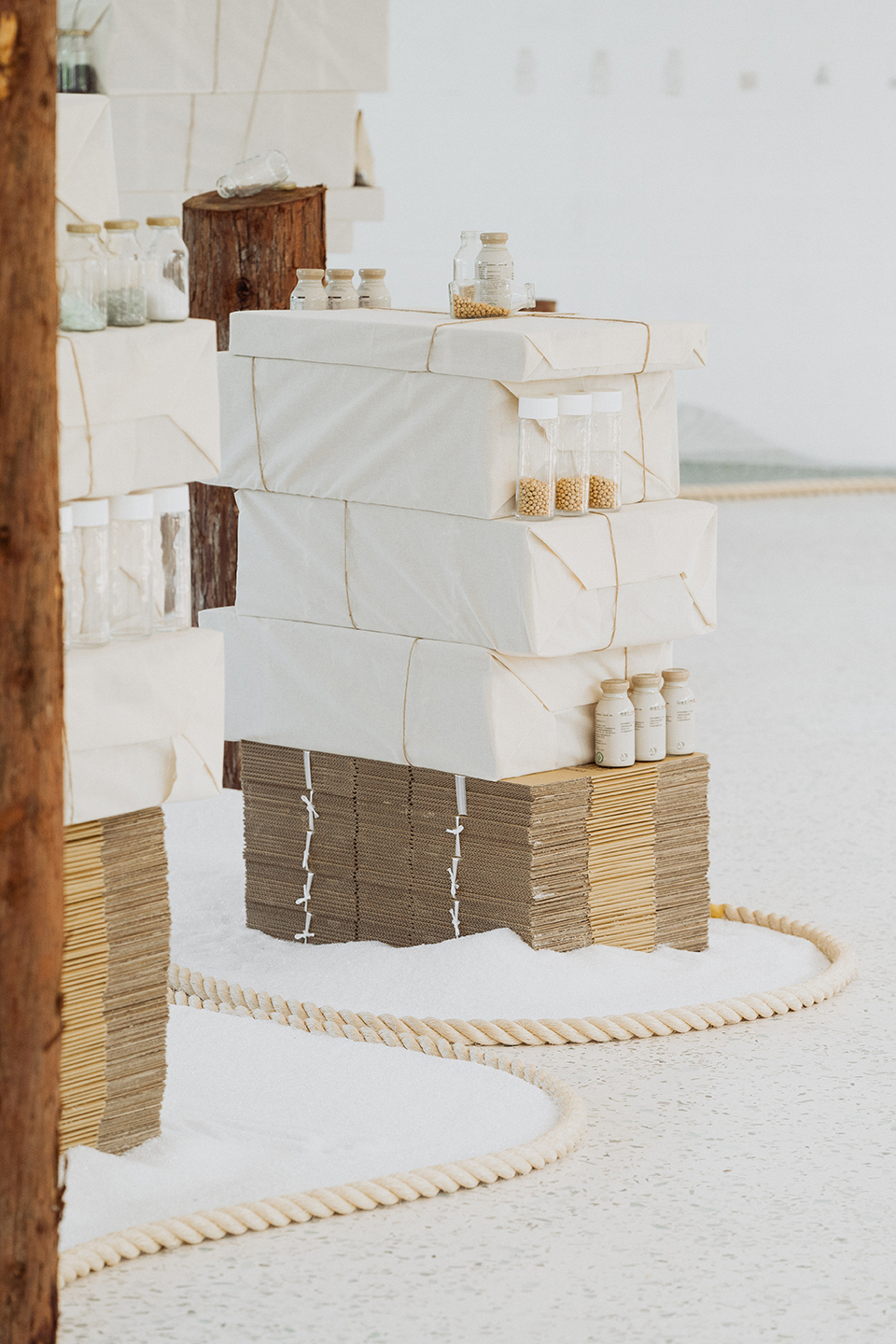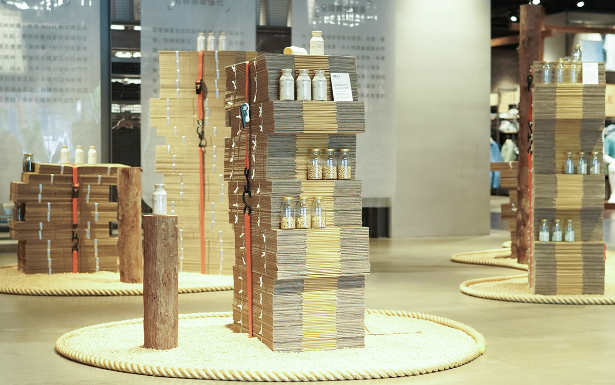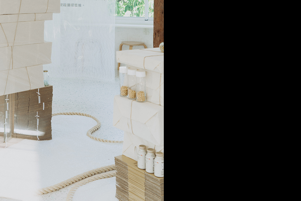 ②回應零廢棄精神:規劃99%可持續回歸再利用的展覽材料,我們在了解豆奶的供應系統後,開始分析每一個步驟中可能出現的資材,選取適合做為展覽構造的紙箱當作載體,層層堆疊後形成平台,在垂直狀的平台上陳列著構成這瓶豆奶的所有元素,更以供應鍊上既有的素材來構成展台及展品,減少加工製造及不必要的裝飾與浪費來完成這次的展場設計。