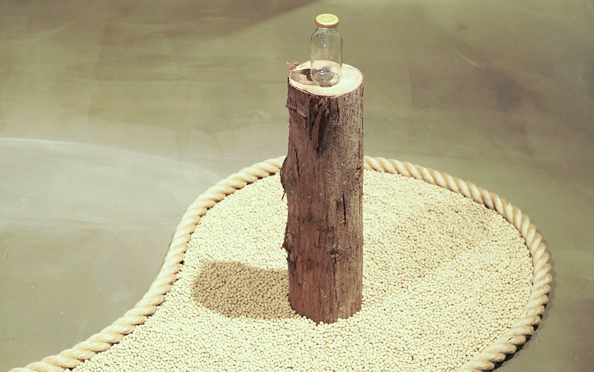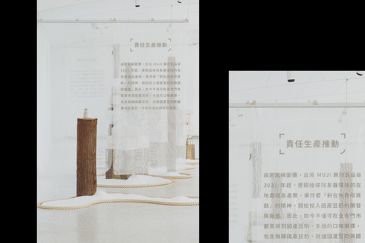 展覽將空間劃分為三區,第一區域位在展覽入口,以一根原始木材與一瓶烤地瓜豆奶的組合於展覽空間裡第一個畫面呈現出最純粹的狀態,後方透過玻璃纖維網創造出模糊不清且若隱若現的空間介面,勾起“Something Behind”的觀展好奇心,開啟本次展覽主角—“MUJI 無印良品烤地瓜豆奶”的背後故事。