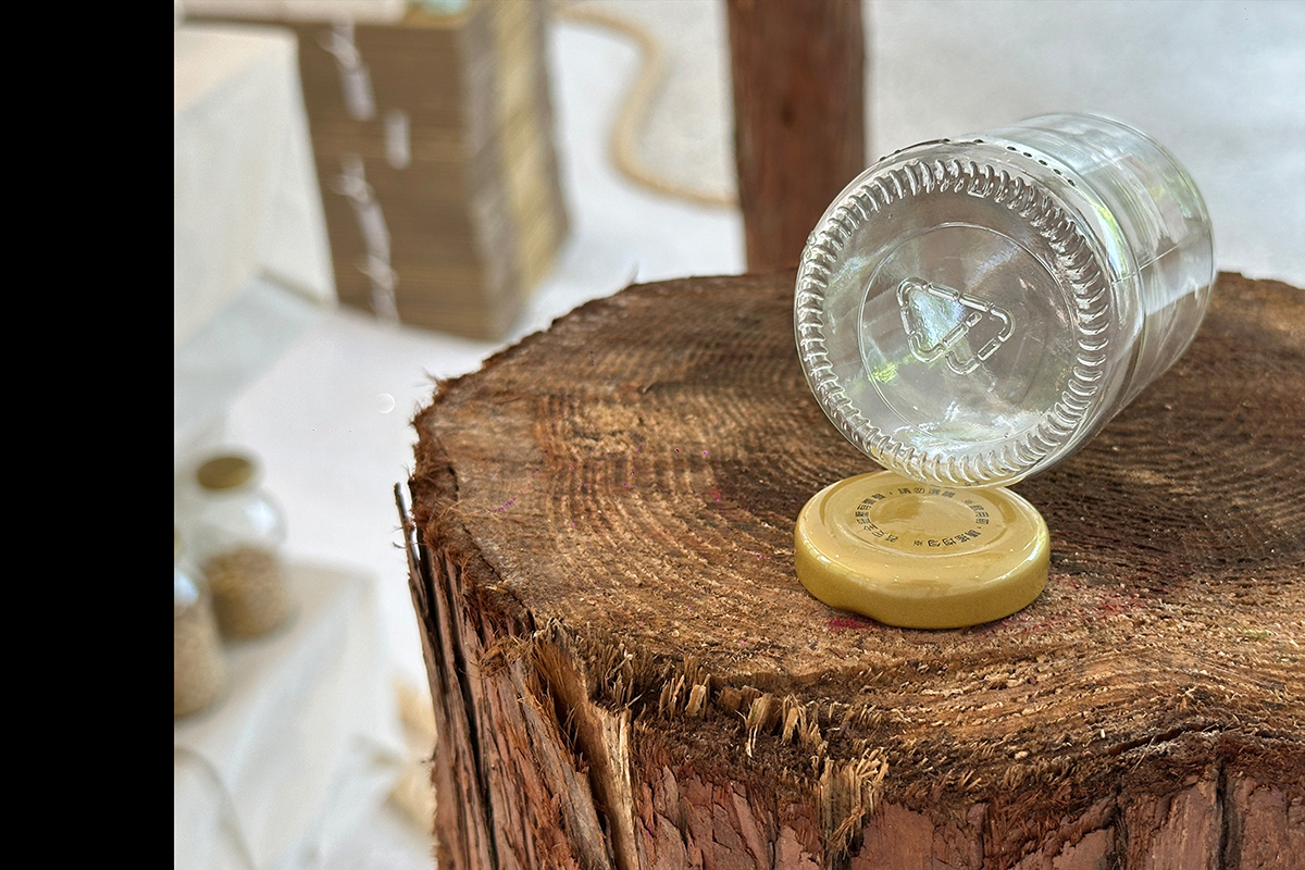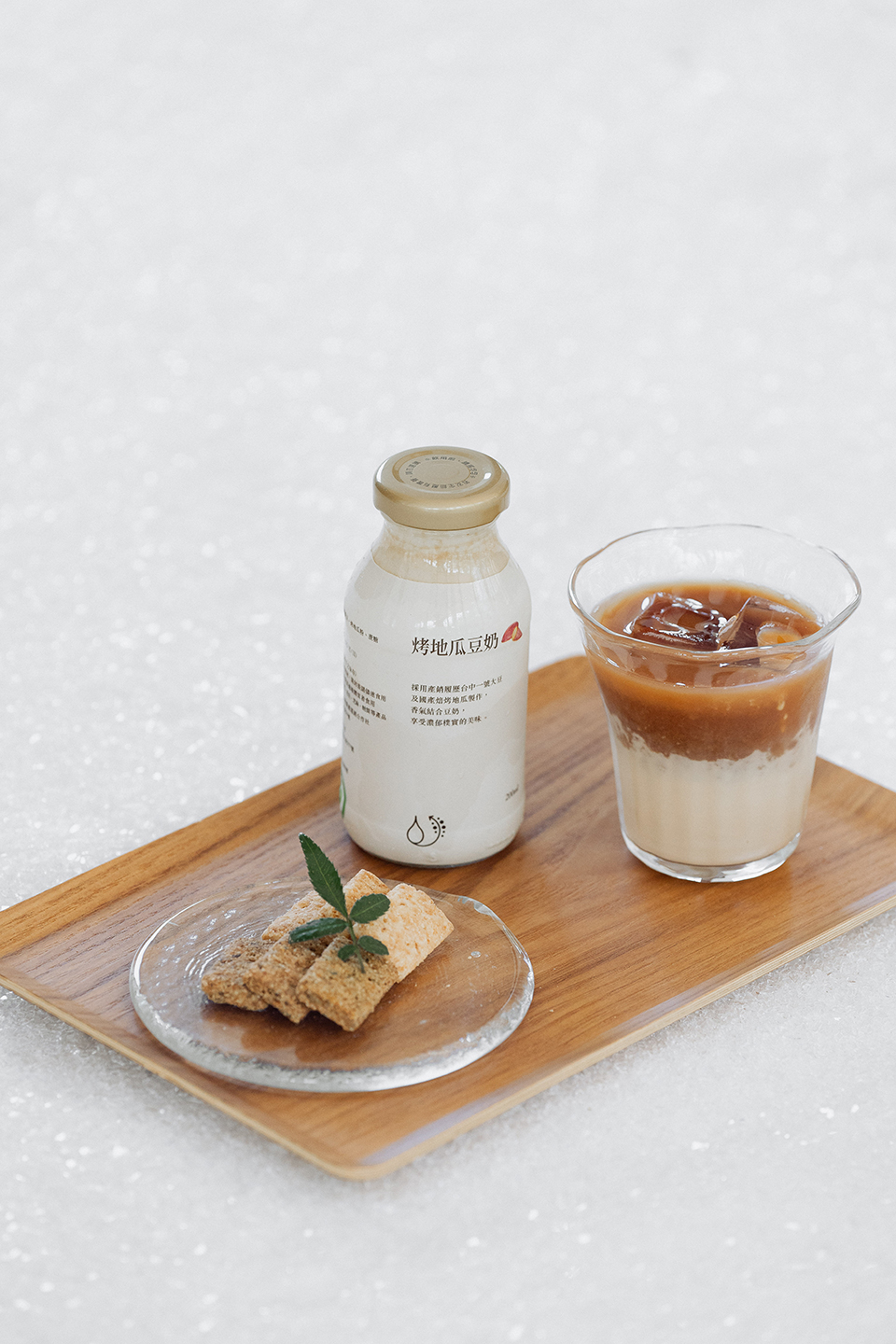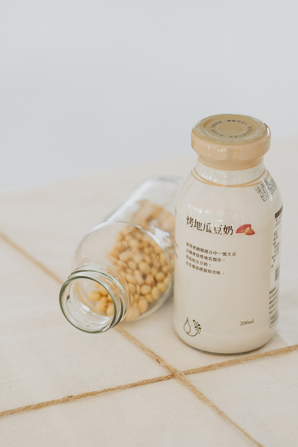 選用100%國產非基因改造的台中一號大豆及台農57號地瓜製作而成的烤地瓜豆奶, 結合台灣在地果香味的仙女紅茶,整體口感滑順、溫潤且無負擔;於展覽期間,持三只「國產烤地瓜豆奶」之廢棄玻璃瓶,至新竹春室 2F +P Store 回收,可獲得「展期限定 - 淺綠色玻璃幣」一枚(可用於兌換限定餐飲 - 烤地瓜豆乳紅茶 一份),邀請您一同為復育森林盡一份心力。