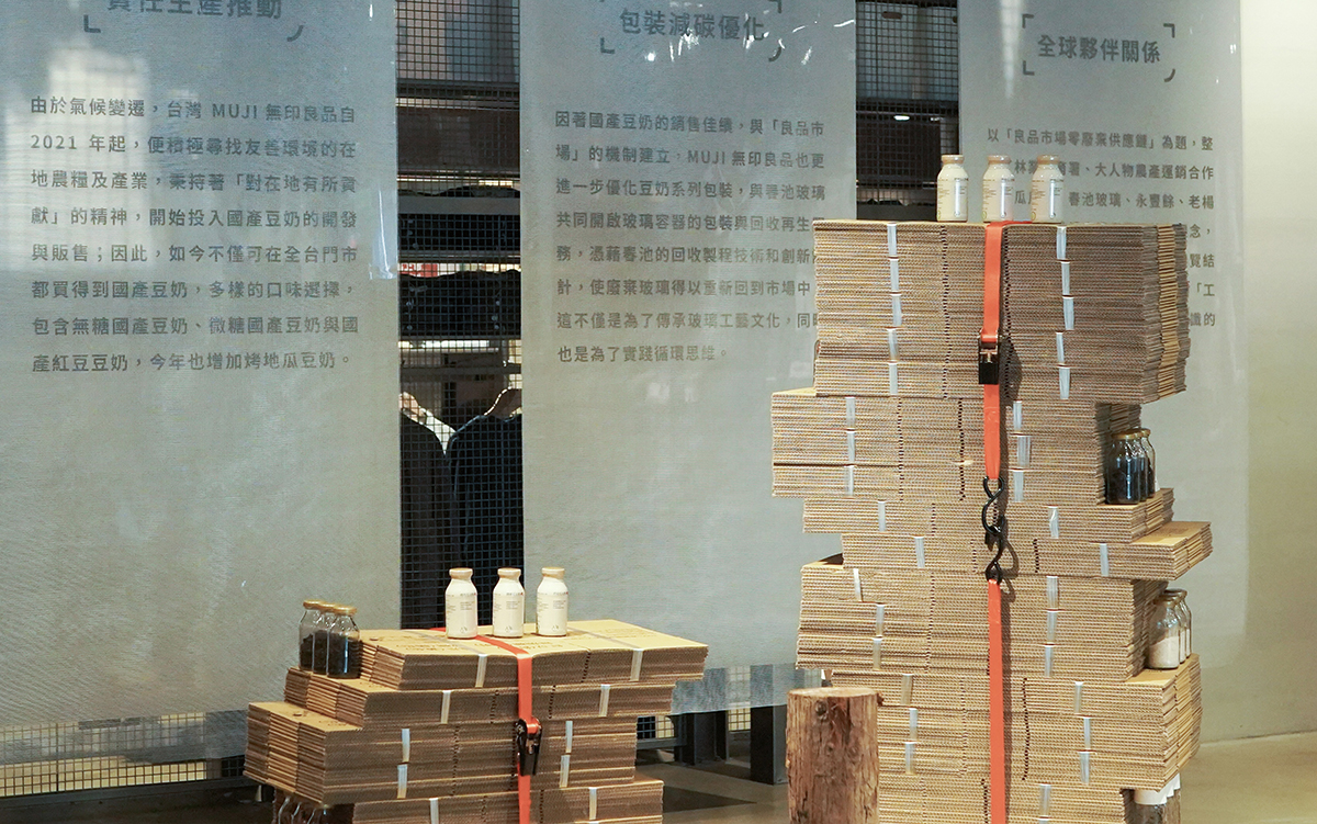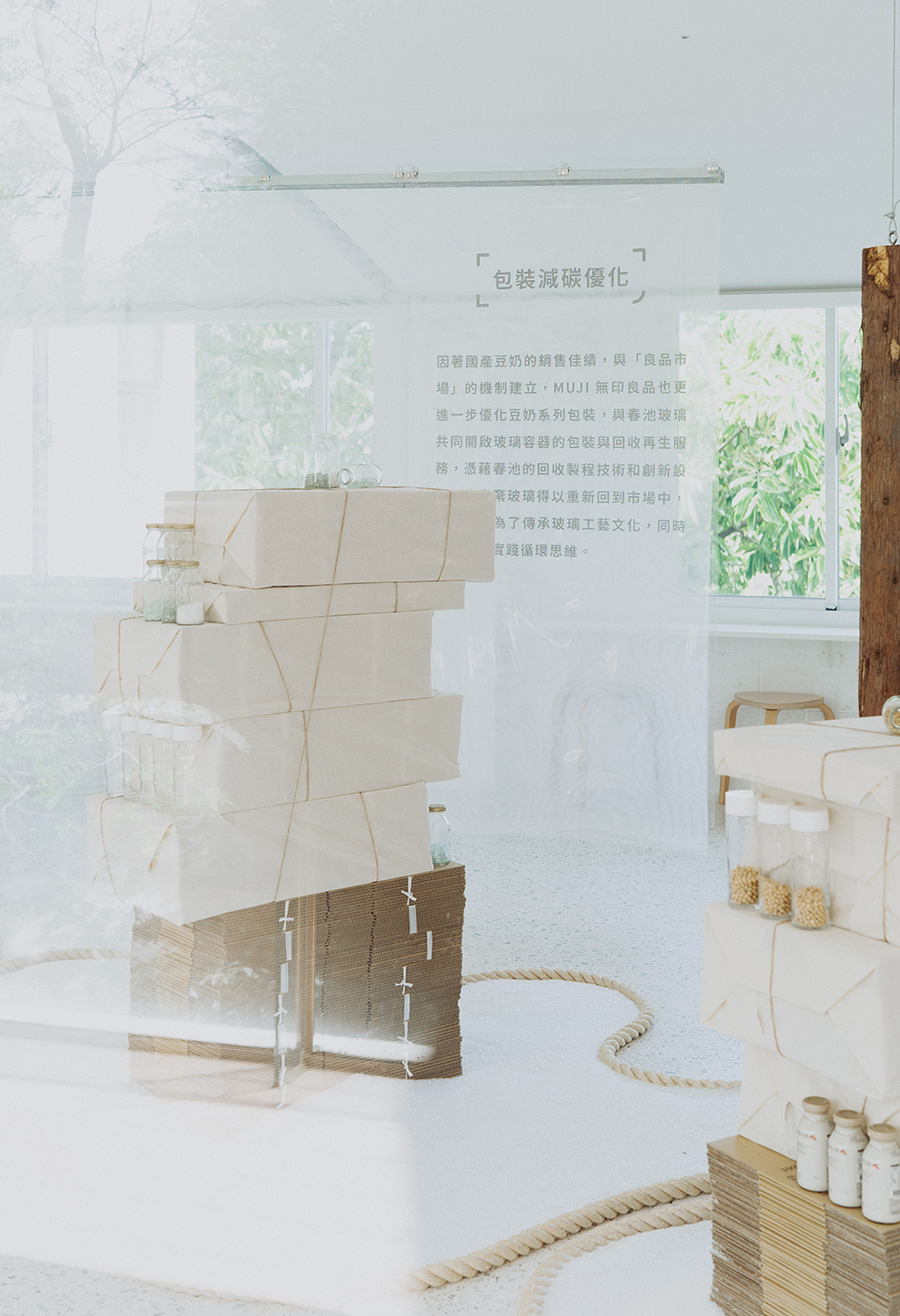 由於氣候變遷,MUJI 無印良品開始重視台灣的水資源與減碳議題,自2021年起便積極尋找友善環境的在地資源,抱持珍惜土地與永續生活的初衷,開始投入國產豆奶的生產與販售;在商品開發期間,對於再生素材與回收餘料的使用,也成為供應鏈中的一大考量,如何充分運用現有資源,實踐減碳與保育的目標,正與春池玻璃一直以來致力推動的循環行動理念不謀而合;因此,MUJI 無印良品與春池玻璃共同開啟玻璃容器的包裝與回收再生服務,憑藉春池本身的回收、製程技術和創新設計,進一步優化豆奶系列包裝,使廢棄玻璃得以重新回到市場中,強化產品歷程的循環實踐,鼓勵更具永續思維的責任消費。